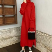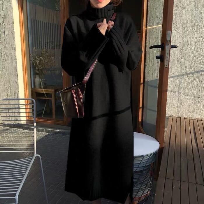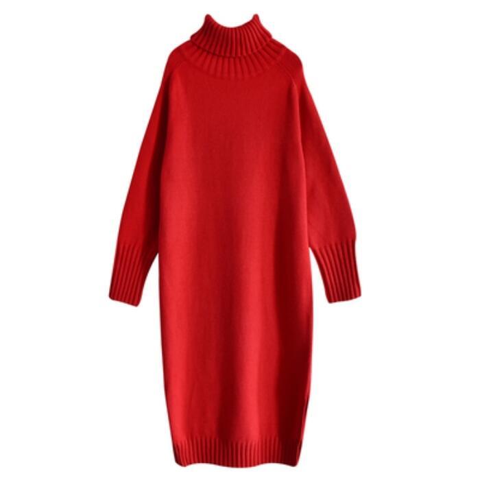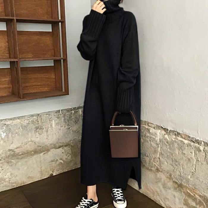 全2種3色 大きいサイズ シンプルレイヤード ワンピース ニット ロングワンピ タートルネック 袖あり ミモレ丈 ロング丈 きれいめ レディース ワンピ ドレス カジュアル 大人可愛い 体系カバー ゆったり リラックス カーキ レッド 赤 ブラック 黒 春 秋 冬 20代 30代 40代 50代