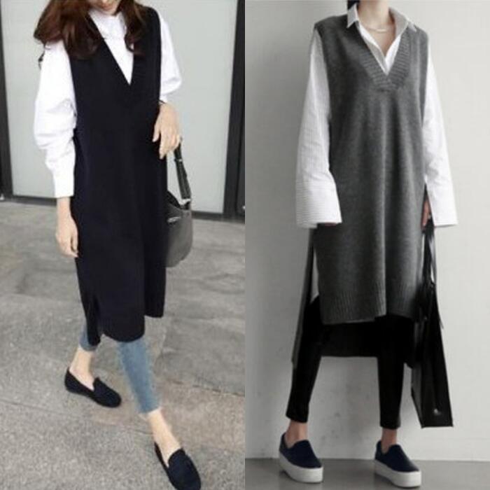 全2色 レイヤード ベスト ニット ワンピース ロングワンピ ロングベスト ノースリーブ ミモレ丈 Vネック きれいめ レディース ワンピ ドレス カジュアル 大人可愛い ゆったり シンプル グレー ブラック 黒 春 秋 冬 20代 30代 40代 50代