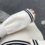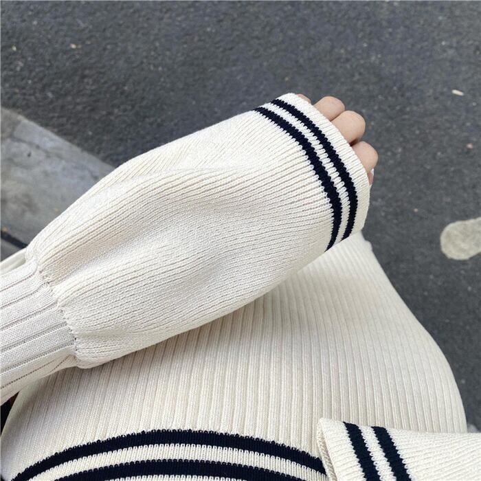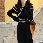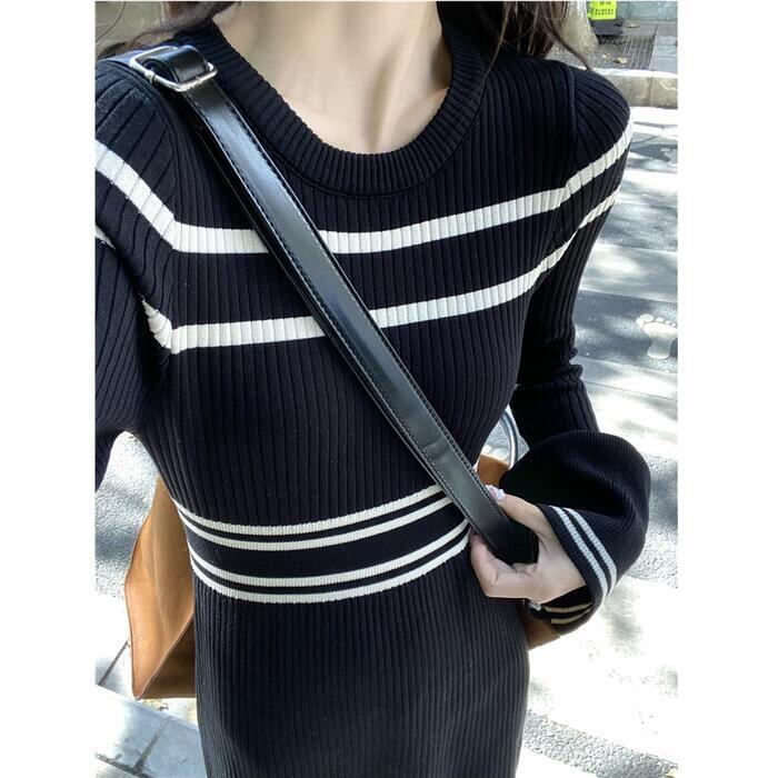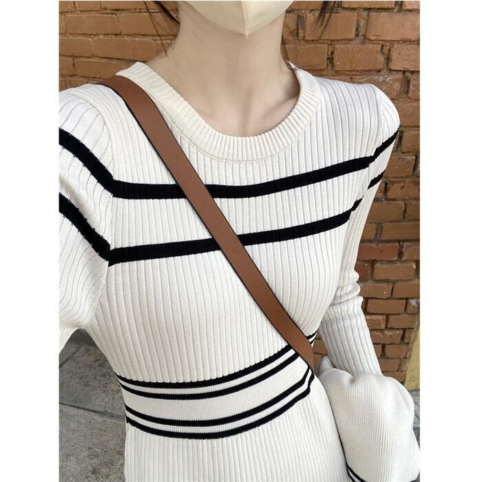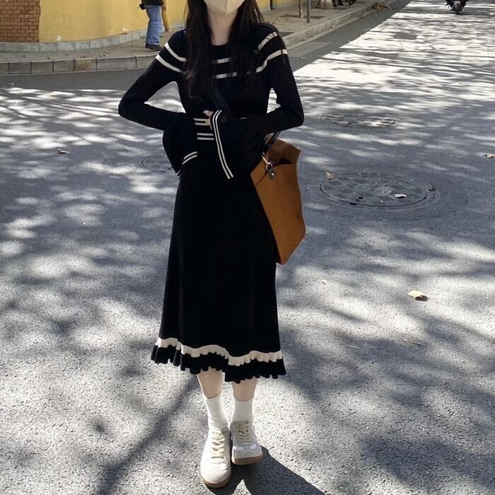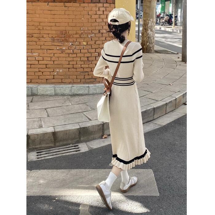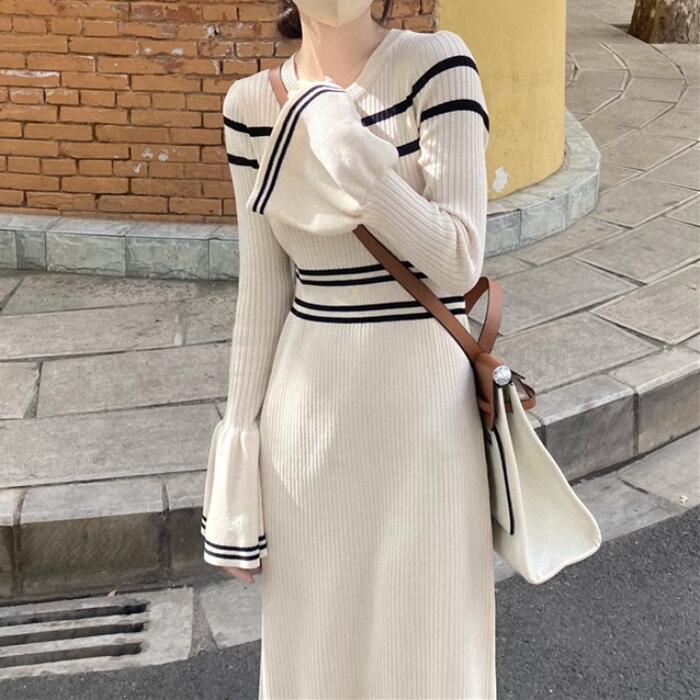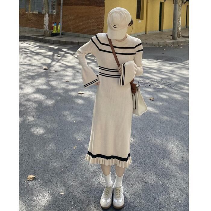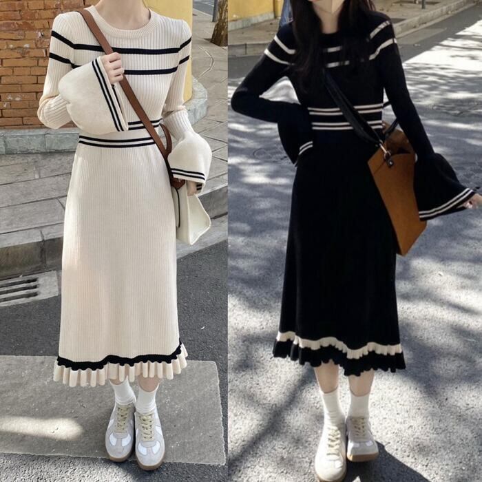全2色 ニット ワンピース ロングワンピ フレアスリーブ ミモレ丈 フリル きれいめ レディース ワンピ ドレス カジュアル 大人可愛い ボーダー Aライン フェミニン ハイウエスト ベージュ ブラック 黒 春 秋 冬 20代 30代 40代 50代