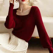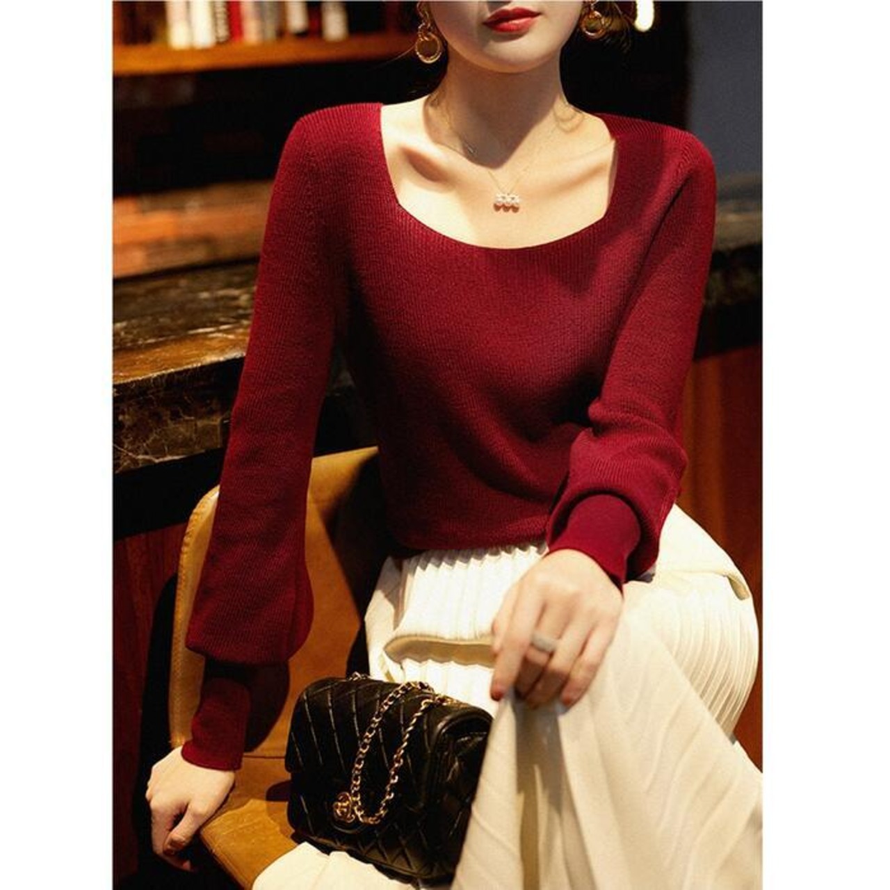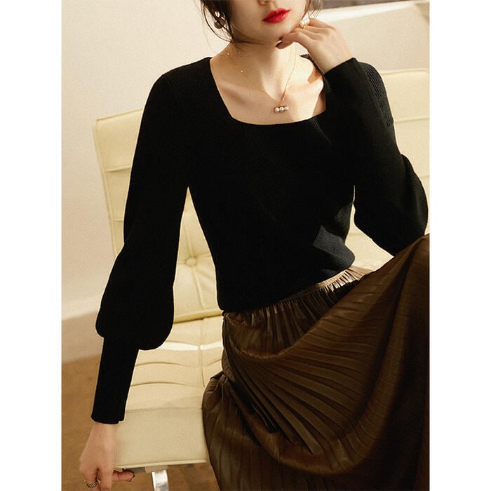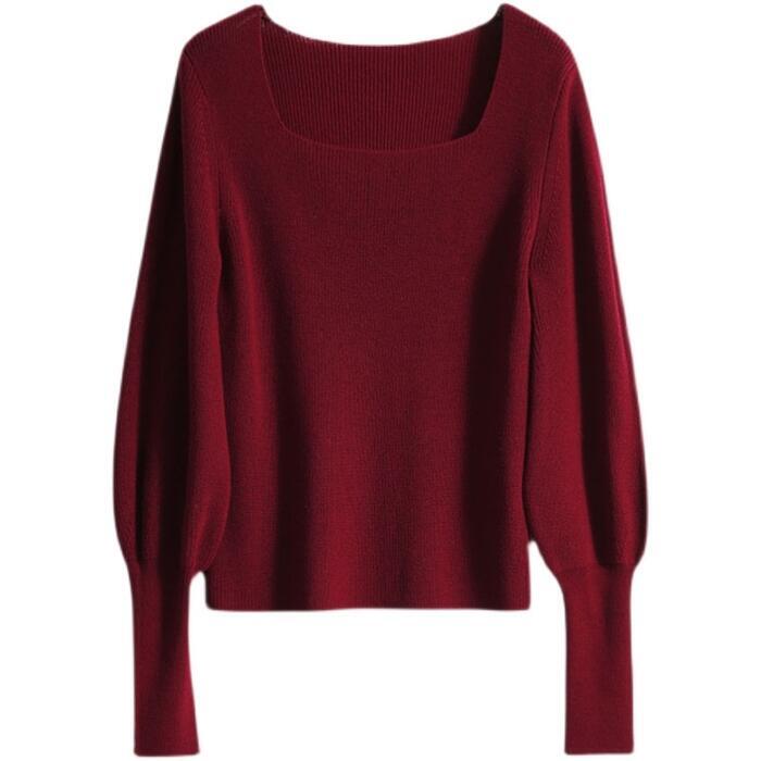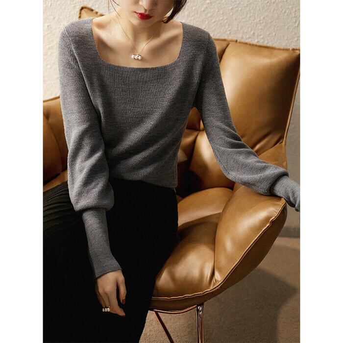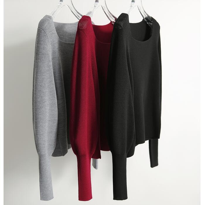 全3色 大きいサイズトップス ニット カットソー セーター スクエアネック パフスリーブ レディース カジュアル おしゃれ フェミニン 大人可愛い きれいめ クラシカル 長袖 こなれ感 シンプル レッド 赤 ブラック 黒 グレー 春 秋 冬 20代 30代 40代 50代