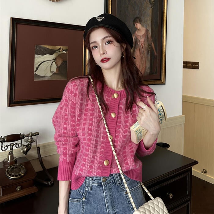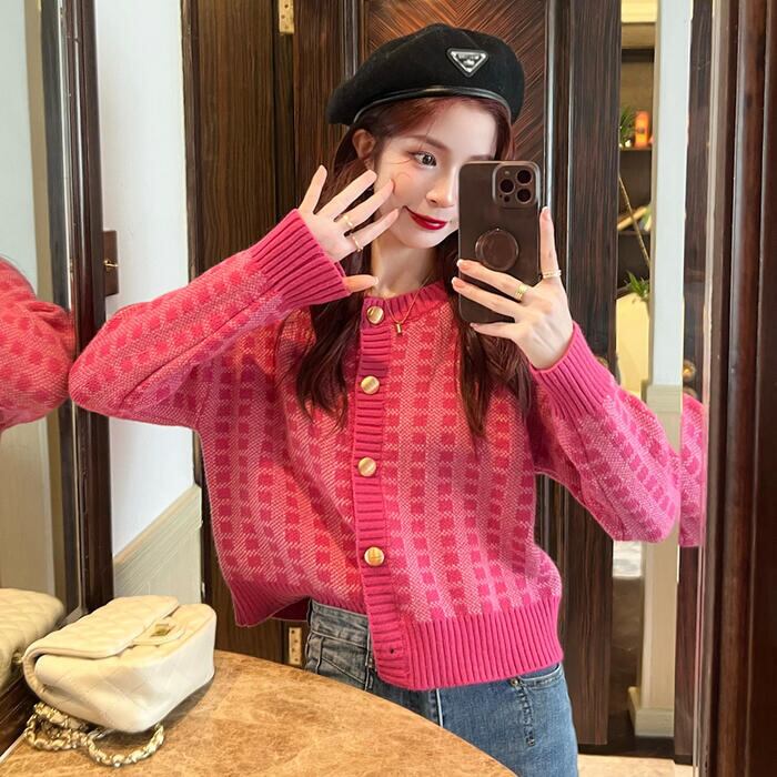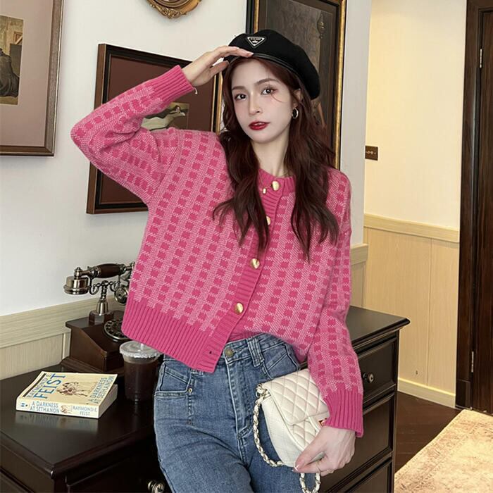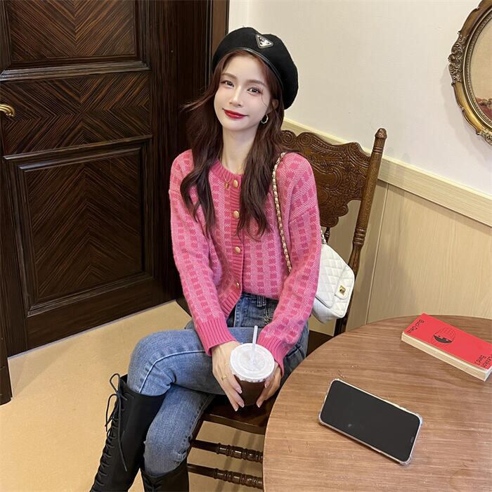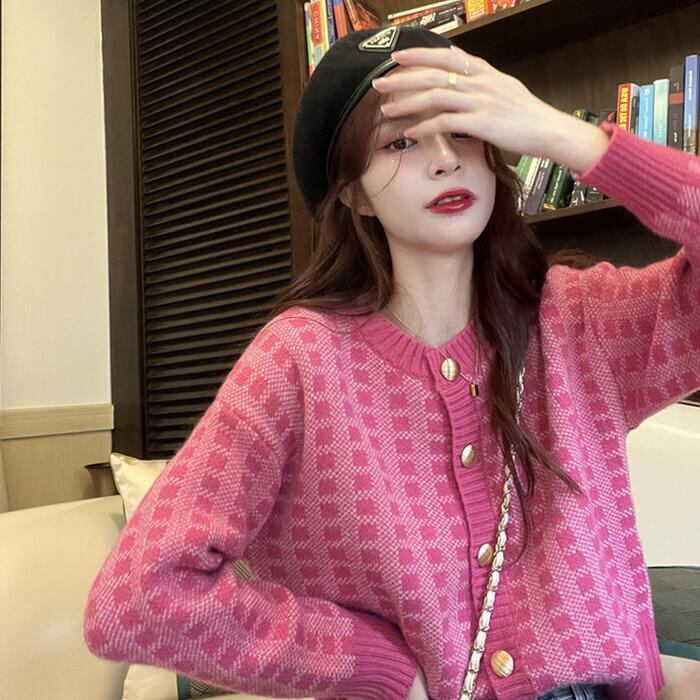 トップス ニット カーディガン セーター チェック 長袖 レディース カジュアル おしゃれ フェミニン 大人可愛い きれいめ シンプル 羽織 ガーリー ショート丈 韓国 キュート ピンク 春 秋 冬 20代 30代 40代 50代