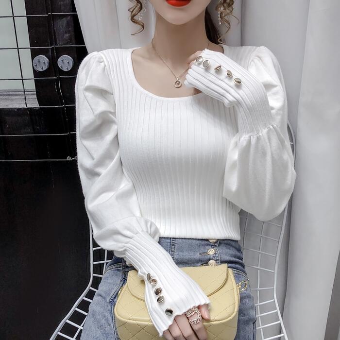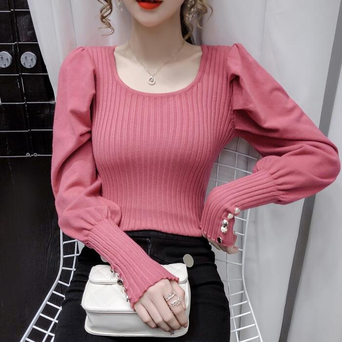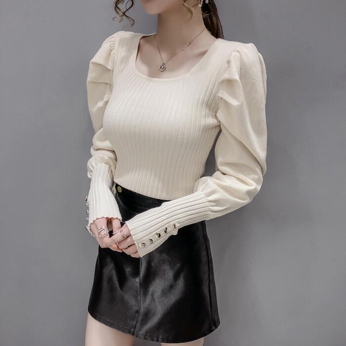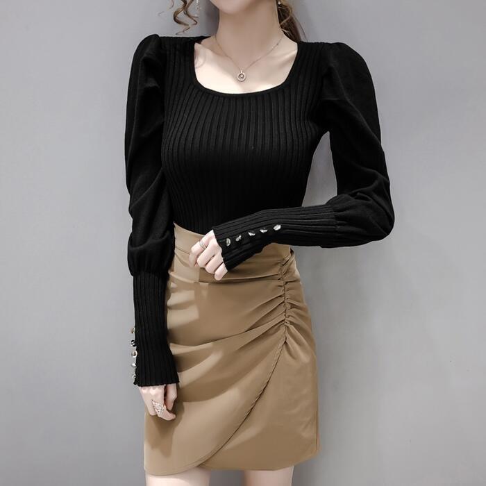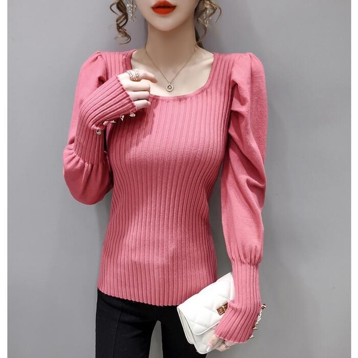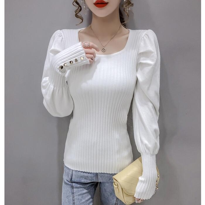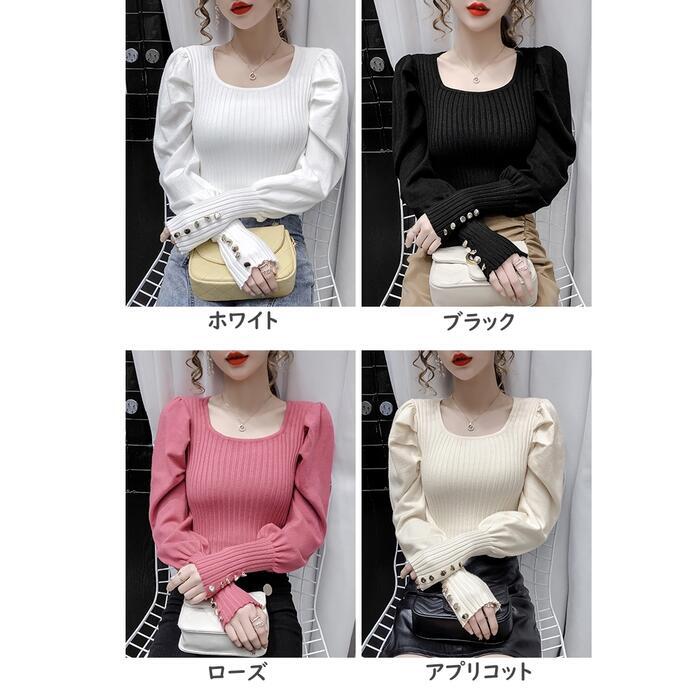 全4色 トップス ニット セーター カットソー スクエアネック パフスリーブ 長袖 レディース カジュアル おしゃれ フェミニン 大人可愛い きれいめ シンプル 韓国 タイト ホワイト 白 ブラック 黒 ベージュ ピンク 春 秋 冬 20代 30代 40代 50代