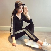 フード付きジャケットとパンツのセットアップ。