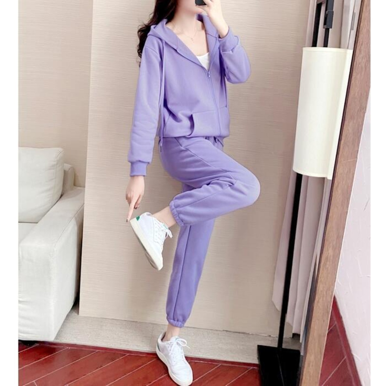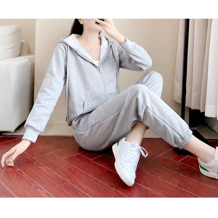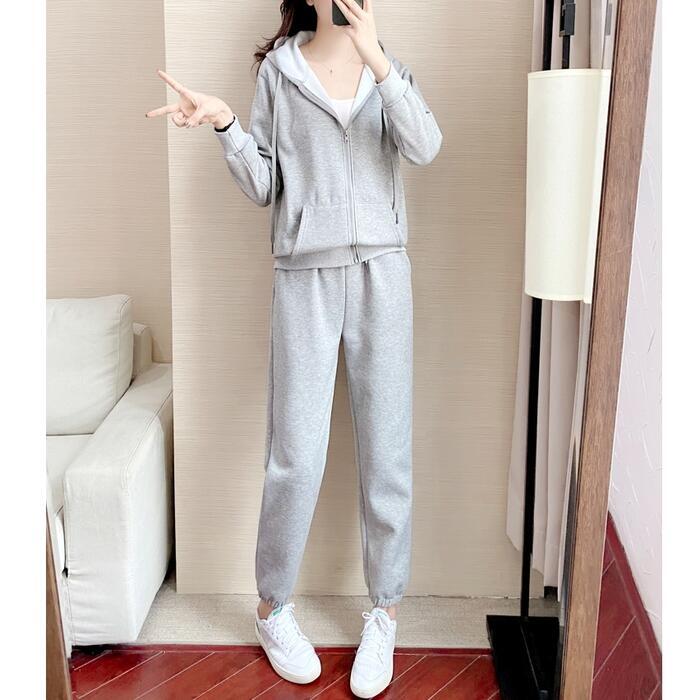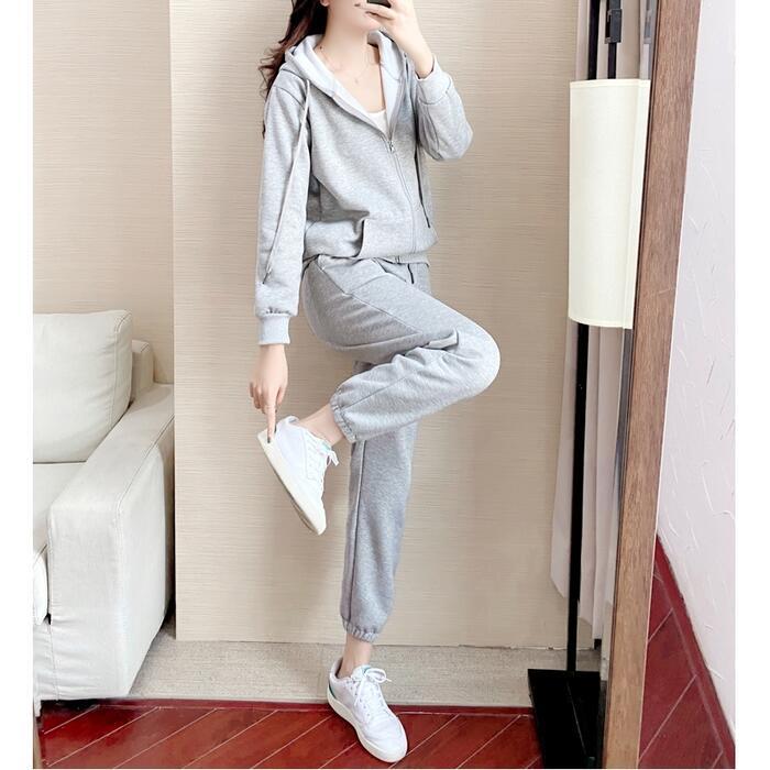 シンプルなデザインのスウェットパーカーとパンツのセットアップ。