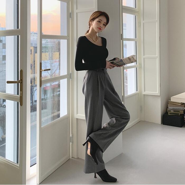 ハイウエストのパンツで脚長効果も抜群。