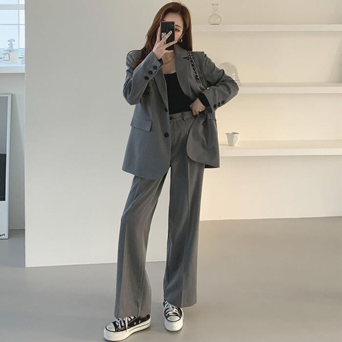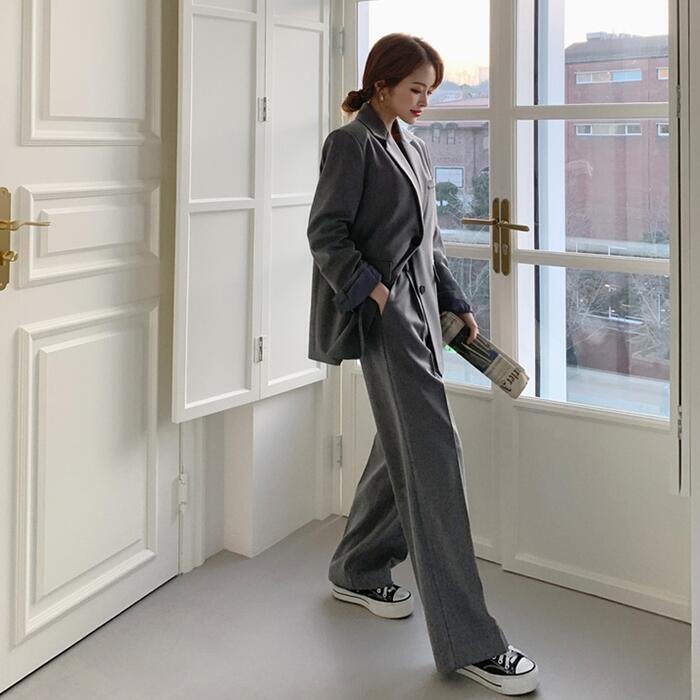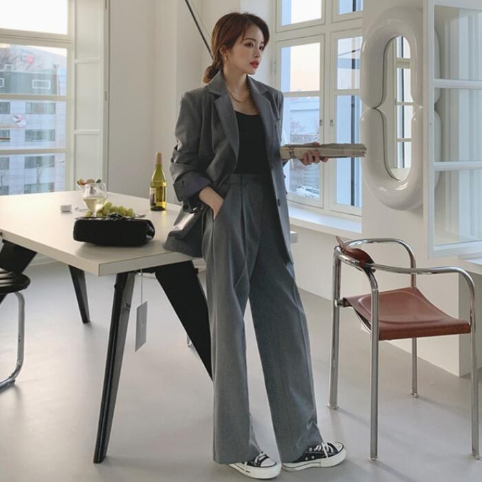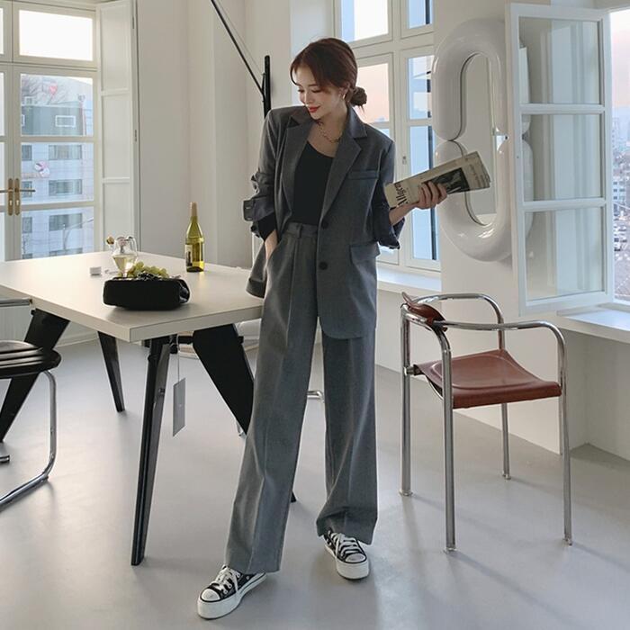 テーラードジャケットとワイドレッグパンツのセット。