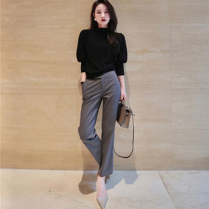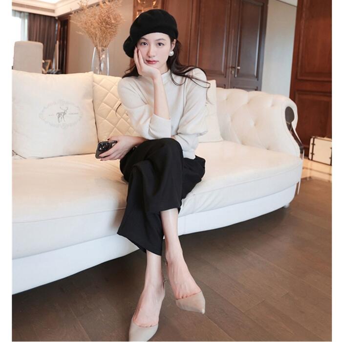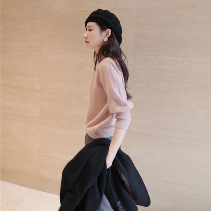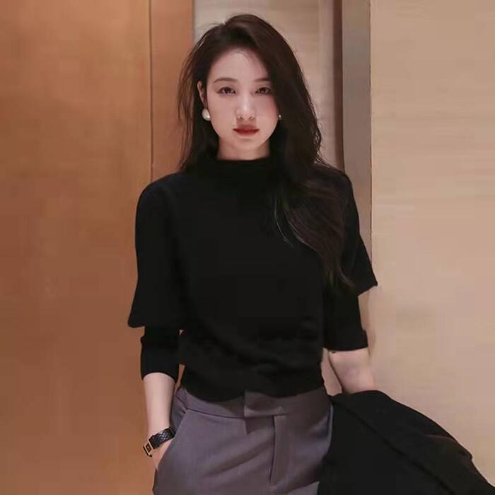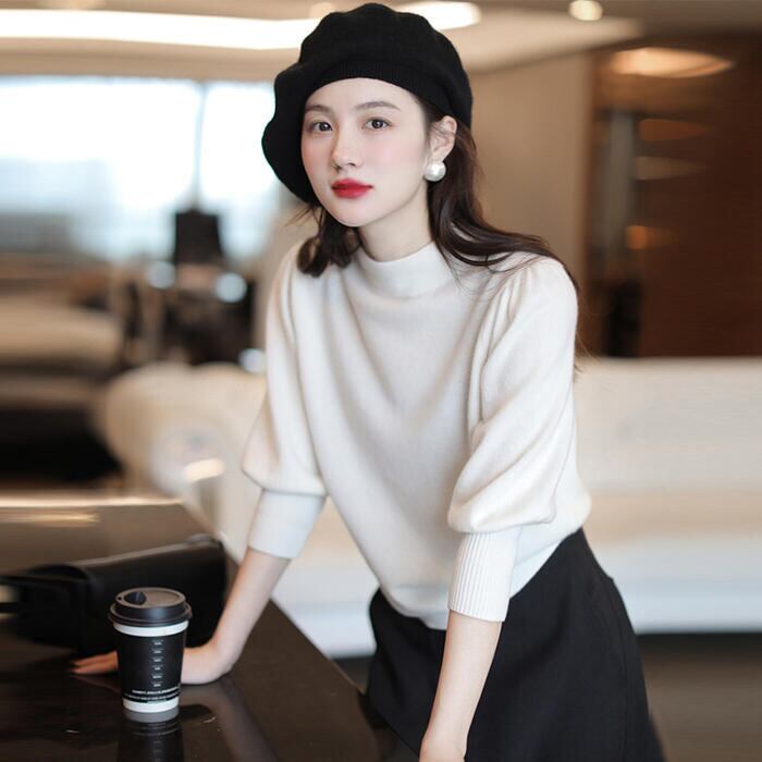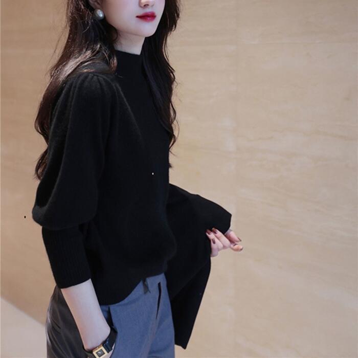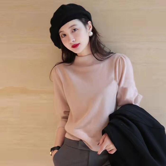 全3色 大きいサイズトップス ニット モックネック パフスリーブ セーター 七分袖 ハイネック レディース カジュアル おしゃれ フェミニン 大人可愛い きれいめ シンプル ベーシック ブラック 黒 ピンク ホワイト 白 春 秋 冬 20代 30代 40代 50代