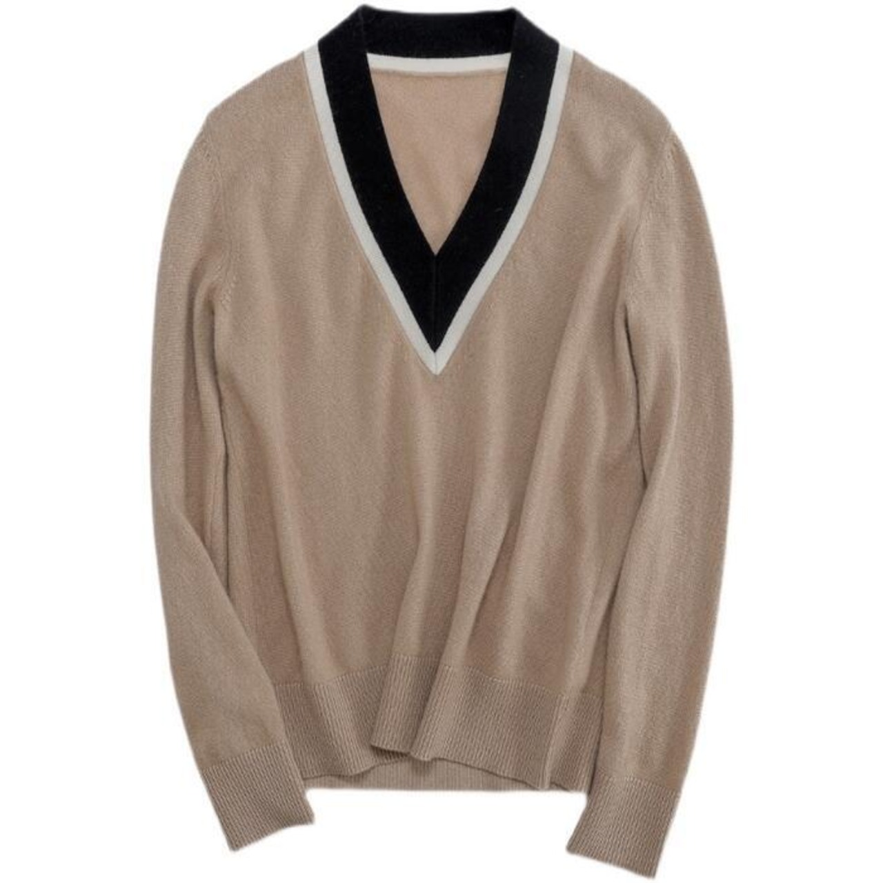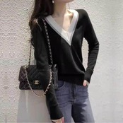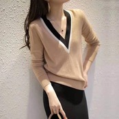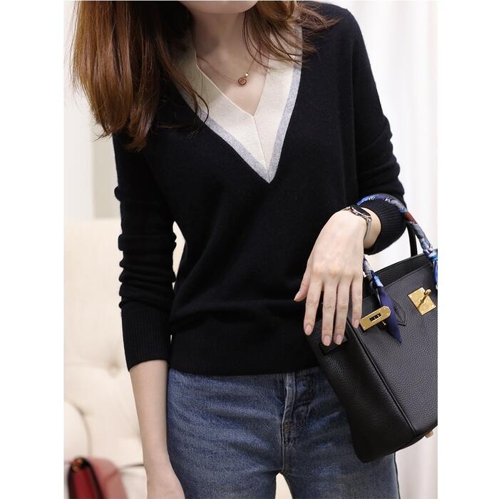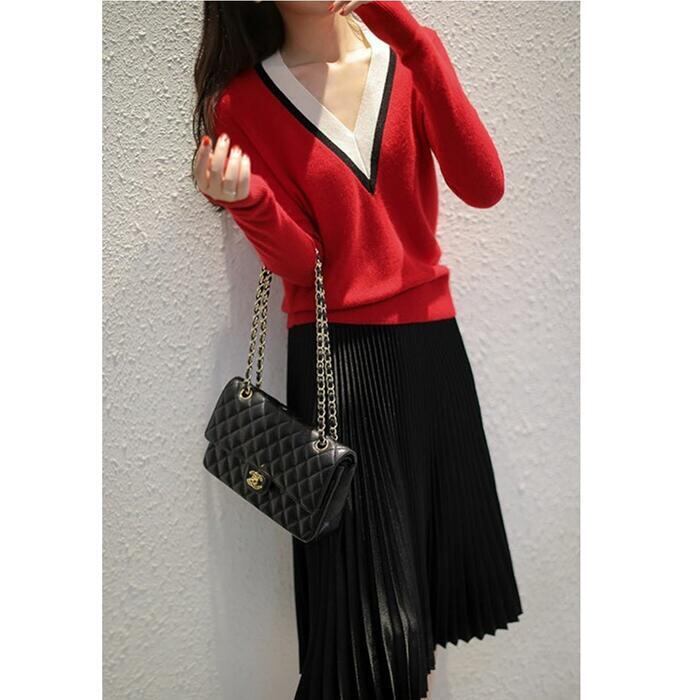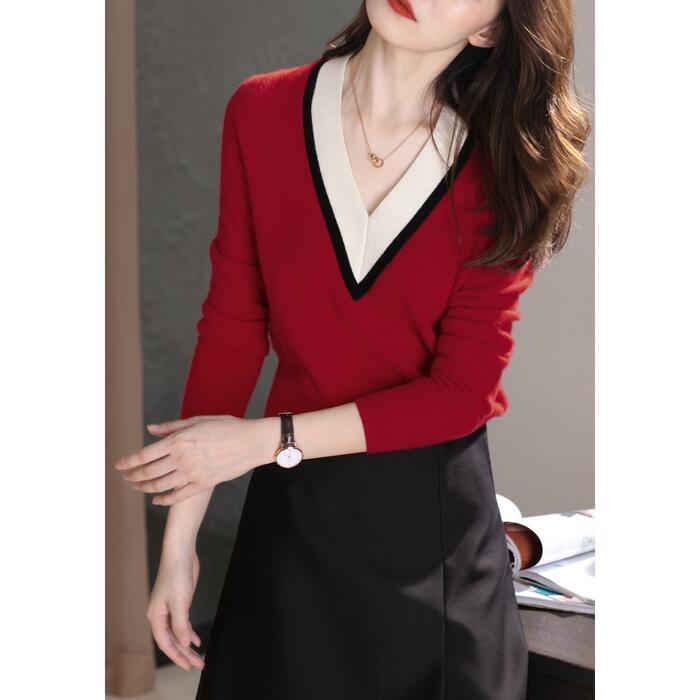 全3色 大きいサイズトップス ニット Vネック セーター 長袖 マルチカラー 配色 レディース カジュアル おしゃれ フェミニン 大人可愛い きれいめ シンプル ベーシック 通勤 オフィス レッド 赤 ブラック 黒 カーキ 春 秋 冬 20代 30代 40代 50代