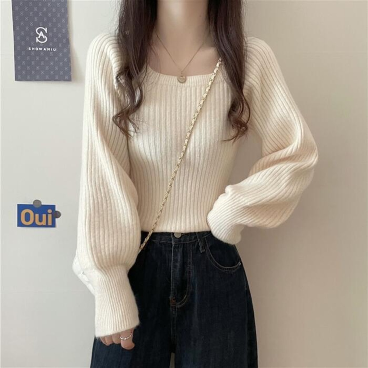 広めに開いたスクエアネックで顔周りをすっきり見せ。