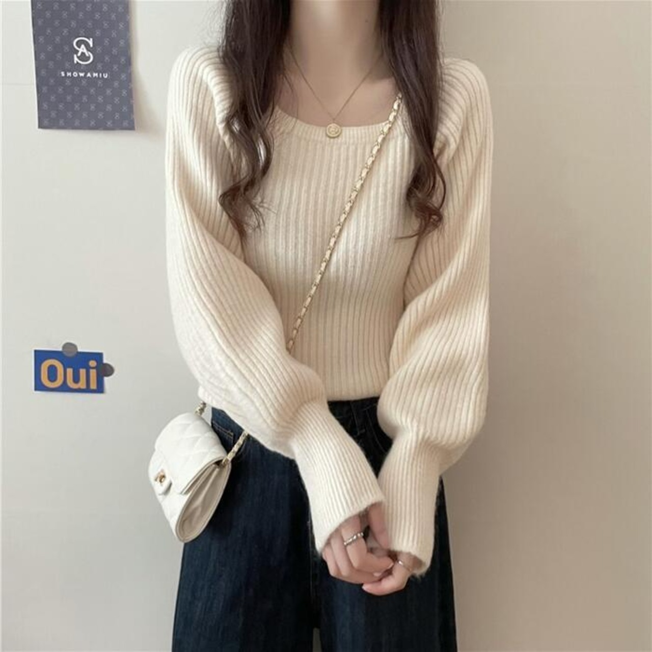 ふわっとしたパフスリーブが女性らしいリブニットトップス。