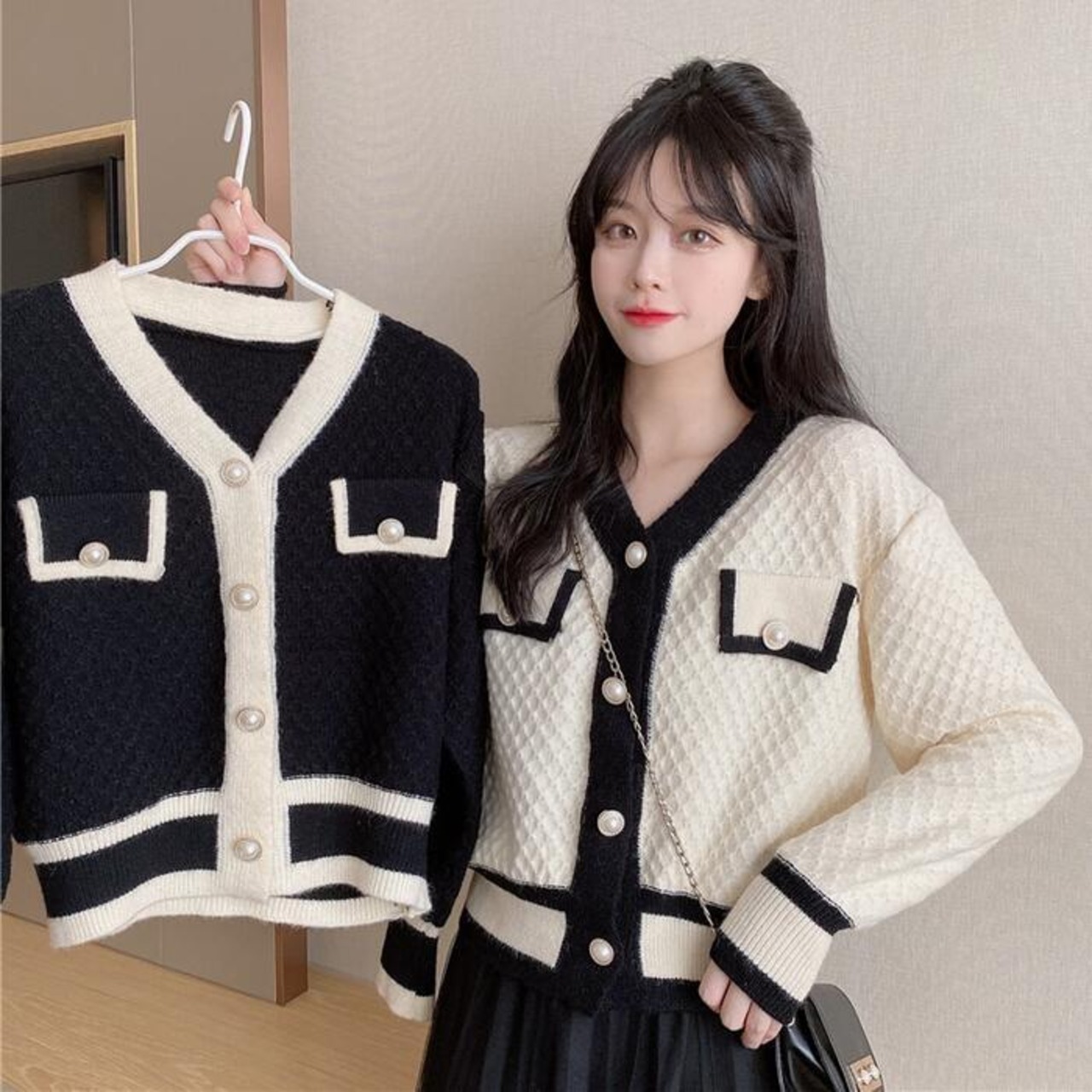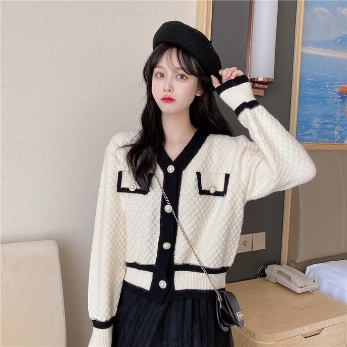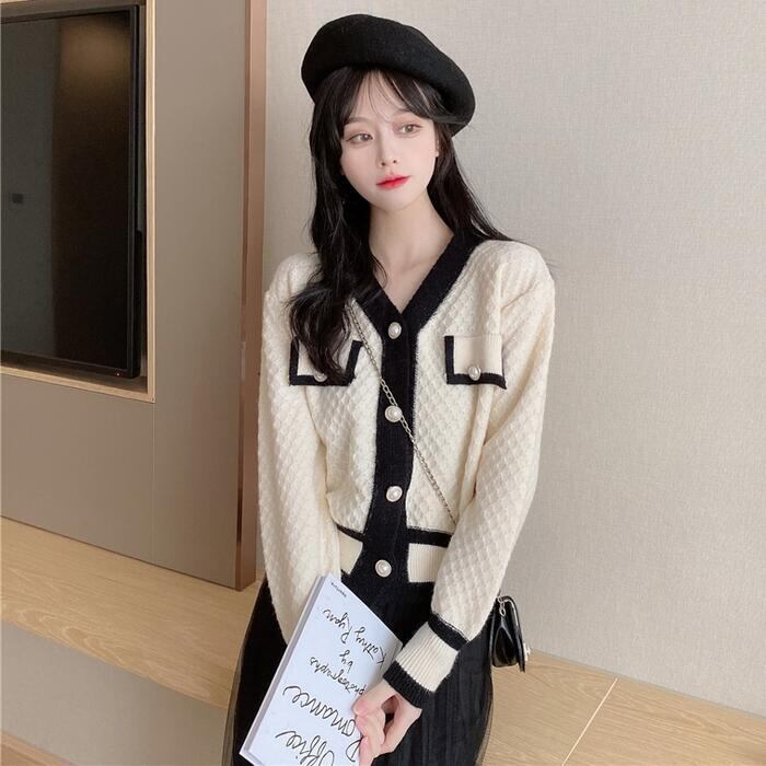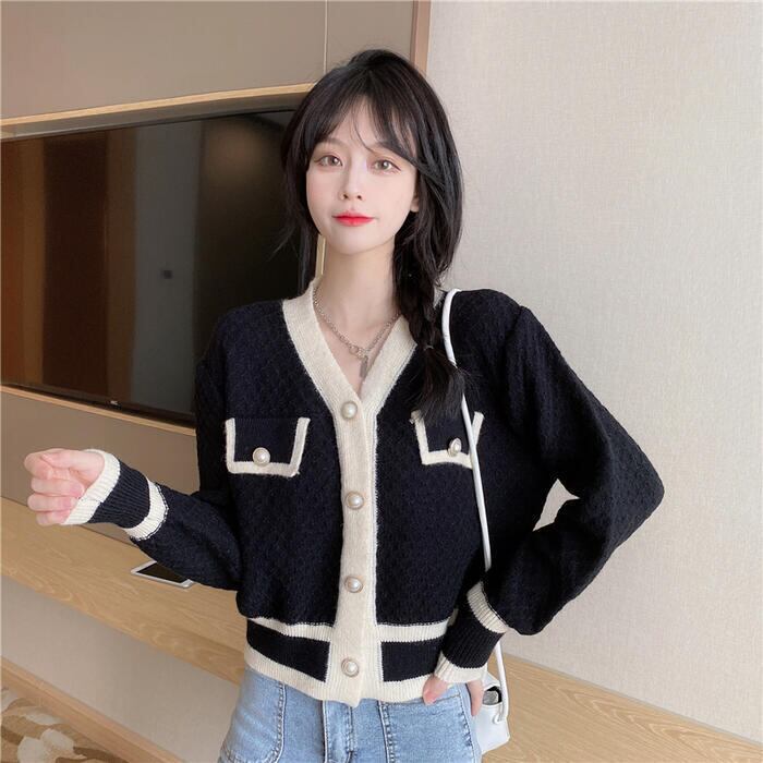 全2色 トップス ニット カーディガン Vネック セーター 長袖 ドロップショルダー バイカラー 配色 レディース きれいめ カジュアル おしゃれ フェミニン 大人可愛い シンプル ベーシック ゆったり 通勤 ベージュ ブラック 黒 春 秋 冬 20代 30代 40代 50代
