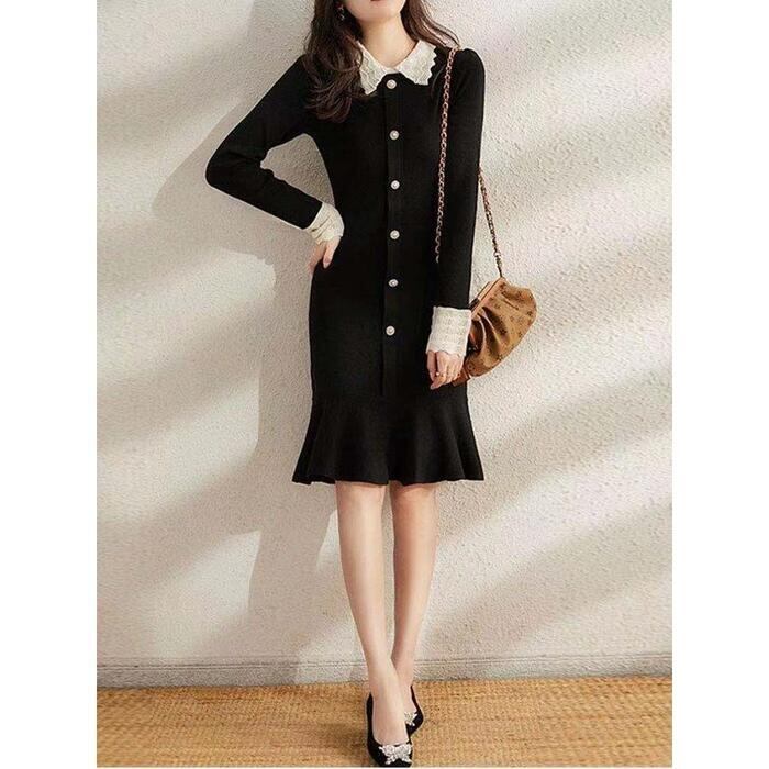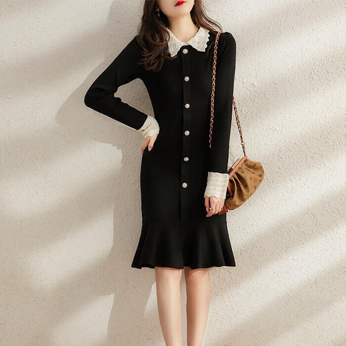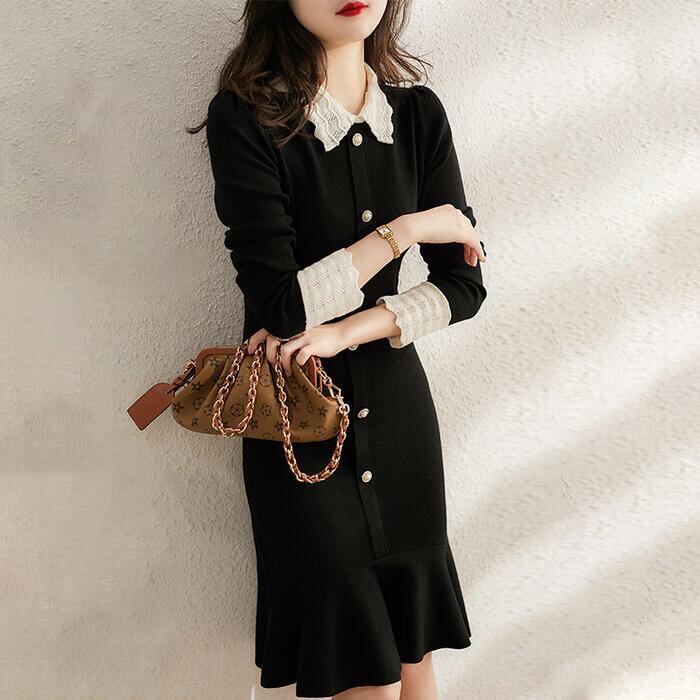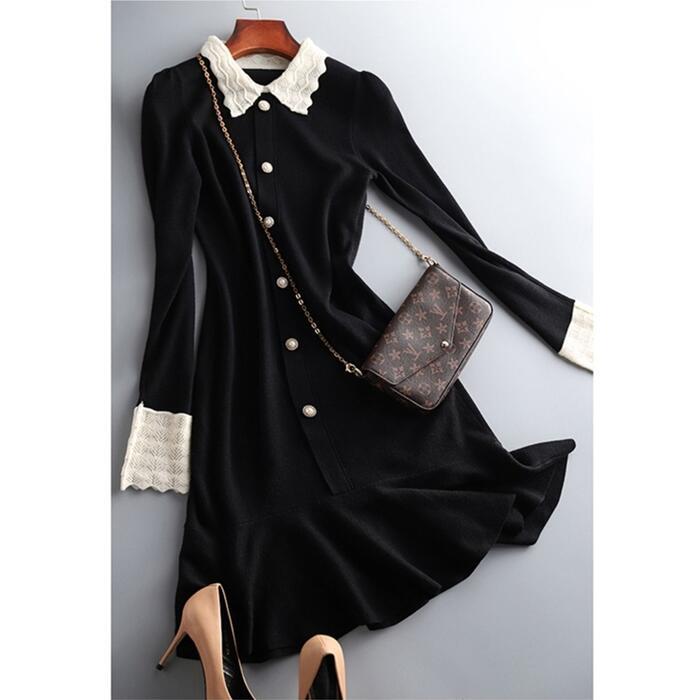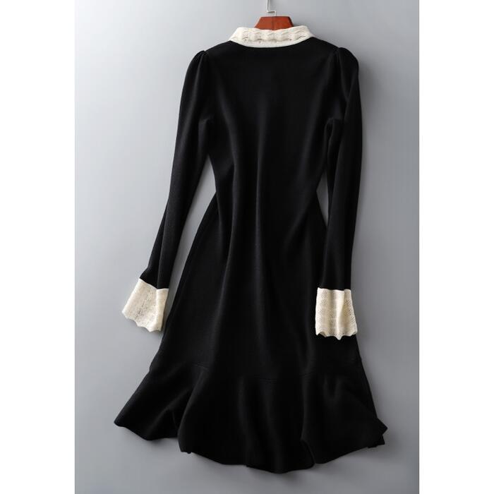 大きいサイズワンピース ニット ロングワンピ 袖あり ミモレ丈 フレア レース レディース ワンピ ドレス 長袖 きれいめ エレガント カジュアル 大人可愛い タイト フェミニン おしゃれ お呼ばれ 通勤 シンプル ブラック 黒 春 秋 冬 20代 30代 40代 50代
