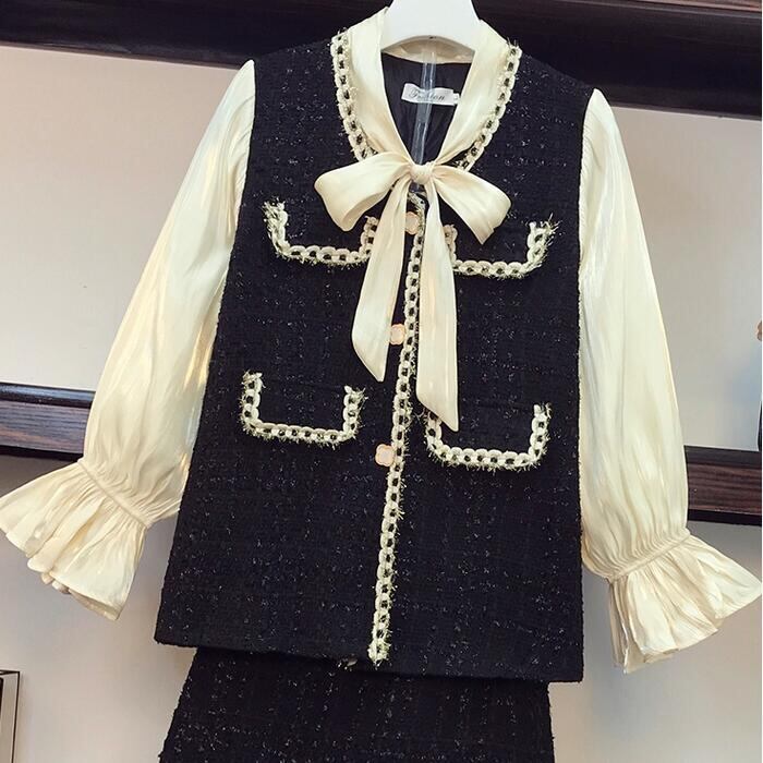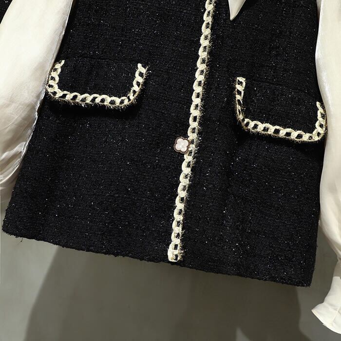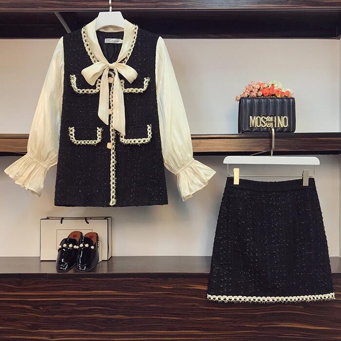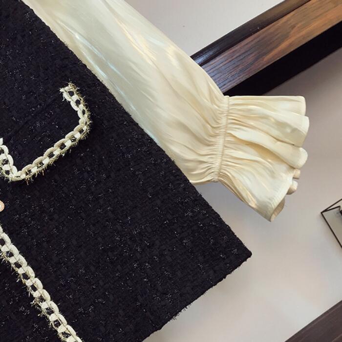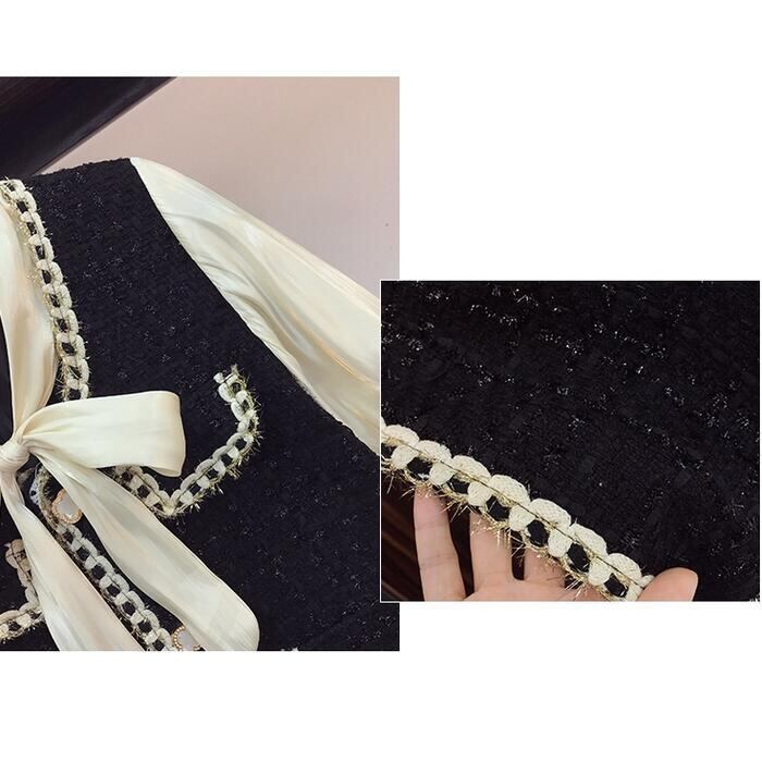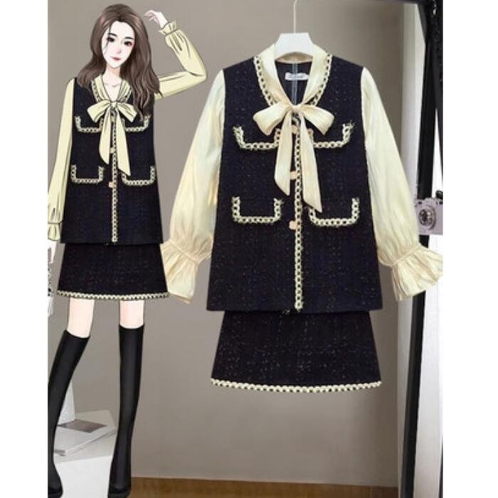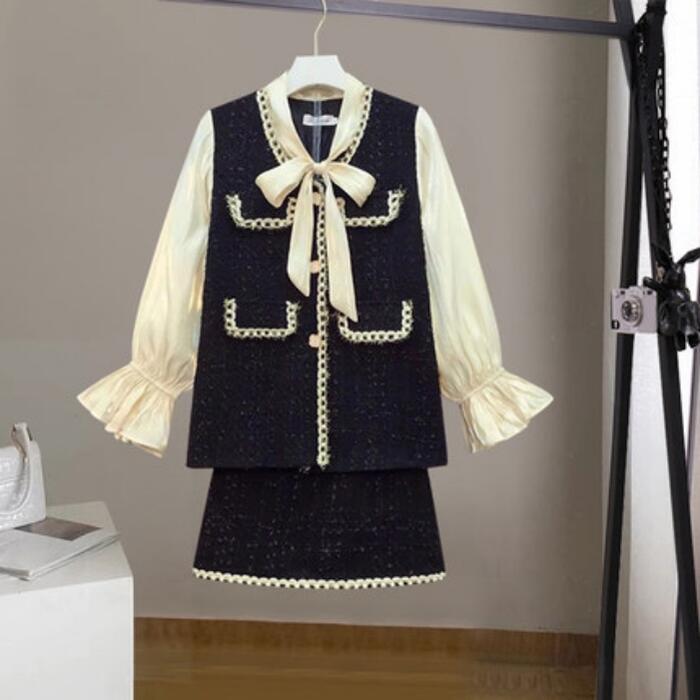 大きいサイズセットアップ 2点セット レイヤード風 ツイード トップス スカート ドッキング リボン ショート丈 長袖 ブラウス おしゃれ 大人可愛い きれいめ カジュアル フェミニン お呼ばれ ブラック 黒 春 秋 冬 20代 30代 40代 50代