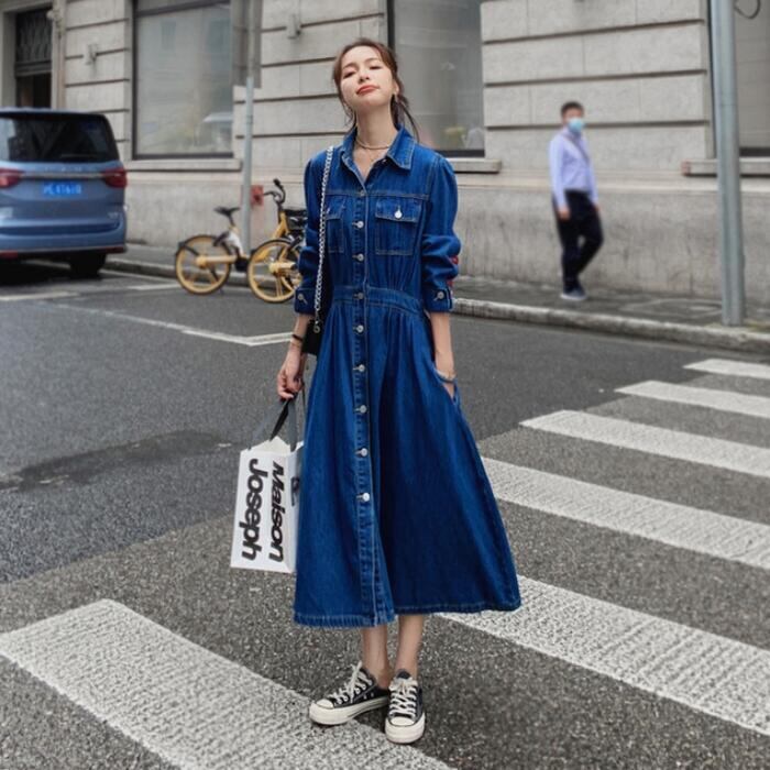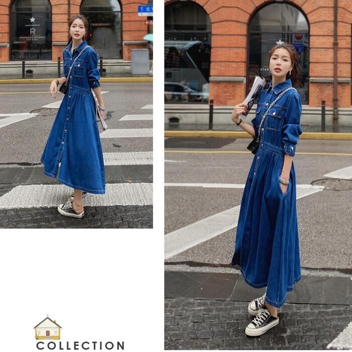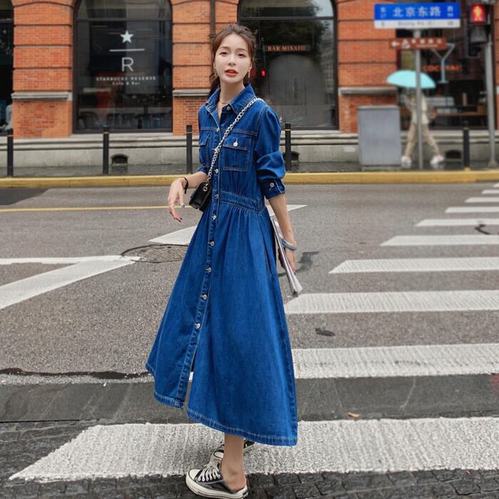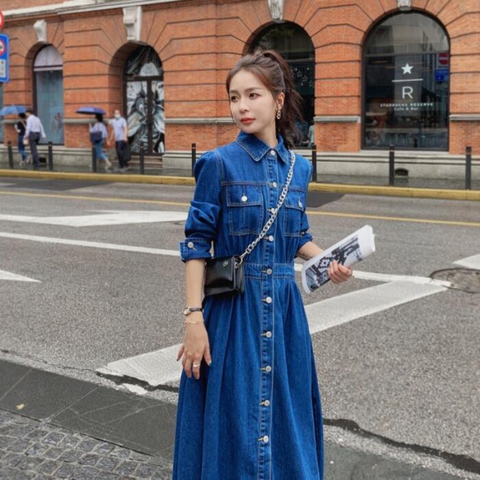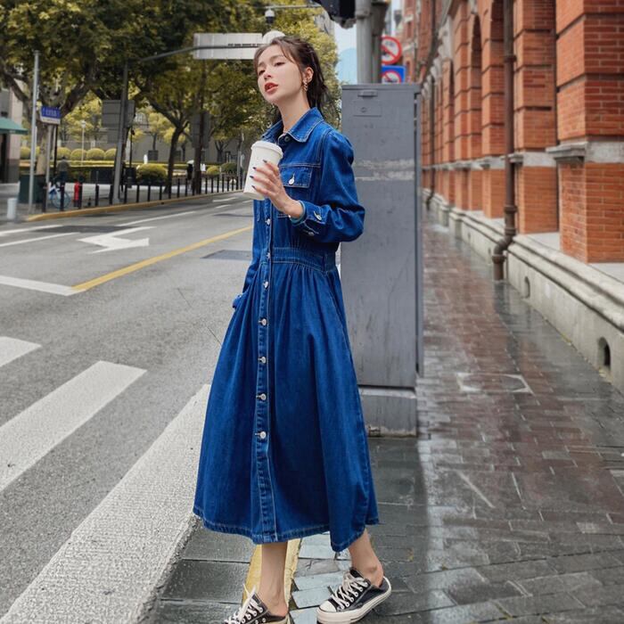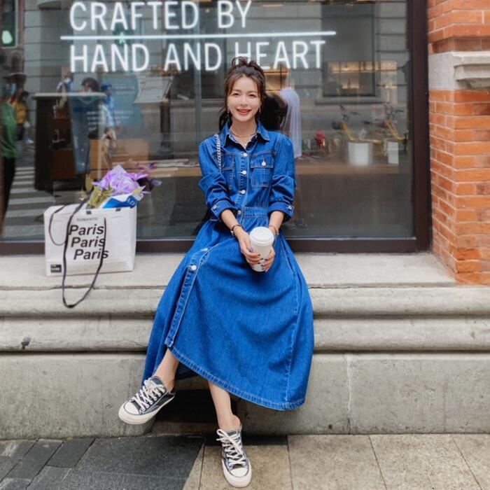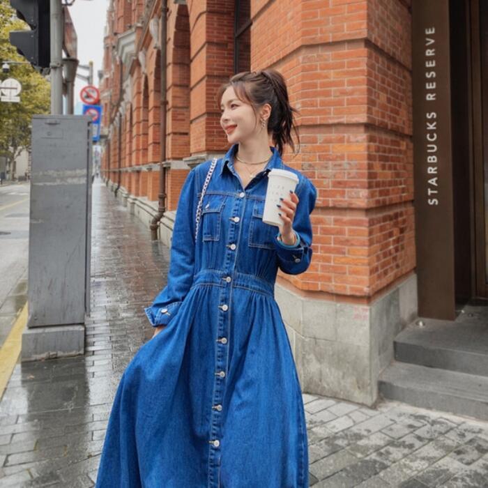 大きいサイズワンピース デニム ロングワンピ 袖あり ミモレ丈 ハイウエスト シャツワンピ レディース ワンピ ドレス 長袖 きれいめ カジュアル 大人可愛い Aライン フェミニン おしゃれ シンプル ブルー 青 春 秋 冬 20代 30代 40代 50代