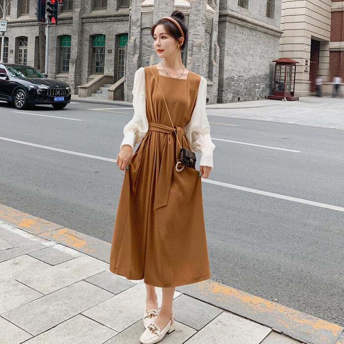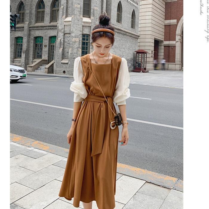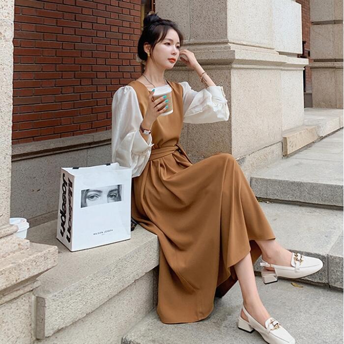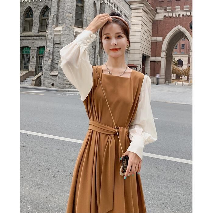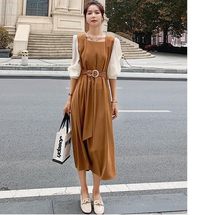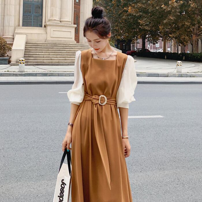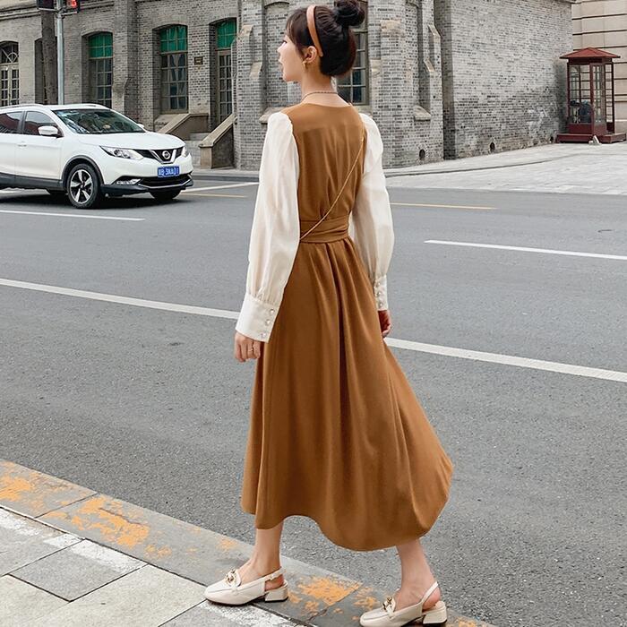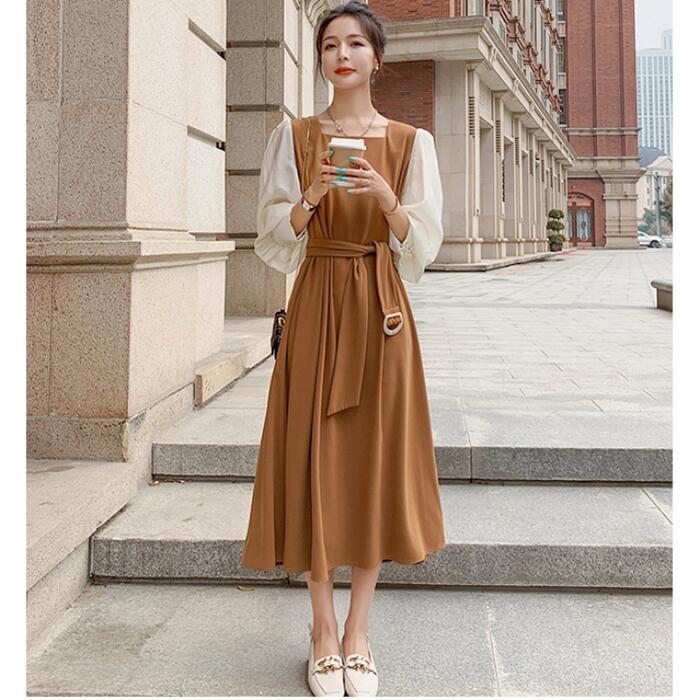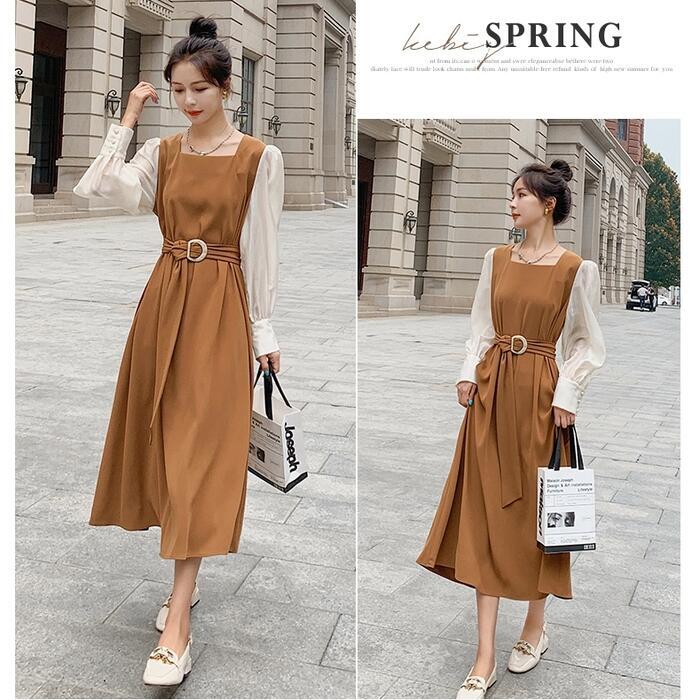 大きいサイズ クラシカルワンピース ロングワンピ パフスリーブ 袖あり ミモレ丈 ハイウエスト スクエアネック 切り替え レディース ワンピ ドレス 長袖 きれいめ カジュアル 大人可愛い ウエストベルト フェミニン おしゃれ ブラウン 春 秋 冬 20代 30代 40代 50代