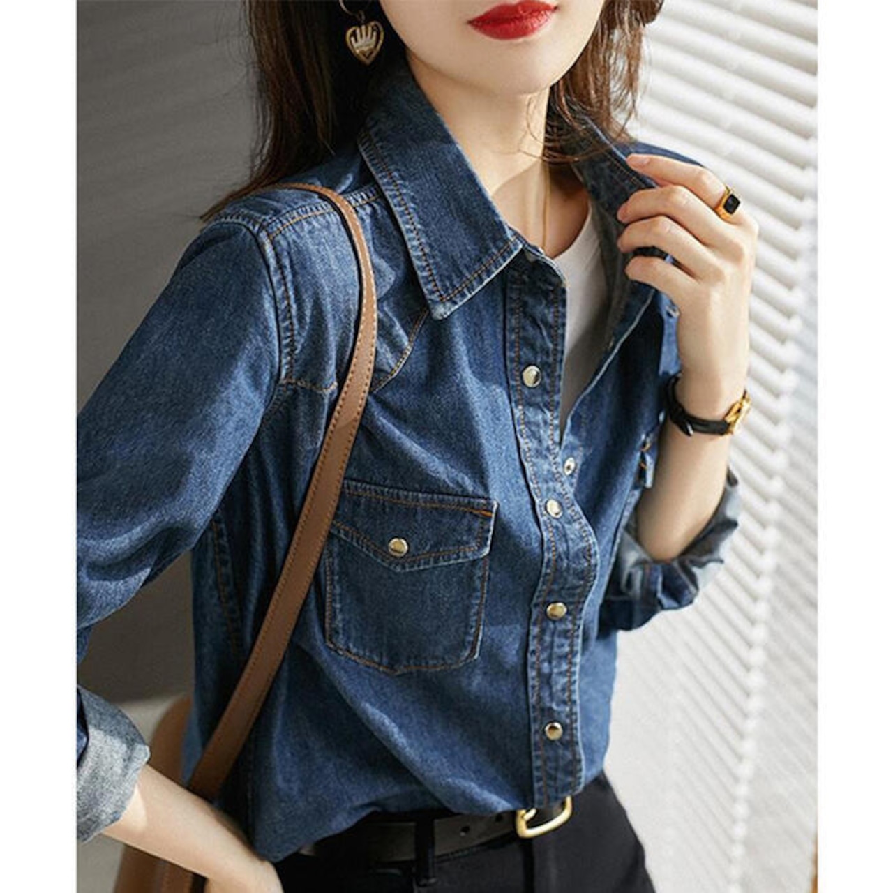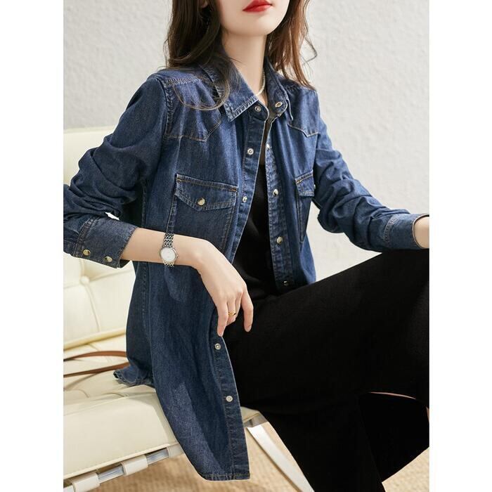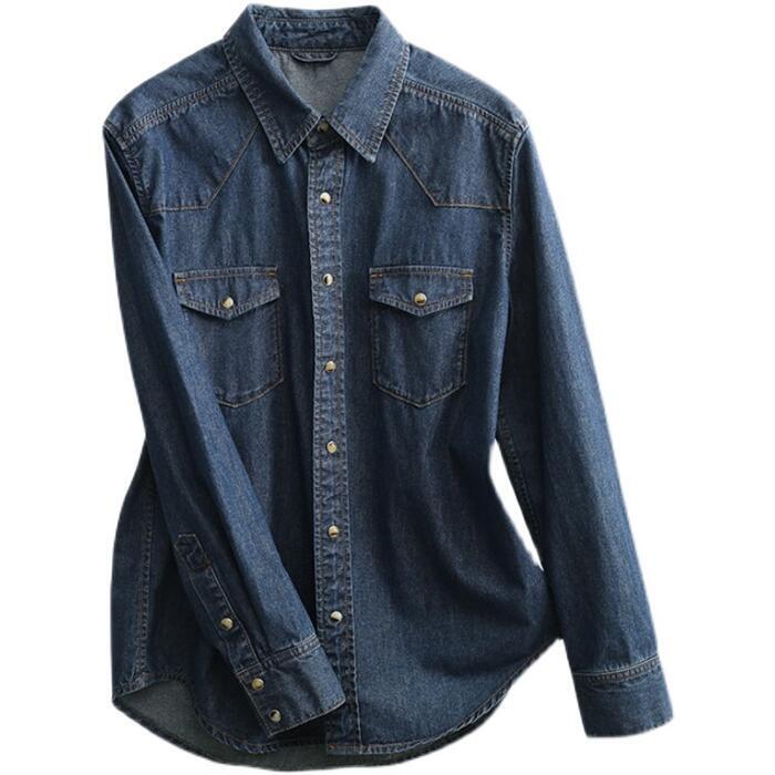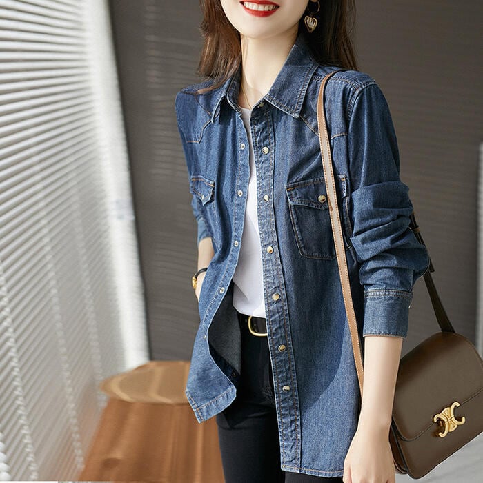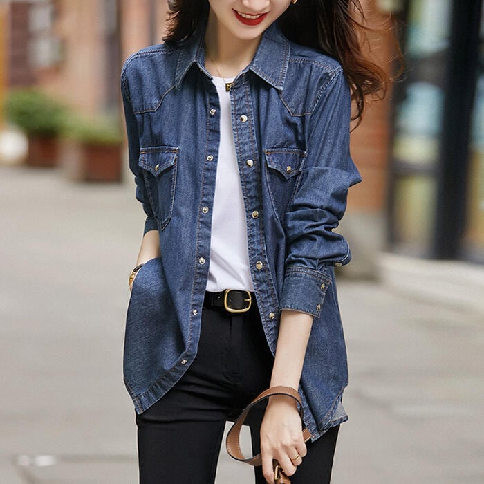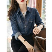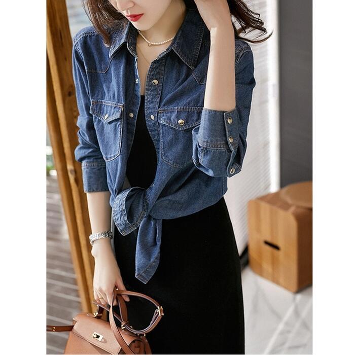 トップス デニム シャツ ブラウス 長袖 レディース カジュアル おしゃれ フェミニン 大人可愛い きれいめ シンプル ベーシック 羽織 スナップボタン アメカジ 大きいサイズ ブルー 青 春 秋 冬 20代 30代 40代 50代