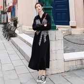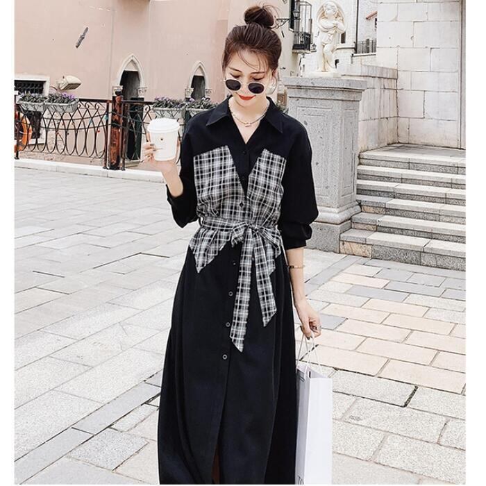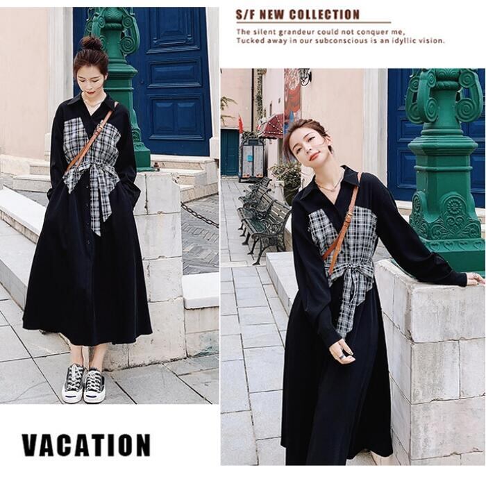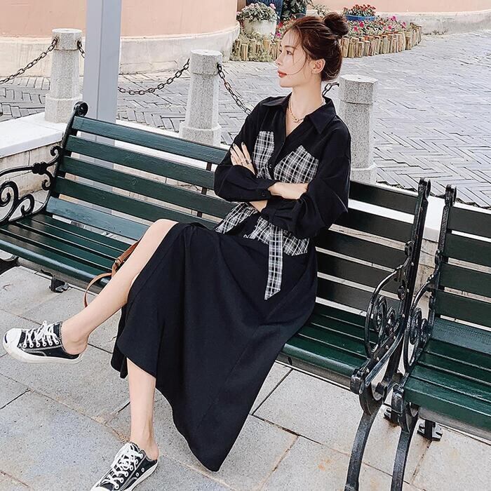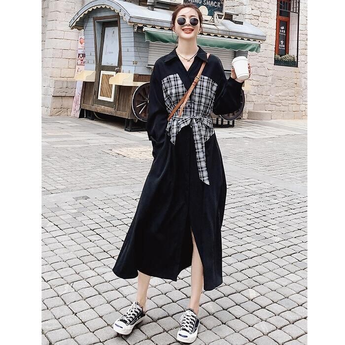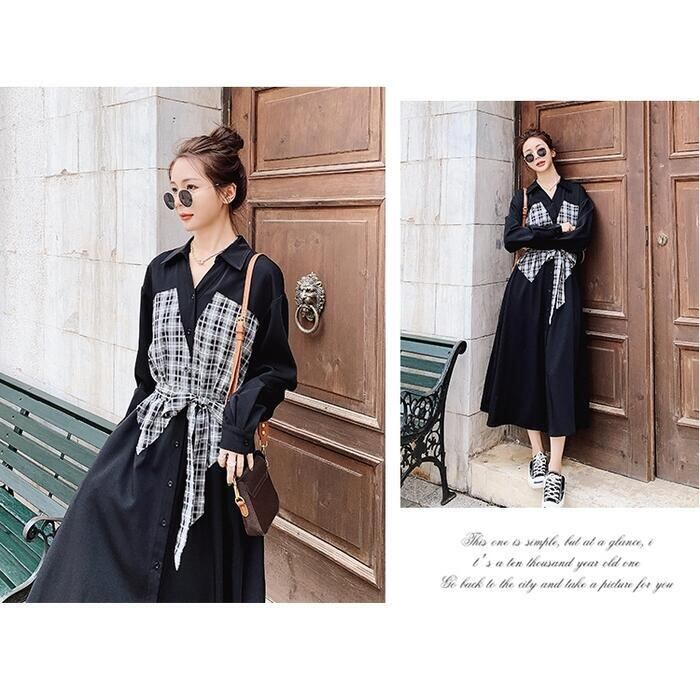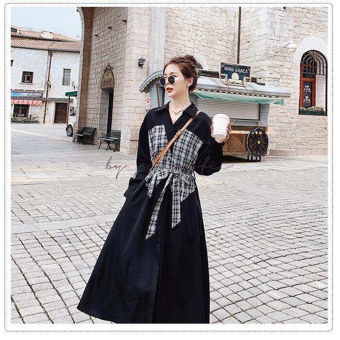 大きいサイズシャツワンピース ロングワンピ 袖あり ミモレ丈 ハイウエスト 切り替え チェック レディース ワンピ ドレス 長袖 きれいめ カジュアル 大人可愛い Aライン フェミニン ウエストリボン おしゃれ ブラック 黒 春 秋 冬 20代 30代 40代 50代