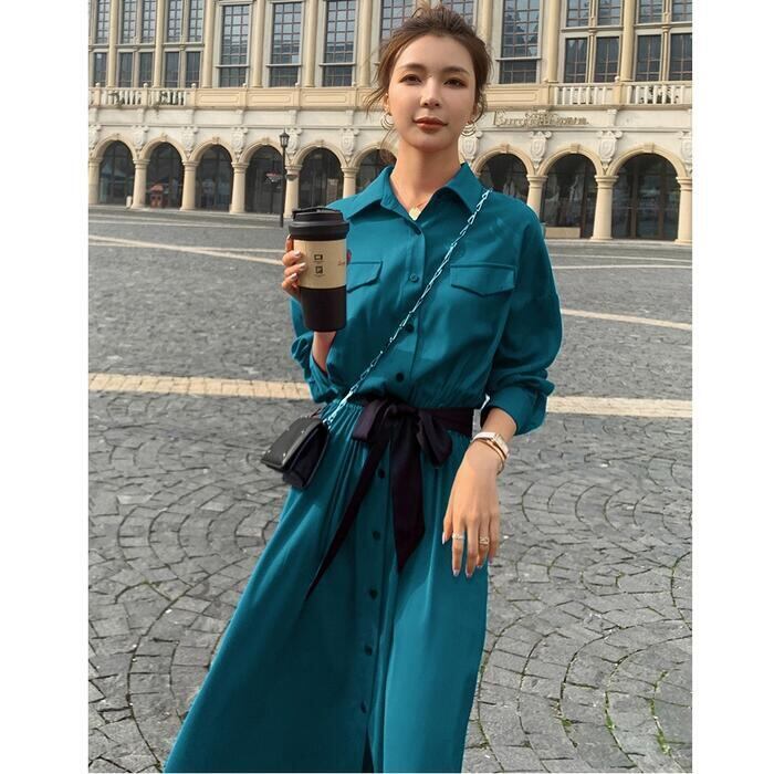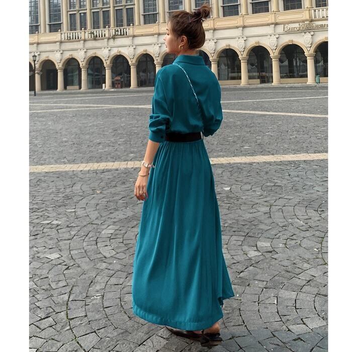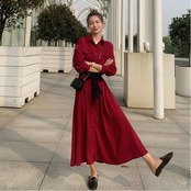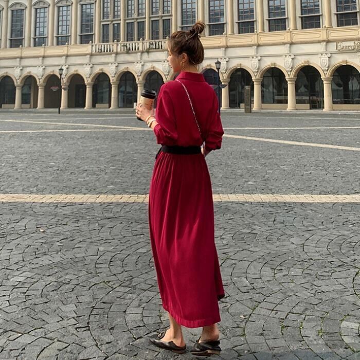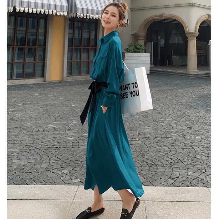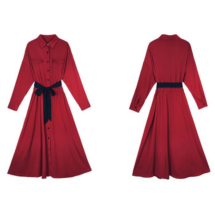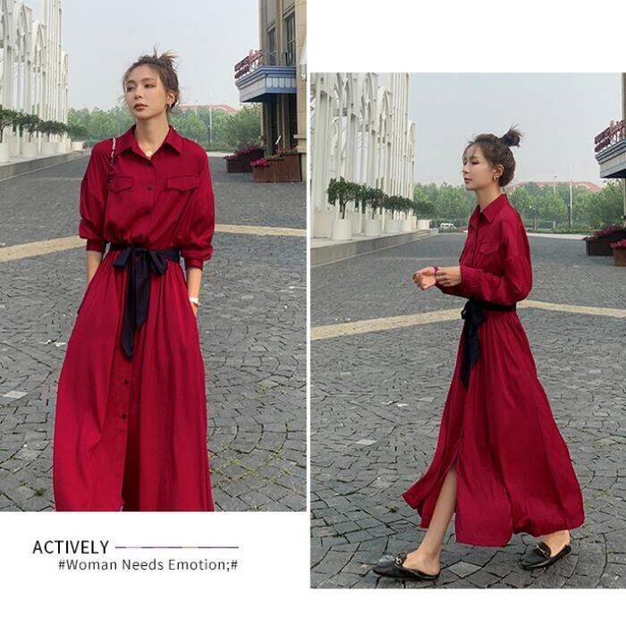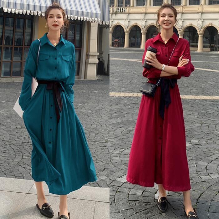 全2色 大きいサイズワンピース ロングワンピ 袖あり マキシ丈 ハイウエスト シャツワンピース レディース ワンピ ドレス 長袖 大人可愛い Aライン ウエストリボン おしゃれ きれいめ カジュアル レッド 赤 グリーン 緑 春 秋 冬 20代 30代 40代 50代
