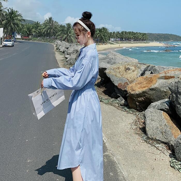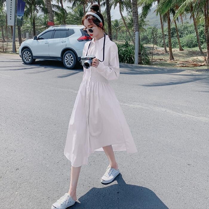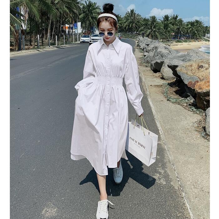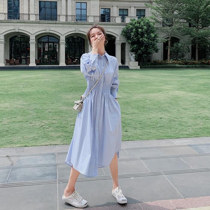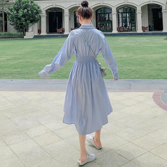 全2色 大きいサイズワンピース ロングワンピ 袖あり ミモレ丈 ハイウエスト シャツワンピース レディース ワンピ ドレス 長袖 大人可愛い Aライン ウエストゴム おしゃれ きれいめ カジュアル ブルー 青 ホワイト 白 春 秋 冬 20代 30代 40代 50代
