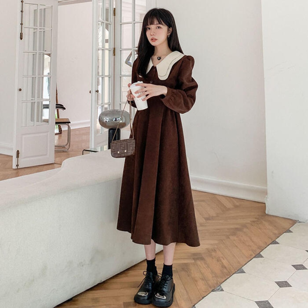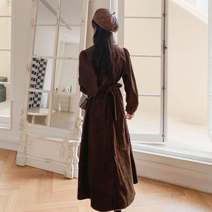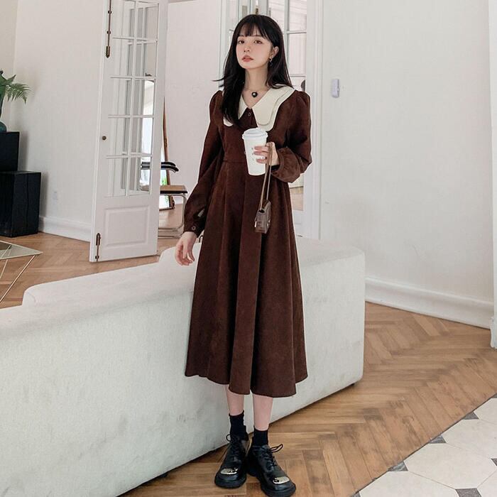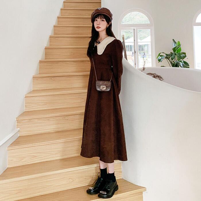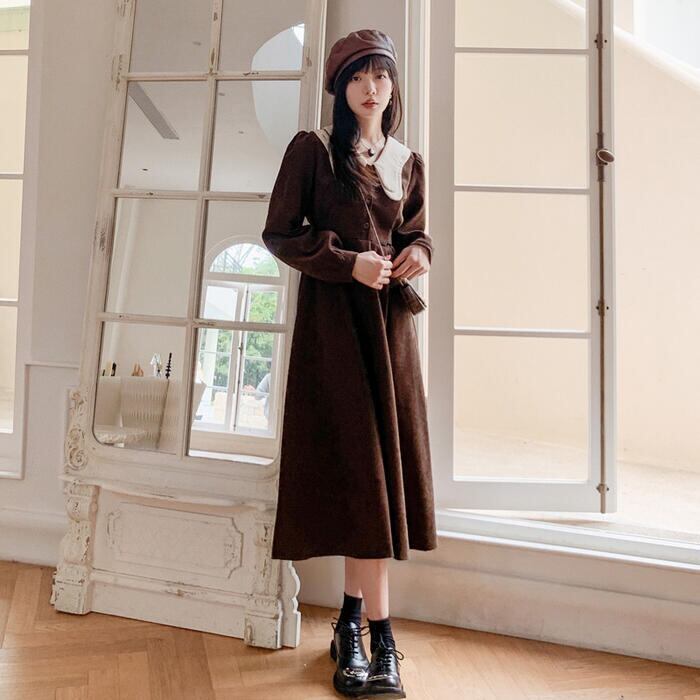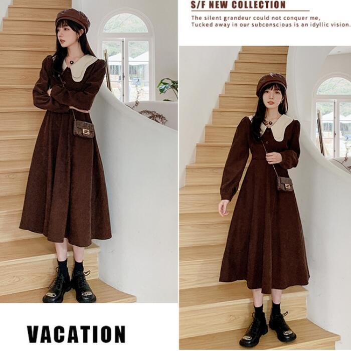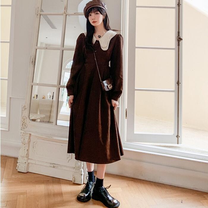 大きいサイズワンピース ロングワンピ 袖あり ミモレ丈 ハイウエスト パフスリーブ コーデュロイ ビッグカラー レディース ワンピ ドレス 長袖 大人可愛い Aライン ウエストリボン カジュアル ブラウン 春 秋 冬 20代 30代 40代 50代