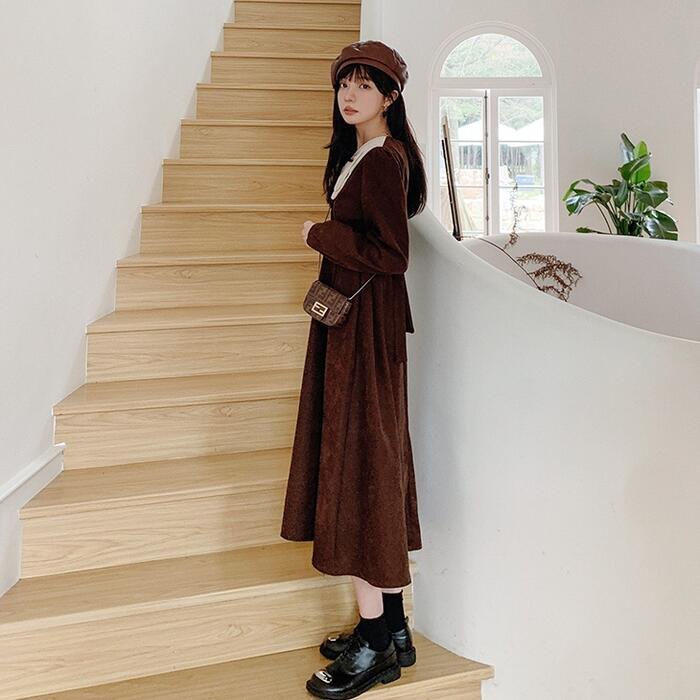蝶々のような襟がガーリーなコーデュロイワンピース。