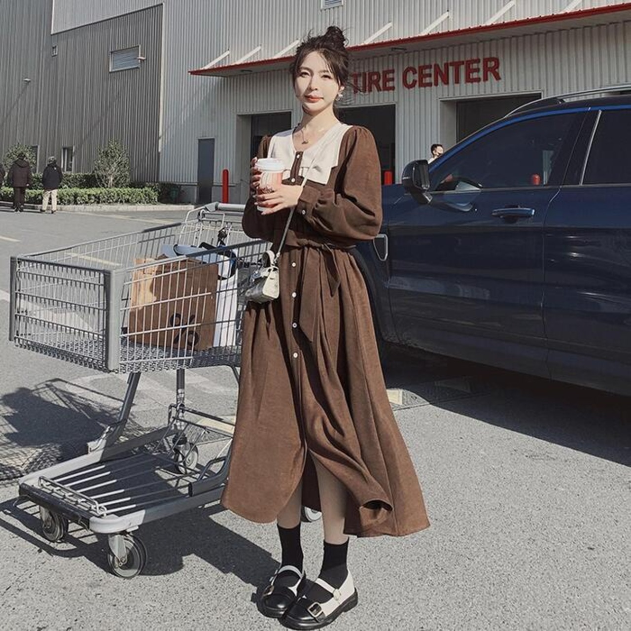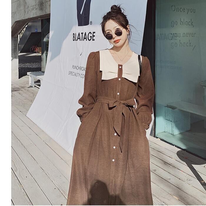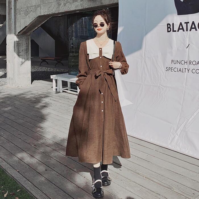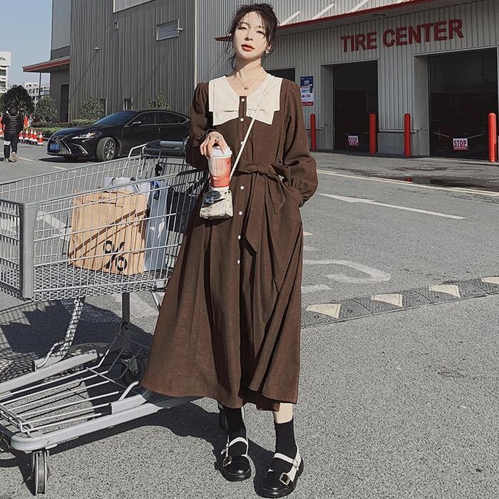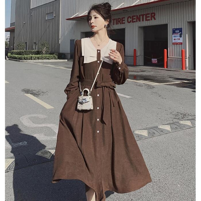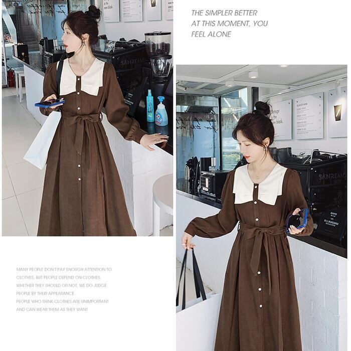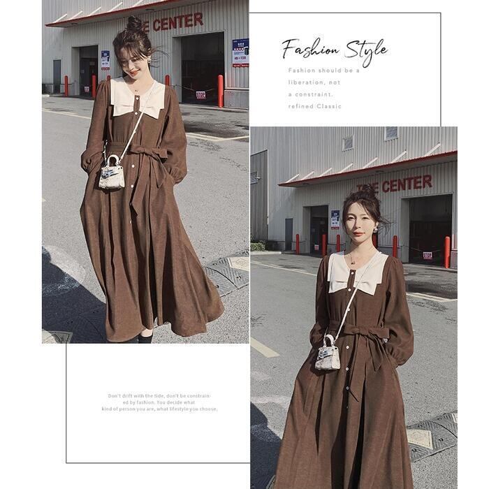 大きいサイズワンピース ロングワンピ ビッグカラー 袖あり ミモレ丈 ハイウエスト パフスリーブ レディース ワンピ ドレス 長袖 大人可愛い Aライン ウエストリボン カジュアル クラシカル ブラウン 春 秋 冬 20代 30代 40代 50代