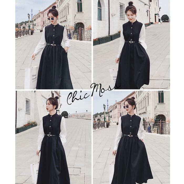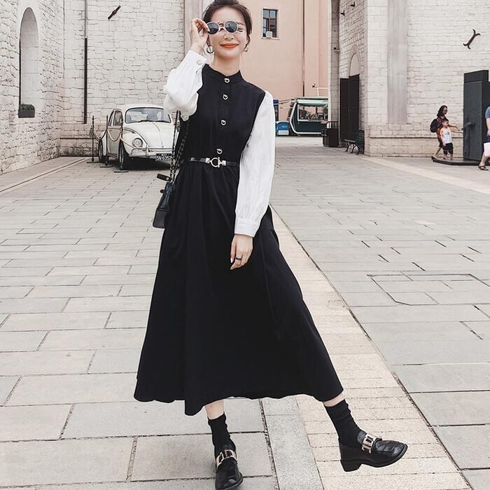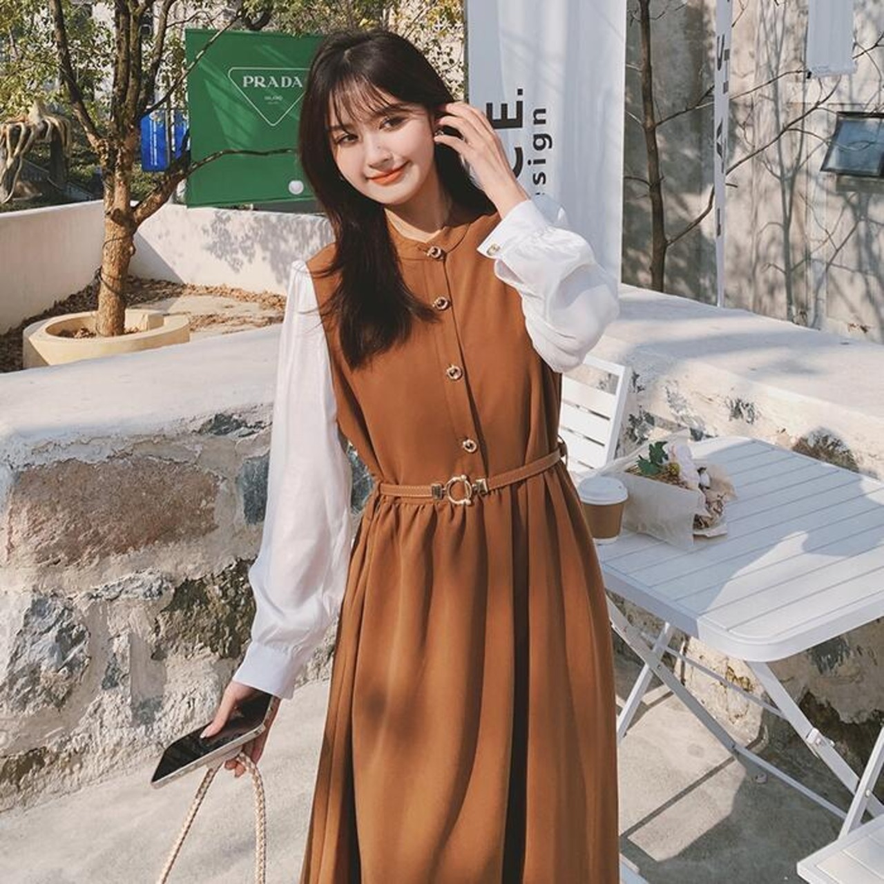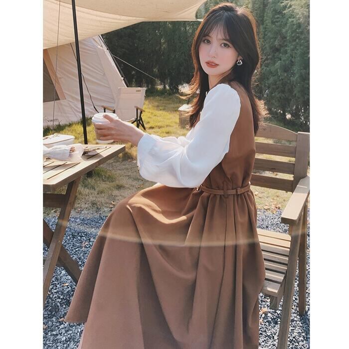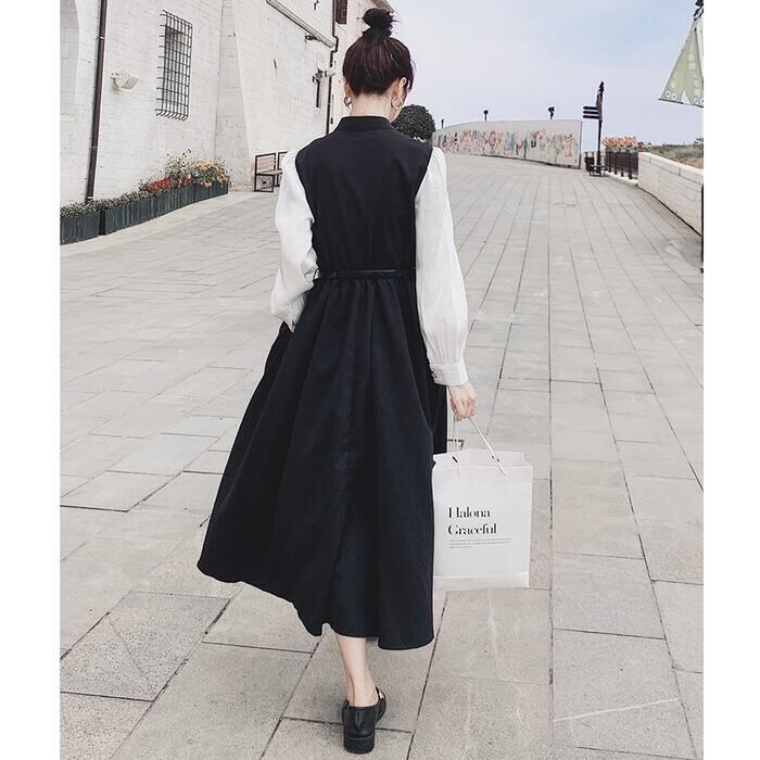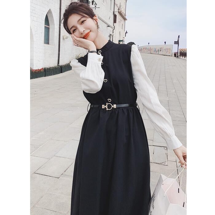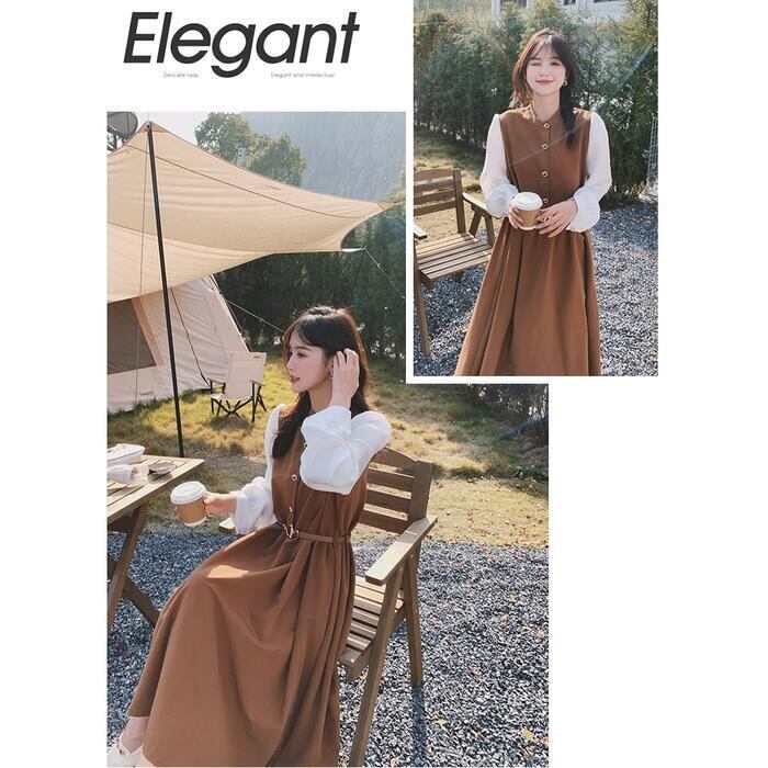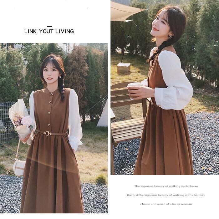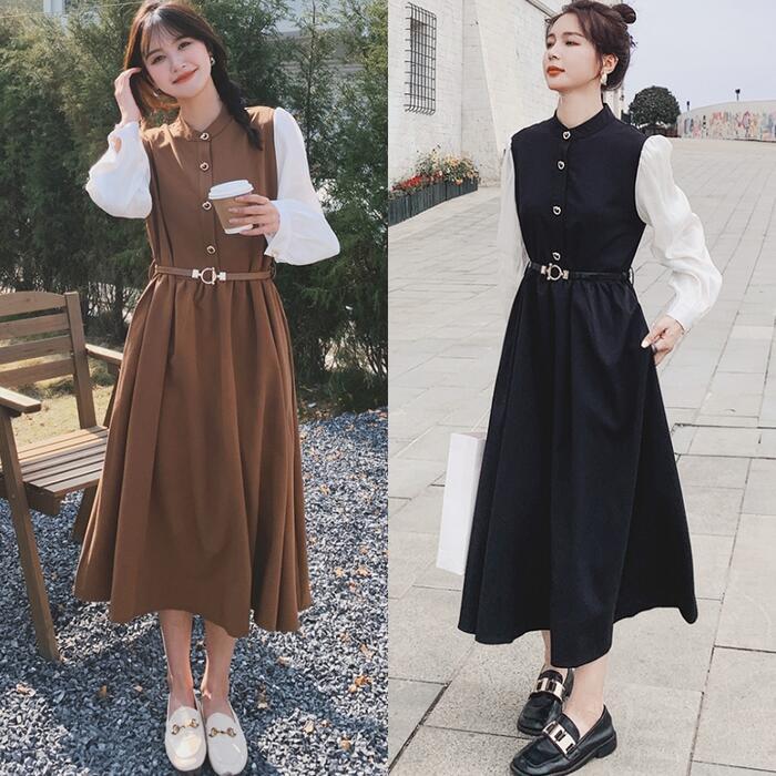 全2色 大きいサイズレイヤード風 ワンピース ロングワンピ 切り替え 袖あり パフスリーブ ミモレ丈 ハイウエスト レディース ワンピ ドレス 長袖 大人可愛い Aライン ウエストベルト カジュアル クラシカル ブラウン ブラック 黒 春 秋 冬 20代 30代 40代 50代