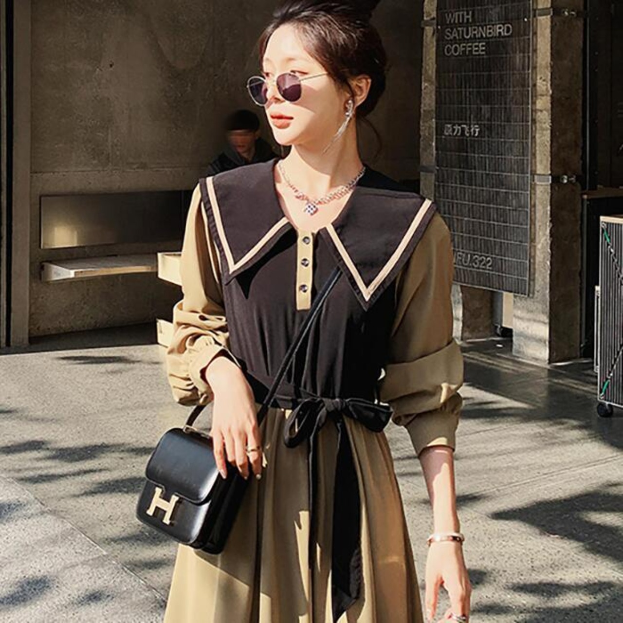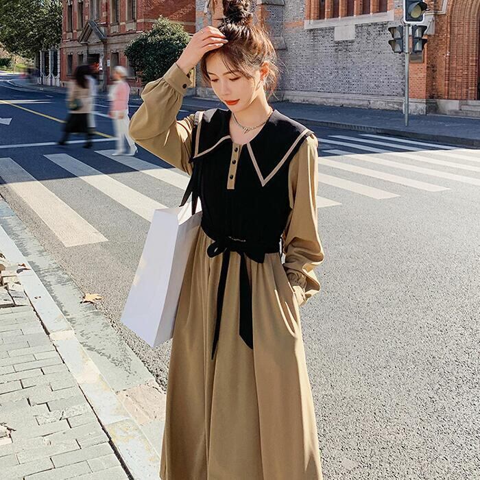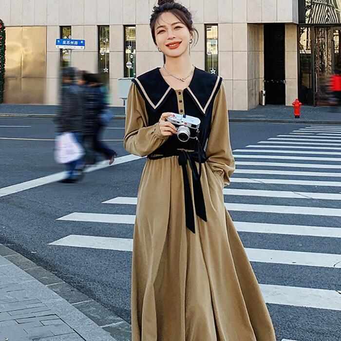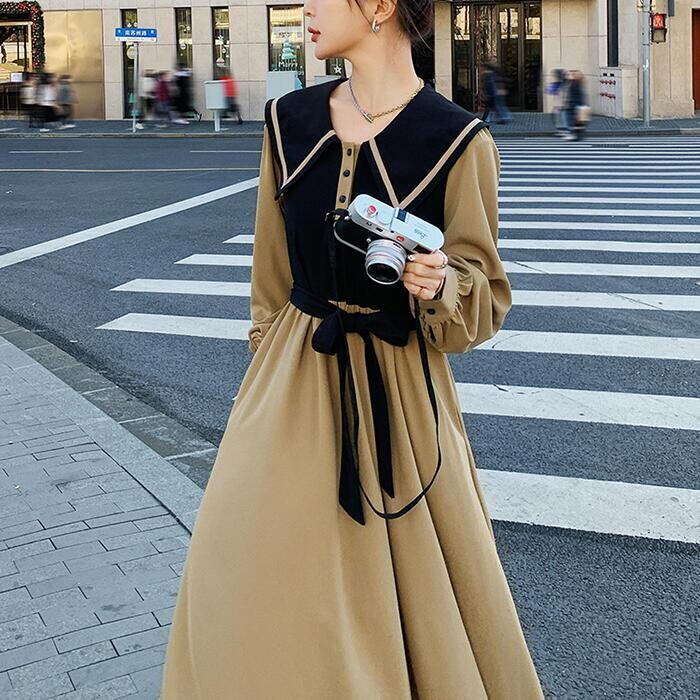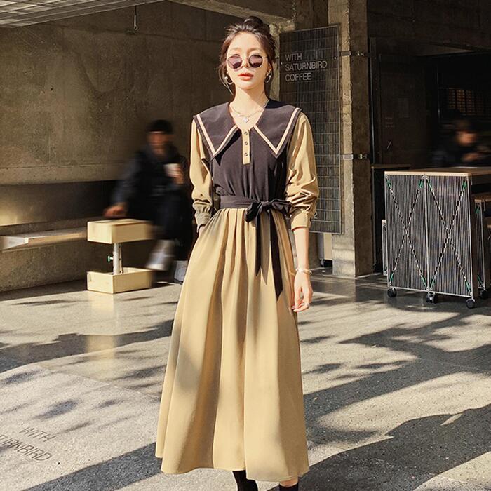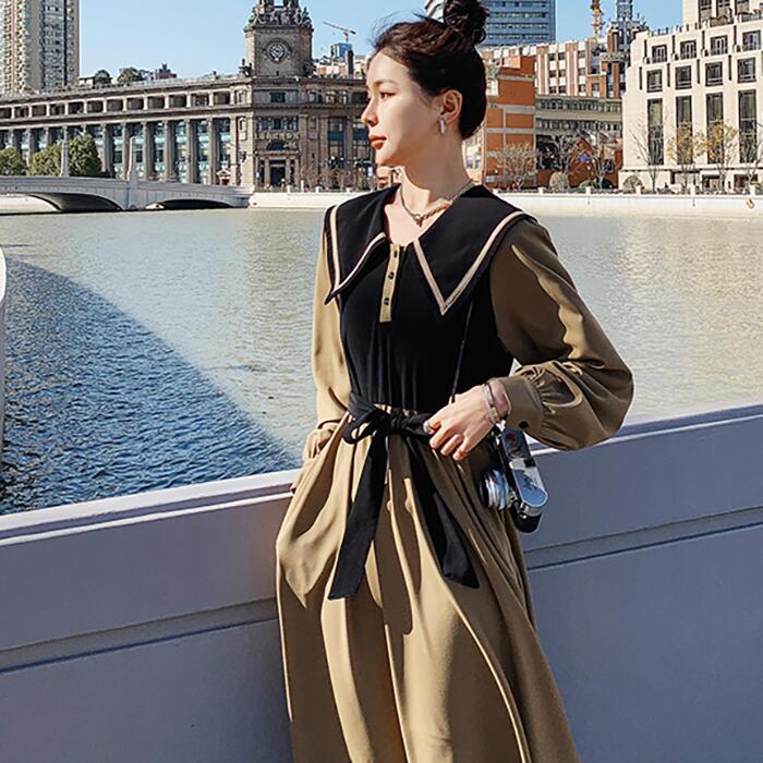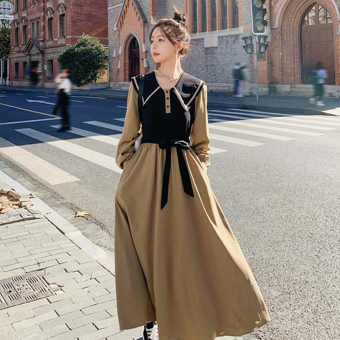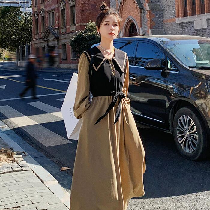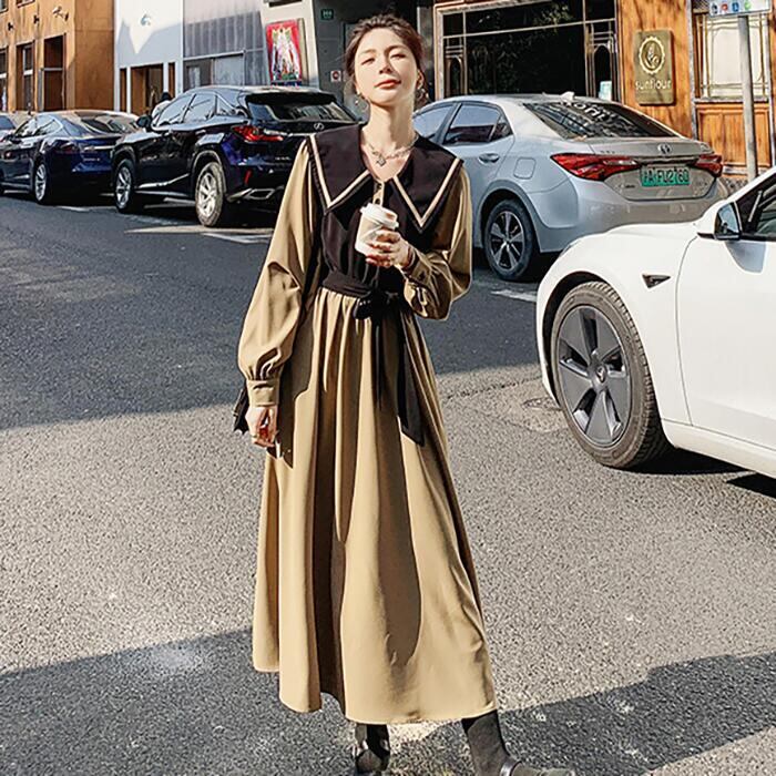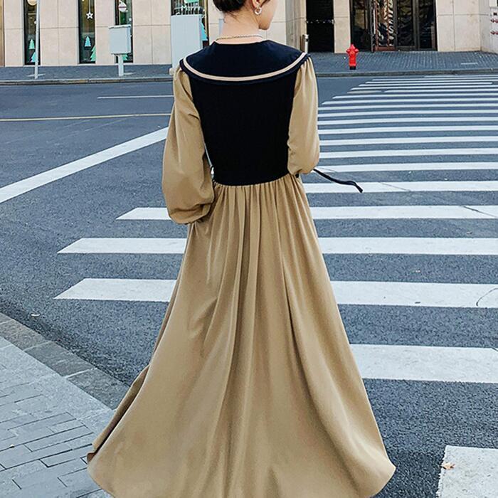 ロングワンピース レディース おしゃれ カジュアル ロング丈 ワンピ ドレス ナチュラル 袖あり 長袖 韓国 コーデ フェミニン レトロ お出かけ デート 春 秋 冬 コントラストカラー ブラック 黒 カーキ 20代 30代 40代 50代