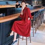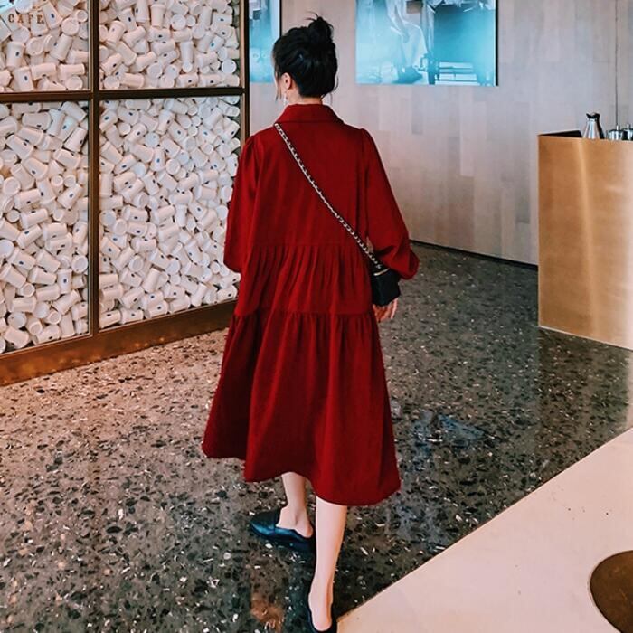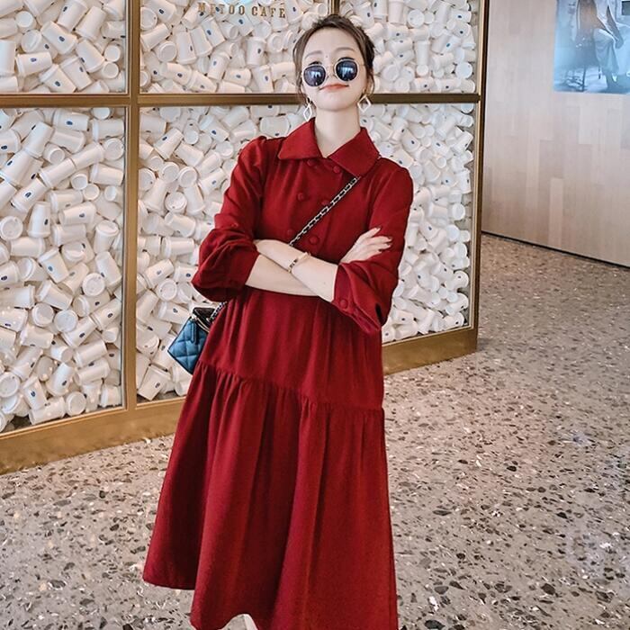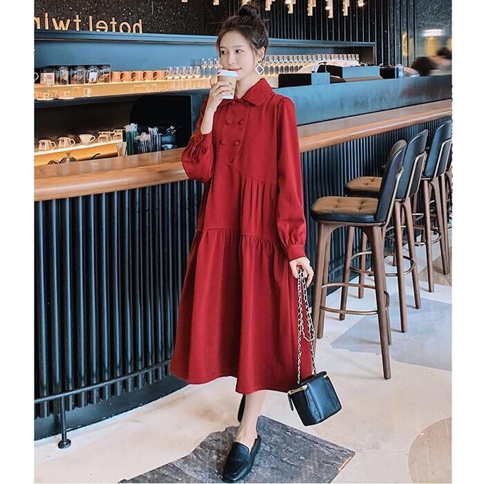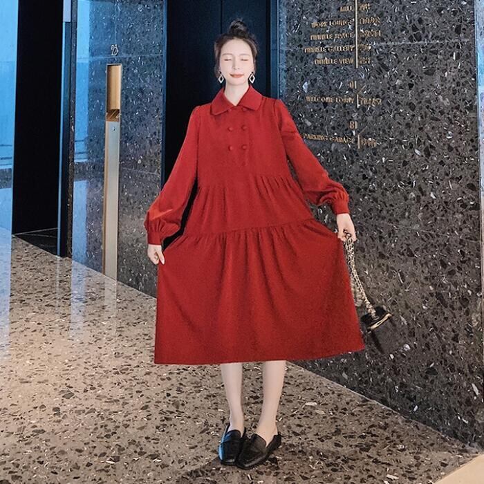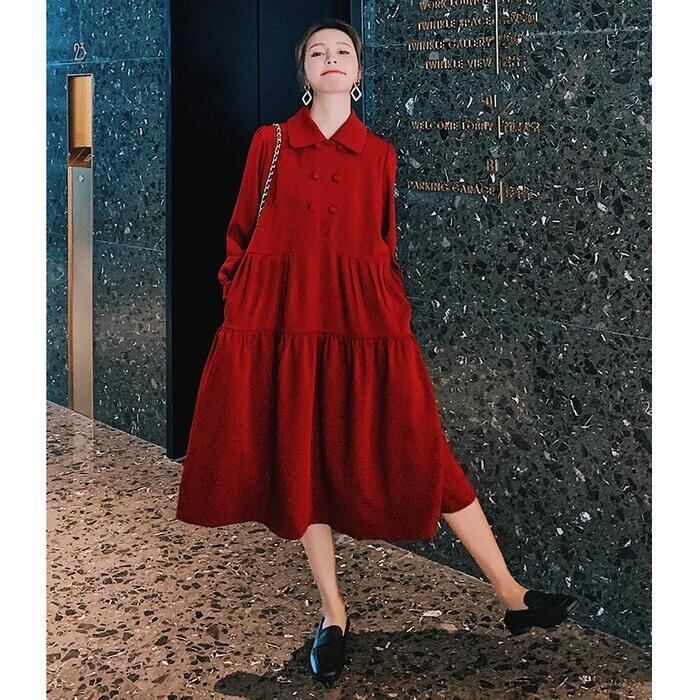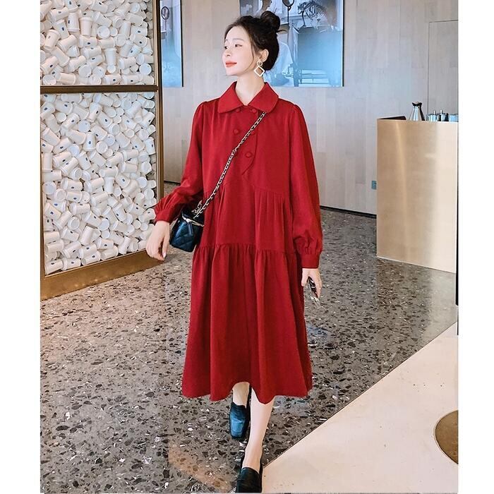 大きいサイズティアード ワンピース ロングワンピ 袖あり ミモレ丈 パフスリーブ レディース ワンピ ドレス 長袖 きれいめ 大人可愛い Aライン ゆったり オーバーサイズ 楽ちん フェミニン カジュアル レッド 赤 春 秋 冬 20代 30代 40代 50代