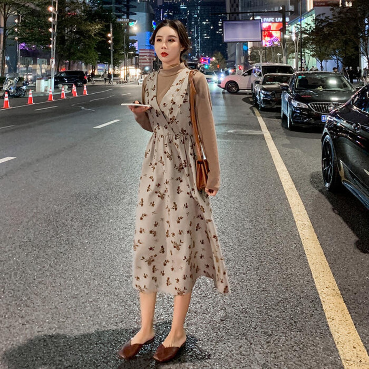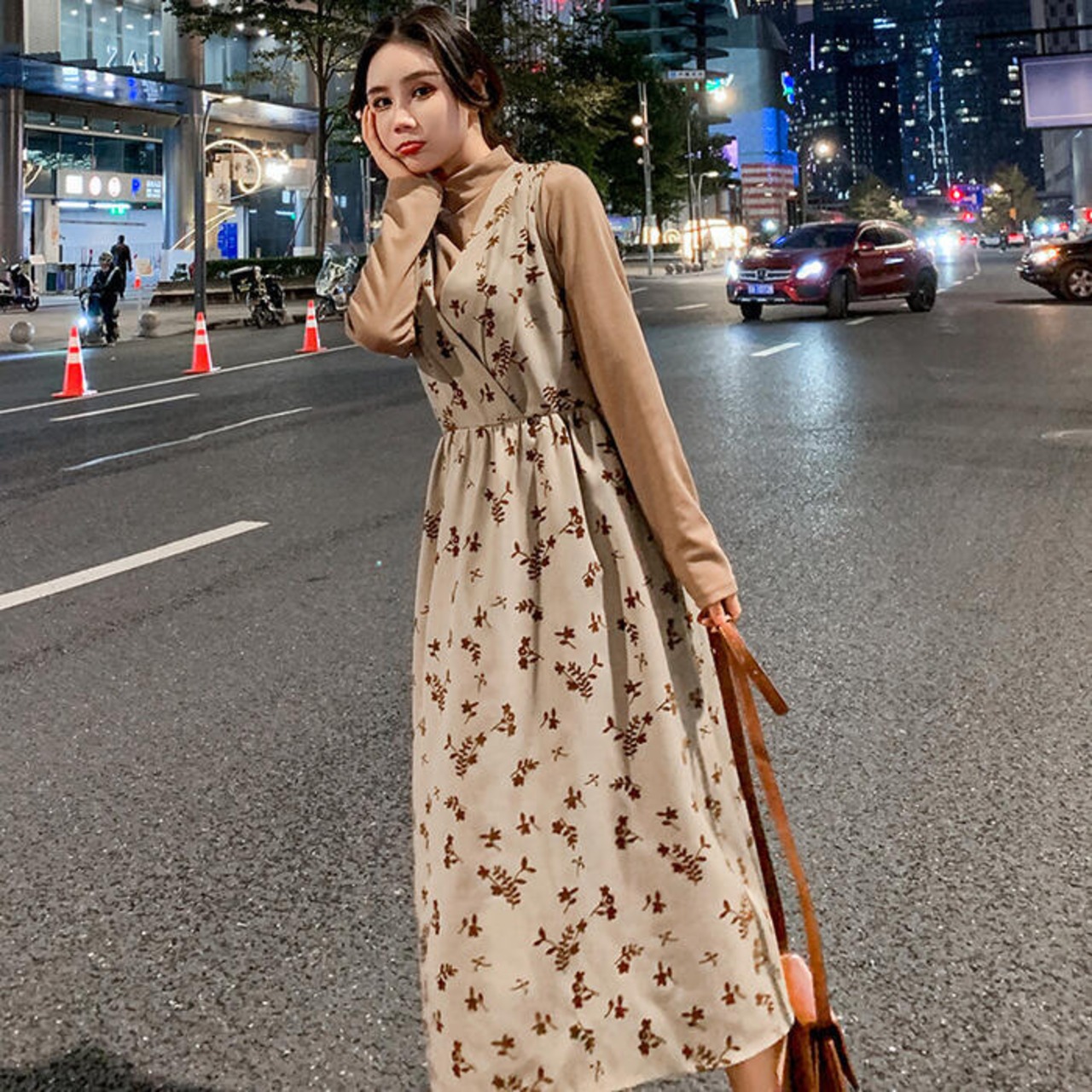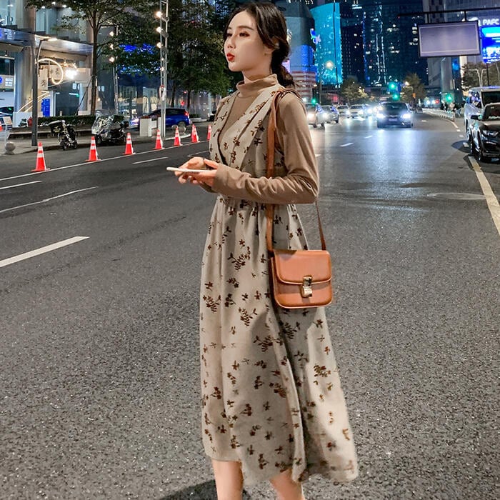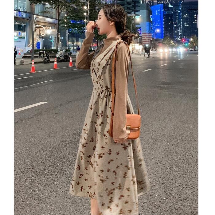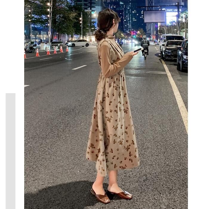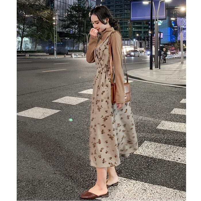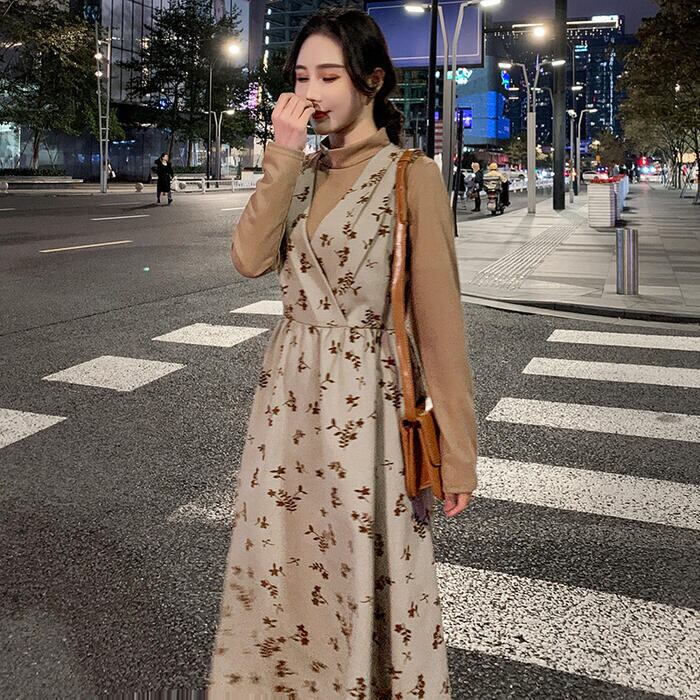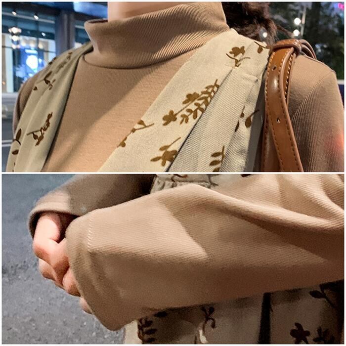 大きいサイズセットアップ 2点セット レイヤード トップス ワンピース サロペットスカート 花柄 ミモレ丈 ジャンパースカート 長袖 おしゃれ 大人可愛い きれいめ カジュアル フェミニン モックネック ベージュ 春 秋 冬 20代 30代 40代 50代