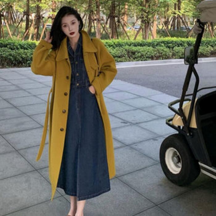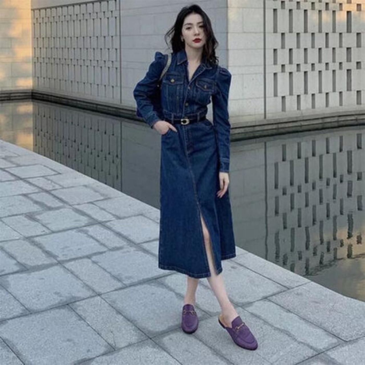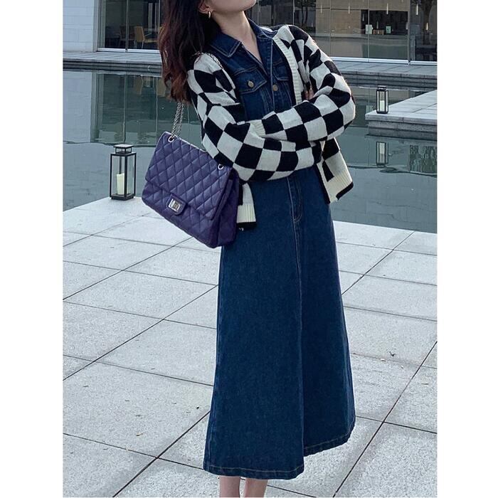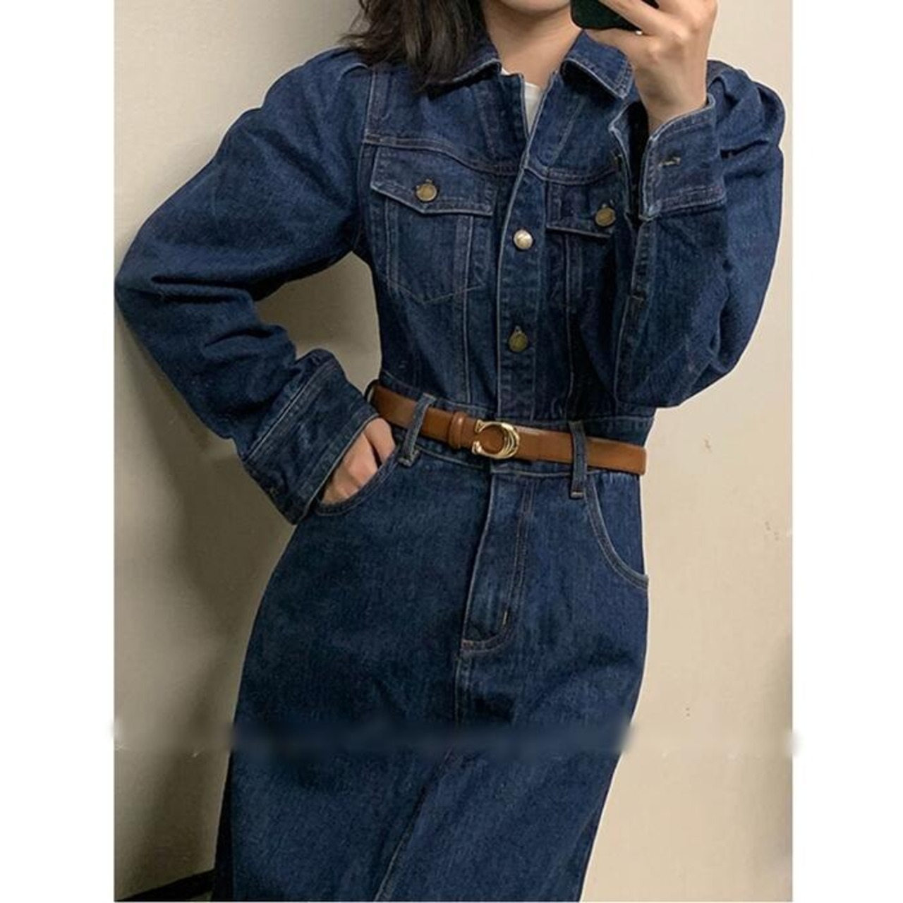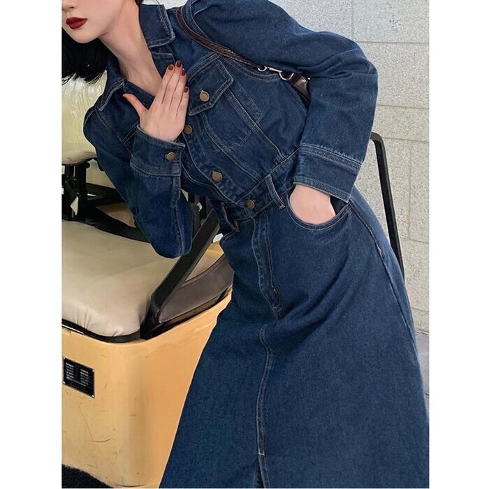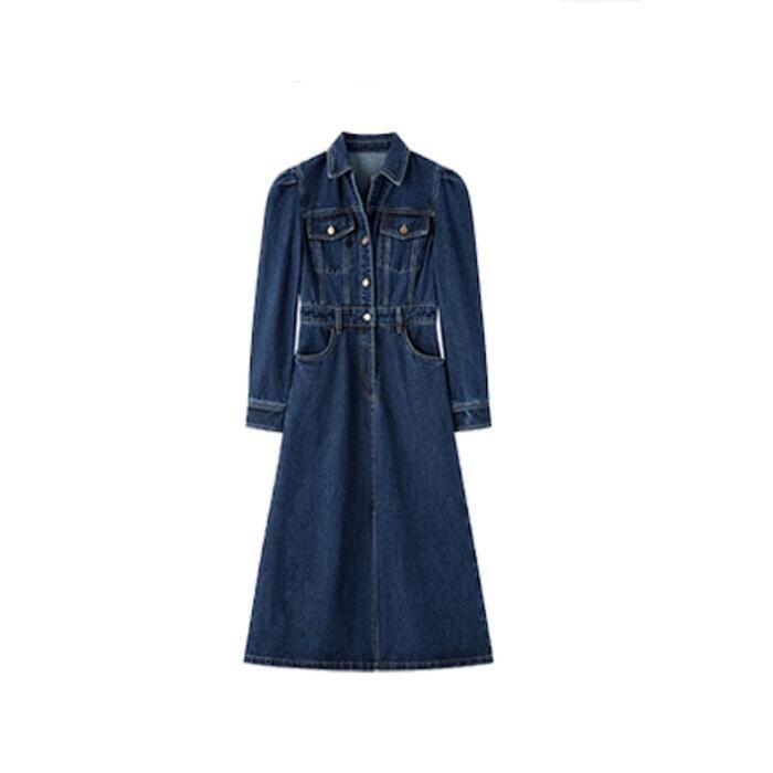 デニム ワンピース ロングワンピ 袖あり ミモレ丈 ハイウエスト パフスリーブ レディース ワンピ ドレス 長袖 大人可愛い Aライン シャツワンピ カジュアル シンプル おしゃれ 大きいサイズ ブルー 青 春 秋 冬 20代 30代 40代 50代