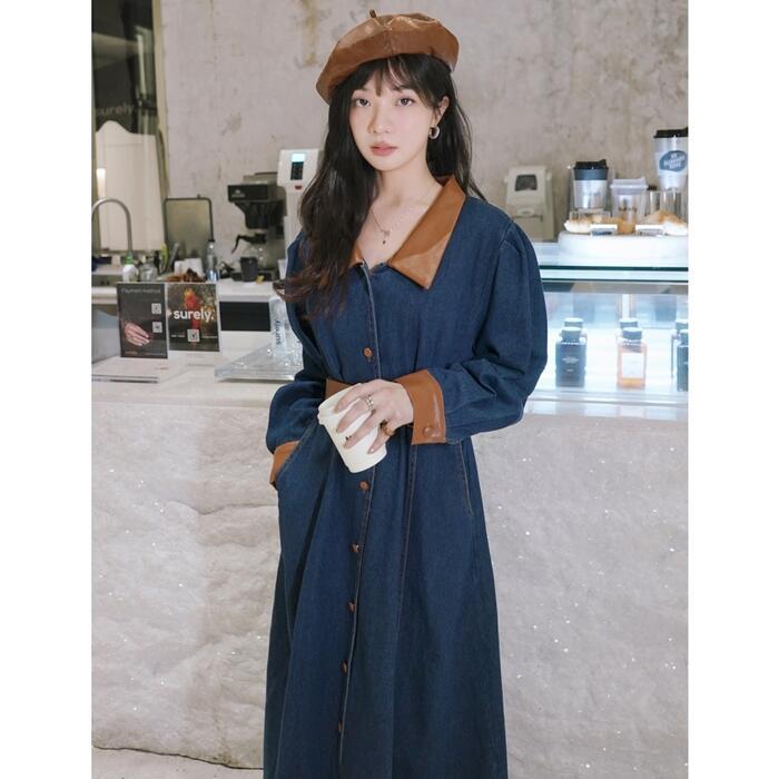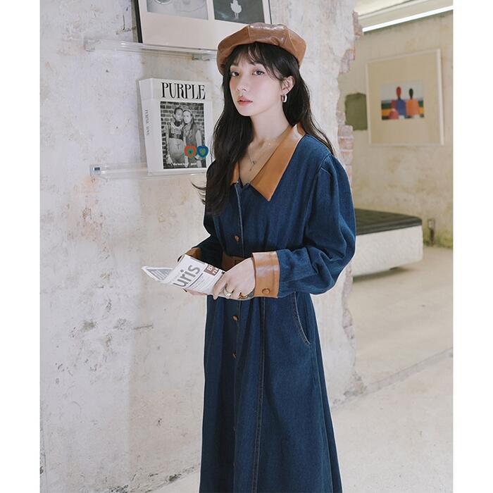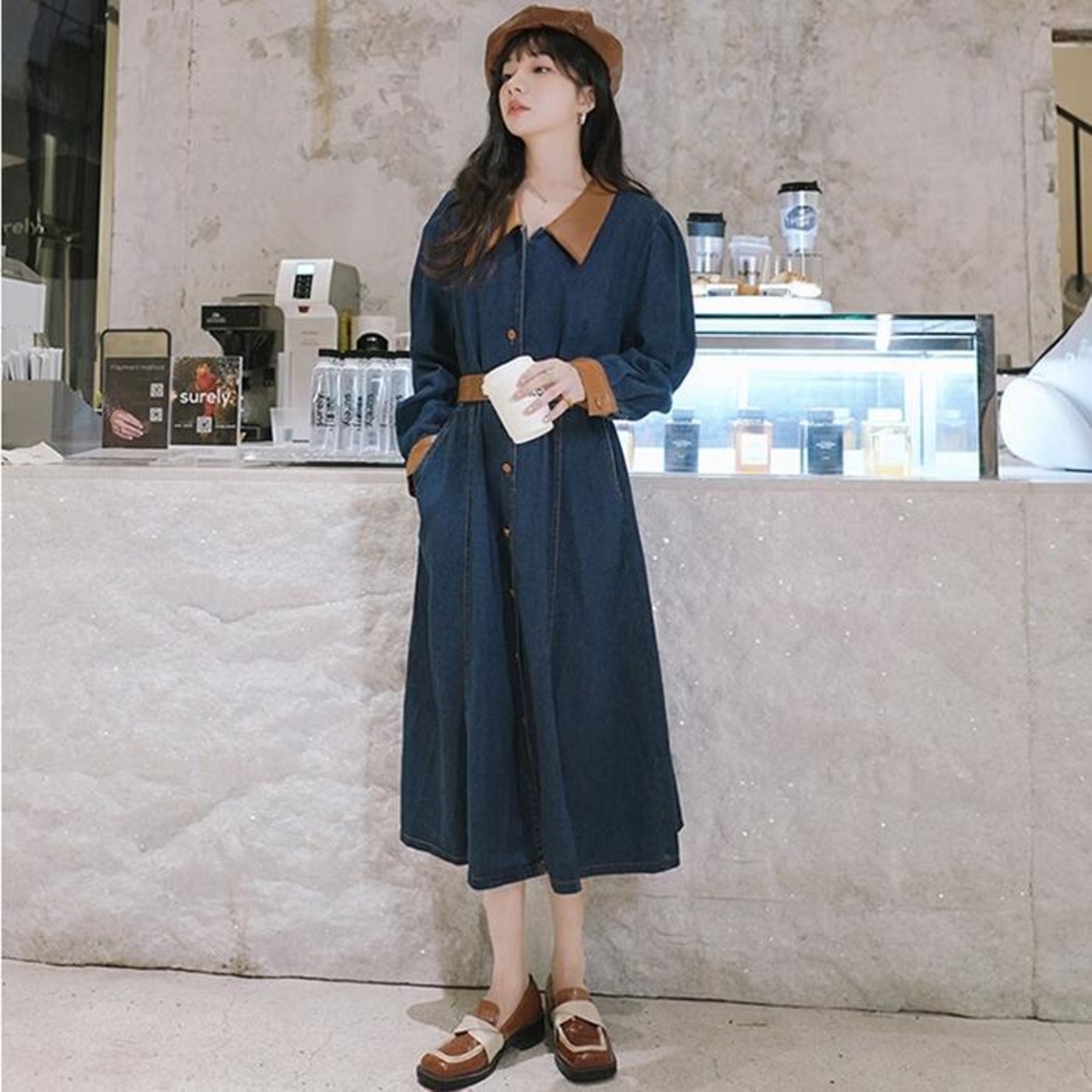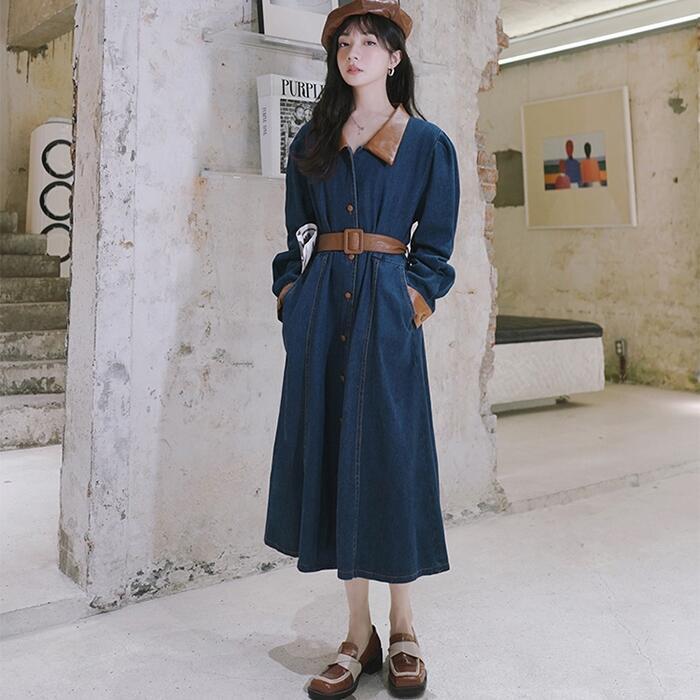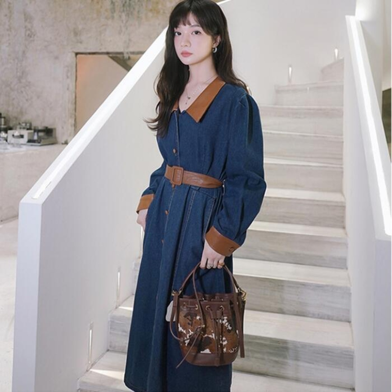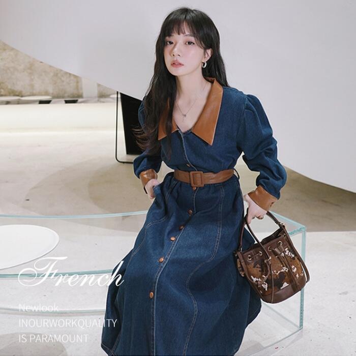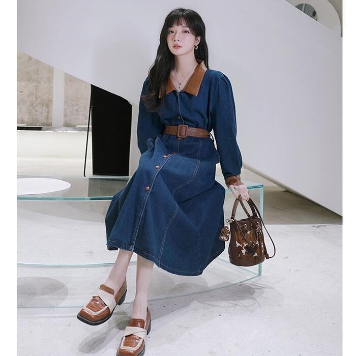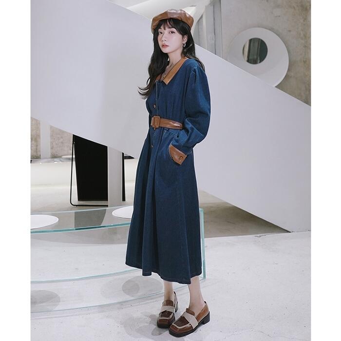 大きいサイズデニム ワンピース ロングワンピ 切り替え 袖あり パフスリーブ ミモレ丈 ハイウエスト レディース ワンピ ドレス 長袖 大人可愛い 異素材MIX Aライン ウエストベルト カジュアル クラシカル ブルー 青 春 秋 冬 20代 30代 40代 50代