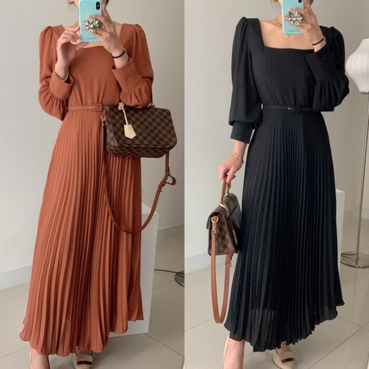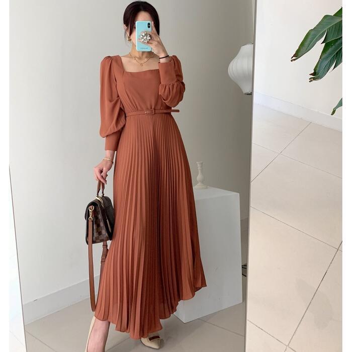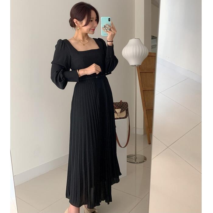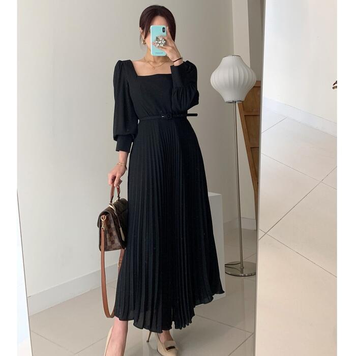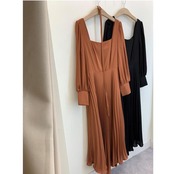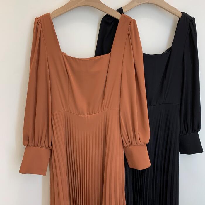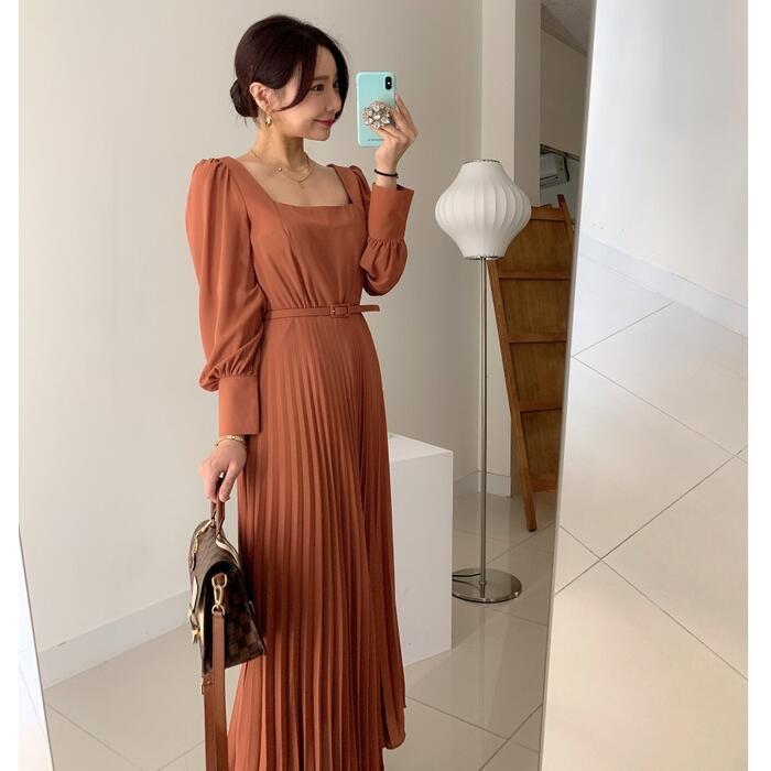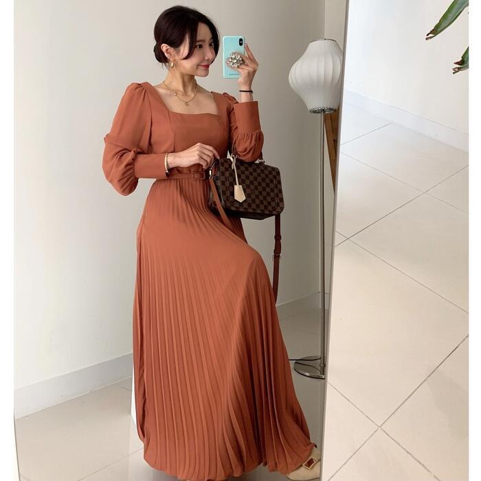 全2色 ワンピース ロングワンピ スクエアネック 袖あり プリーツ ロング丈 パフスリーブ レディース ワンピ ドレス ハイウエスト 大人可愛い Aライン きれいめ カジュアル フェミニン 体型カバー オレンジ ブラック 黒 春 秋 冬 20代 30代 40代 50代