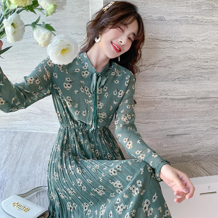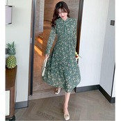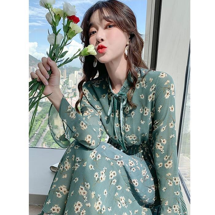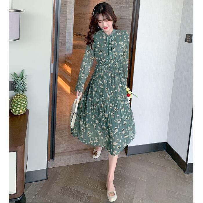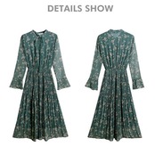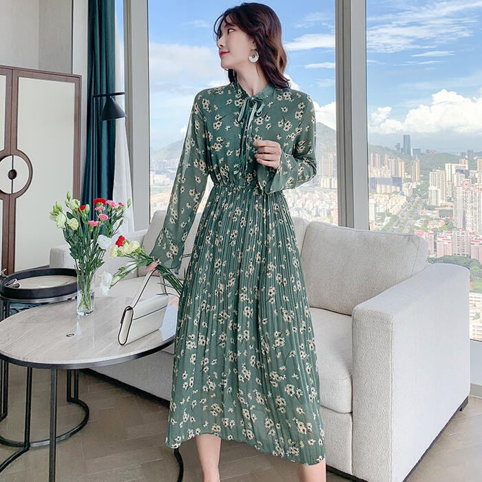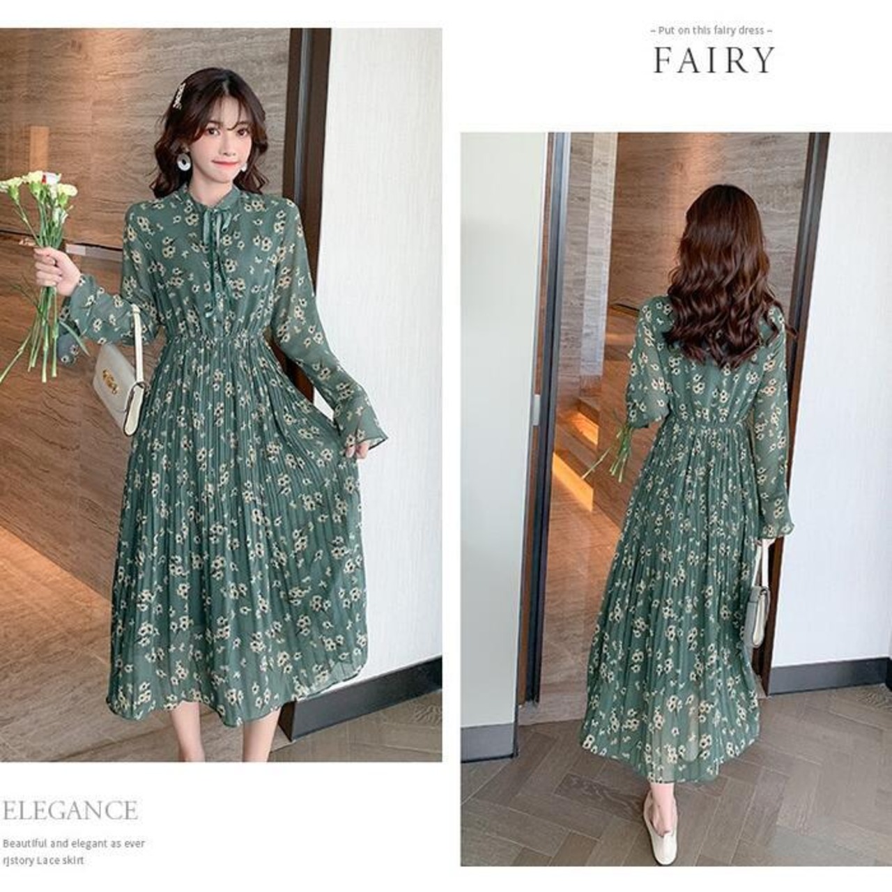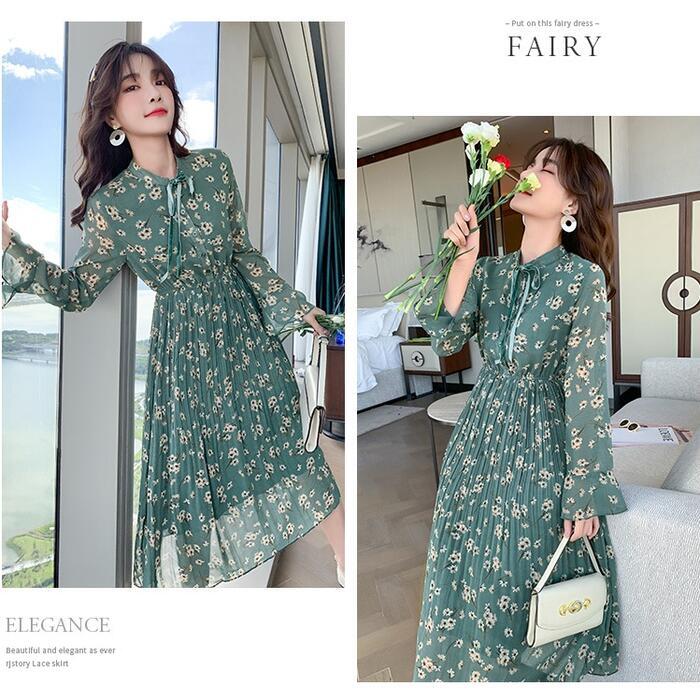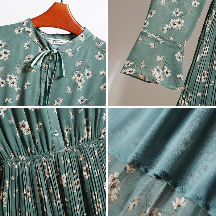 大きいサイズワンピース ロングワンピ 花柄 袖あり リボン ロング丈 レディース ワンピ ドレス ハイウエスト 大人可愛い Aライン きれいめ カジュアル フェミニン 透け感 フレアスリーブ クラシカル グリーン 緑 春 秋 冬 20代 30代 40代 50代