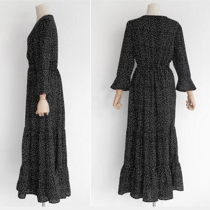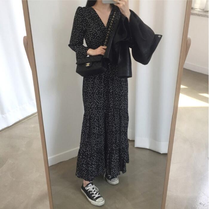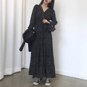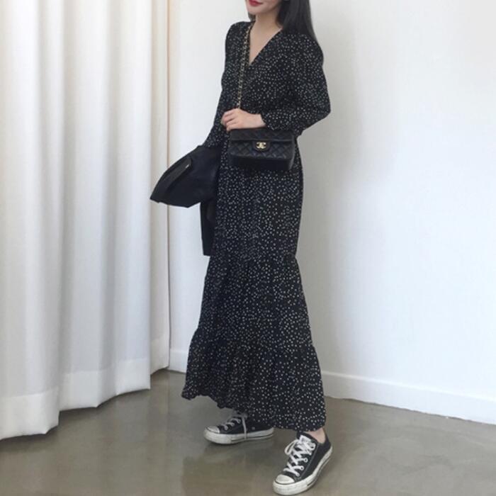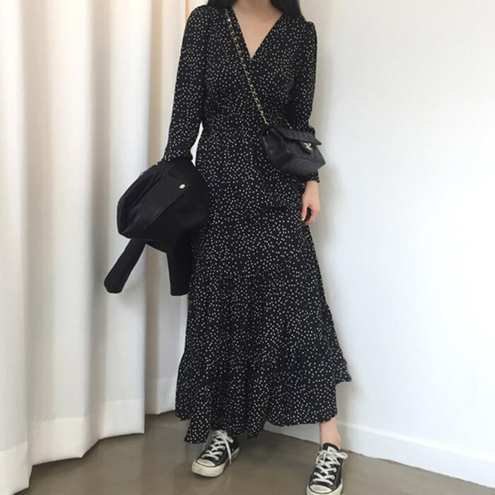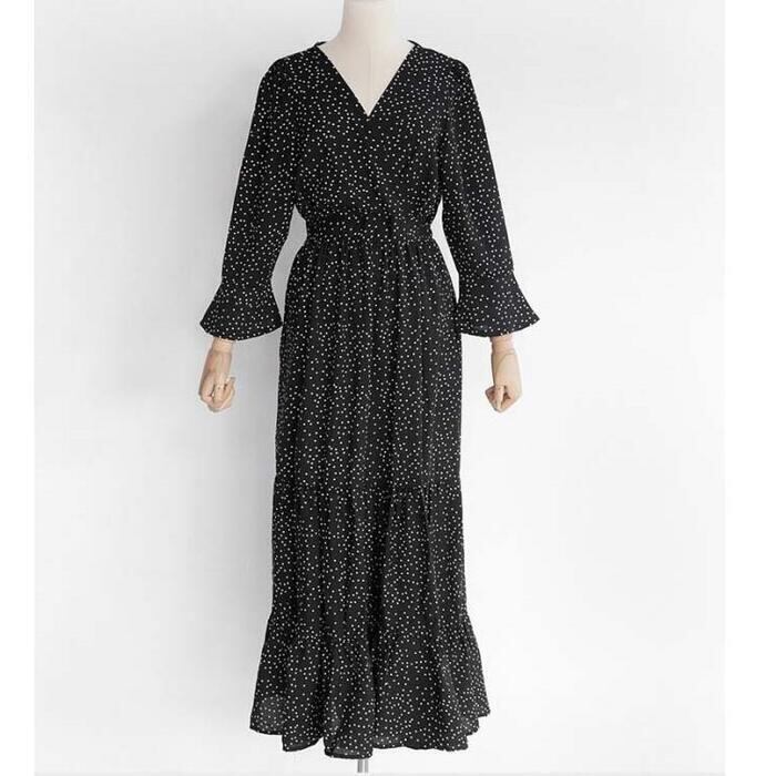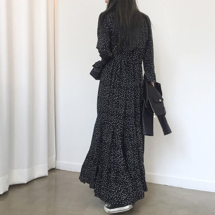 ティアード ワンピース ロングワンピ ドット柄 カシュクール 袖あり 長袖 ロング丈 レディース ワンピ ドレス ハイウエスト 大人可愛い ゆったり Vネック きれいめ カジュアル フェミニン ブラック 黒 春 秋 冬 20代 30代 40代 50代