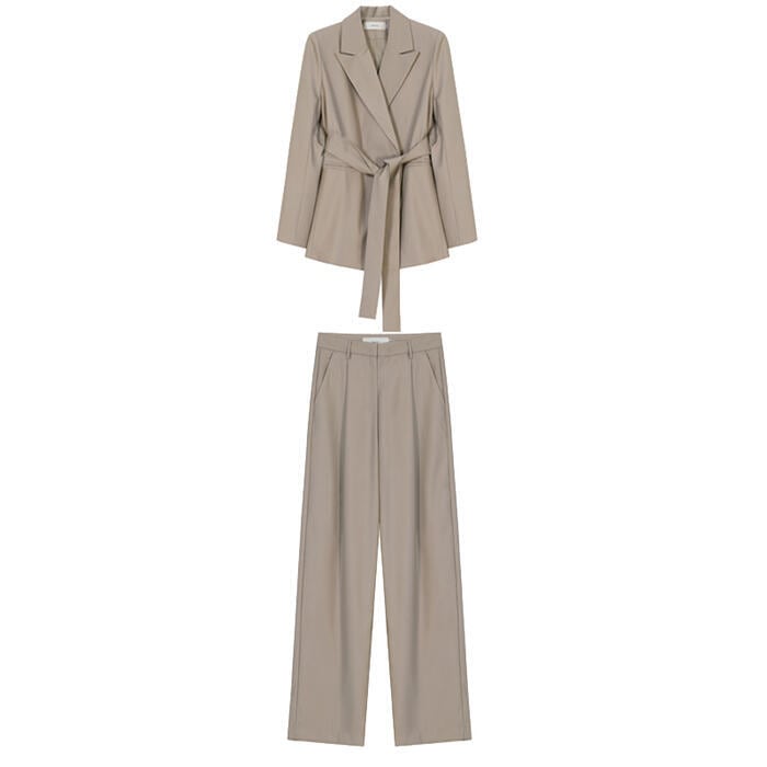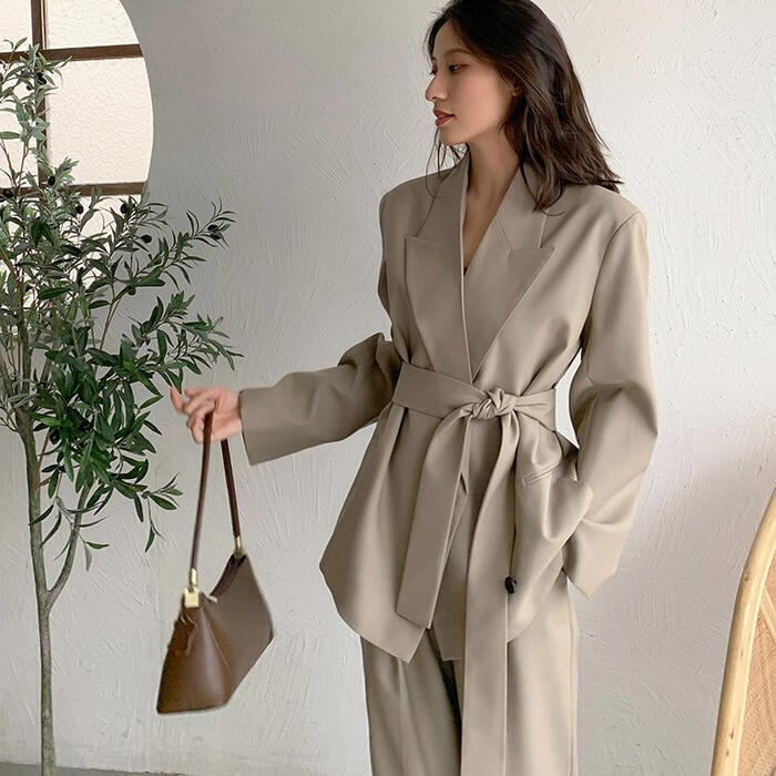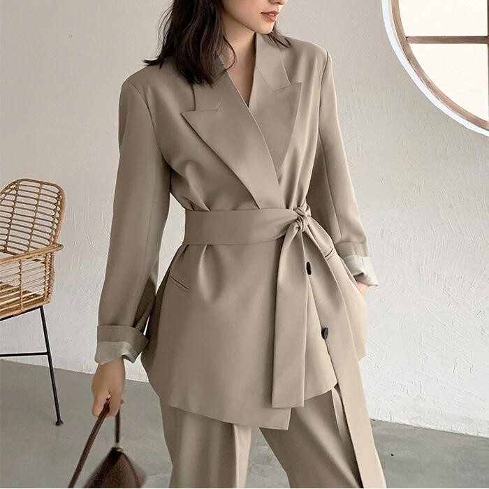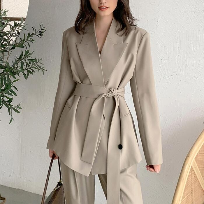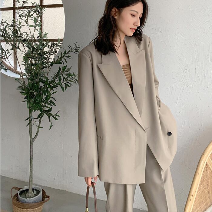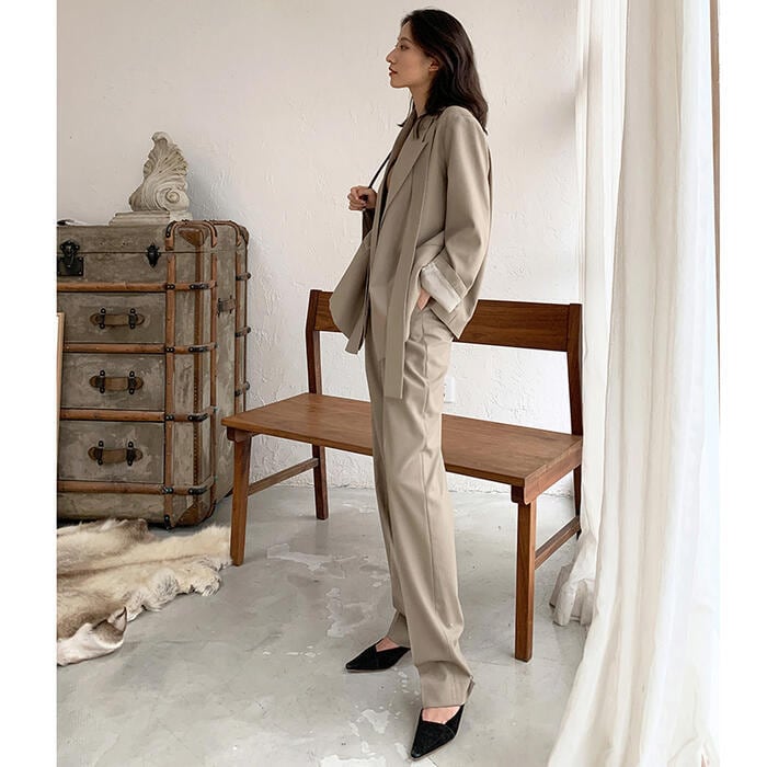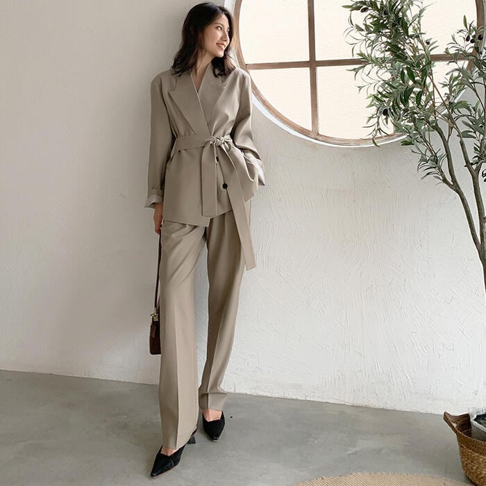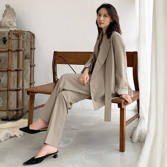 オーバーサイズのテーラードジャケットがトレンド感のあるパンツスーツ。