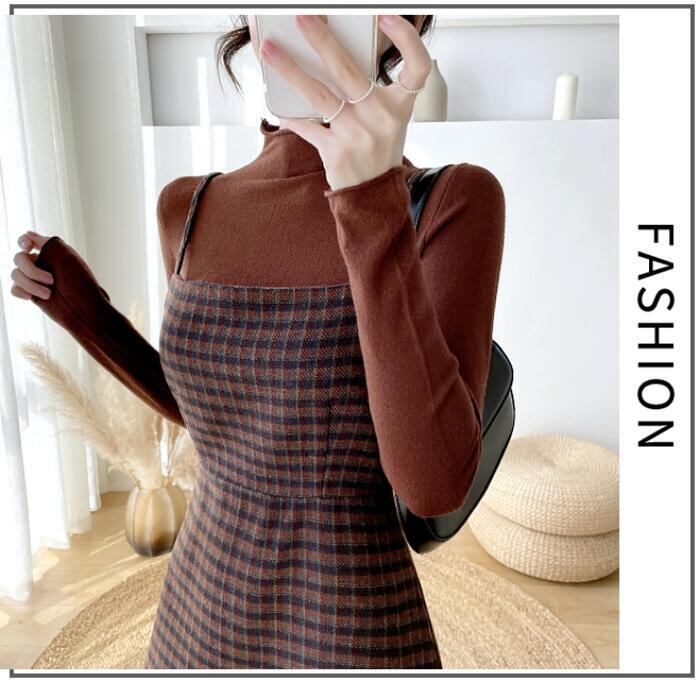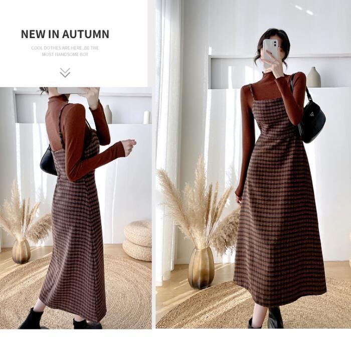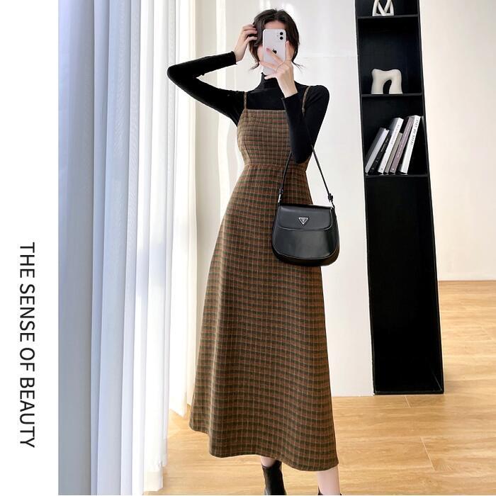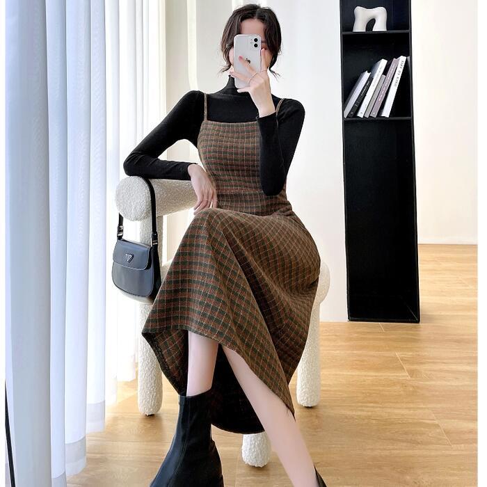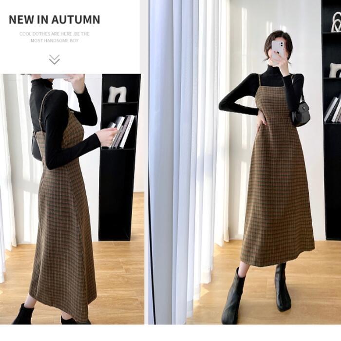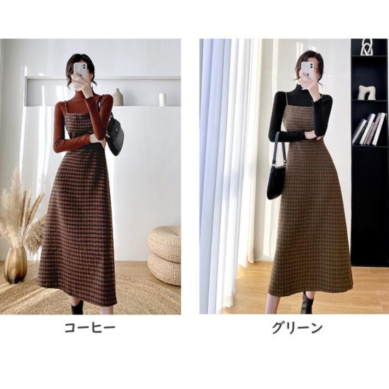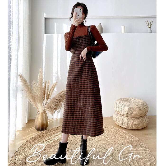 全2色 大きいサイズセットアップ 2点セット ジャンパースカート ワンピース トップス サロペットスカート ハイネック 長袖 ミモレ丈 チェック おしゃれ 大人可愛い きれいめ カジュアル フェミニン グリーン 緑 ブラウン 春 秋 冬 20代 30代 40代 50代
