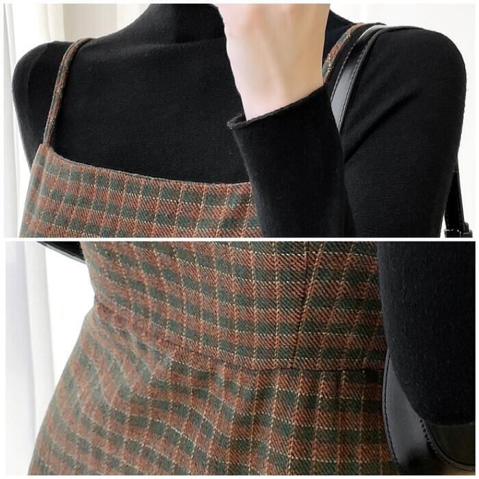 ハイネックのニットとキャミワンピのセットアップ。