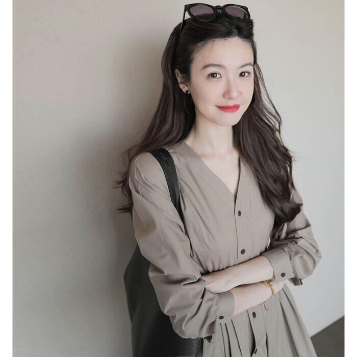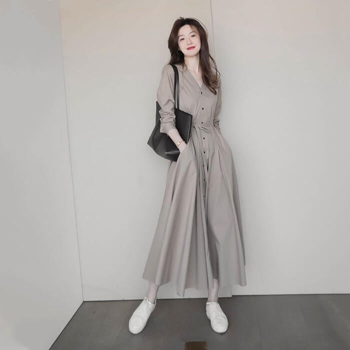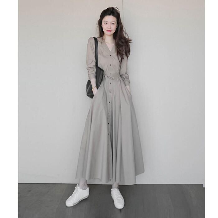 大きいサイズワンピース ロングワンピ シャツワンピ 袖あり 長袖 ロング丈 レディース ワンピ ドレス ウエストリボン 大人可愛い おしゃれ きれいめ カジュアル フェミニン Vネック ハイウエスト グレー 春 秋 冬 20代 30代 40代 50代