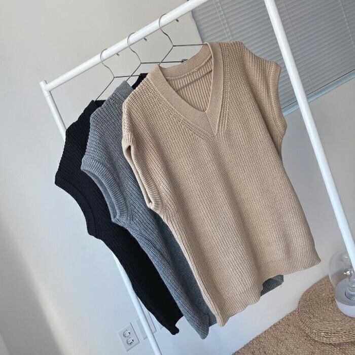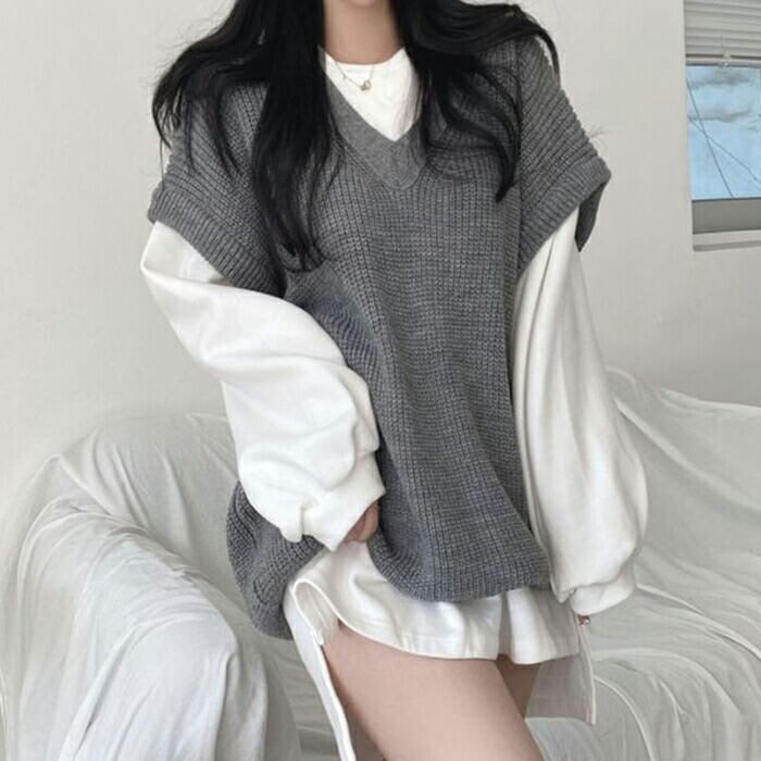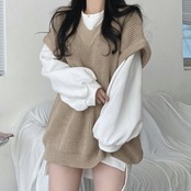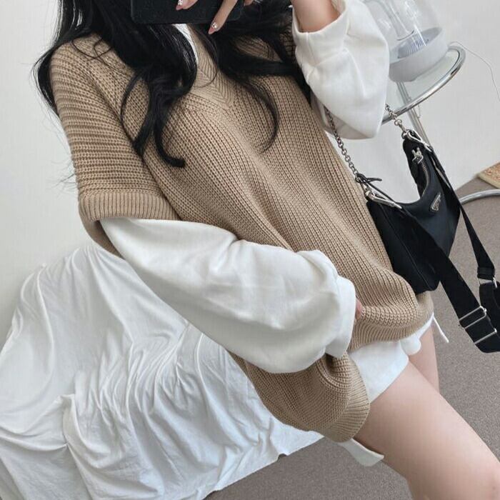 ラウンドネック長袖セーター+ルーズニットベストのツーピース