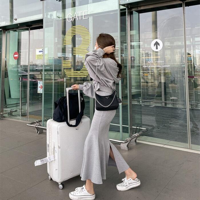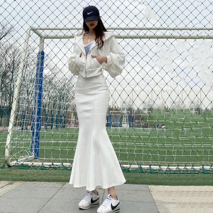 スポーティカジュアルなアイテムもマーメイドシルエットで女性らしく着こなせます。