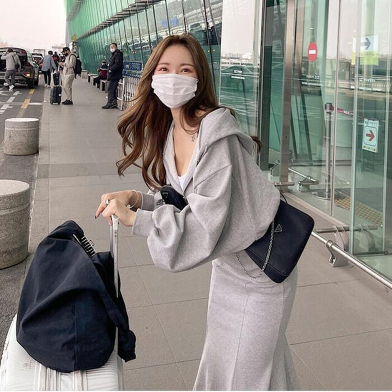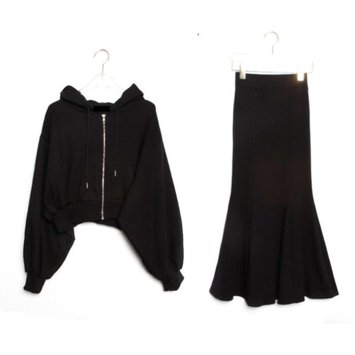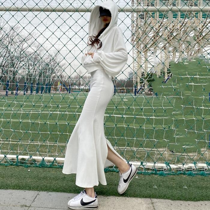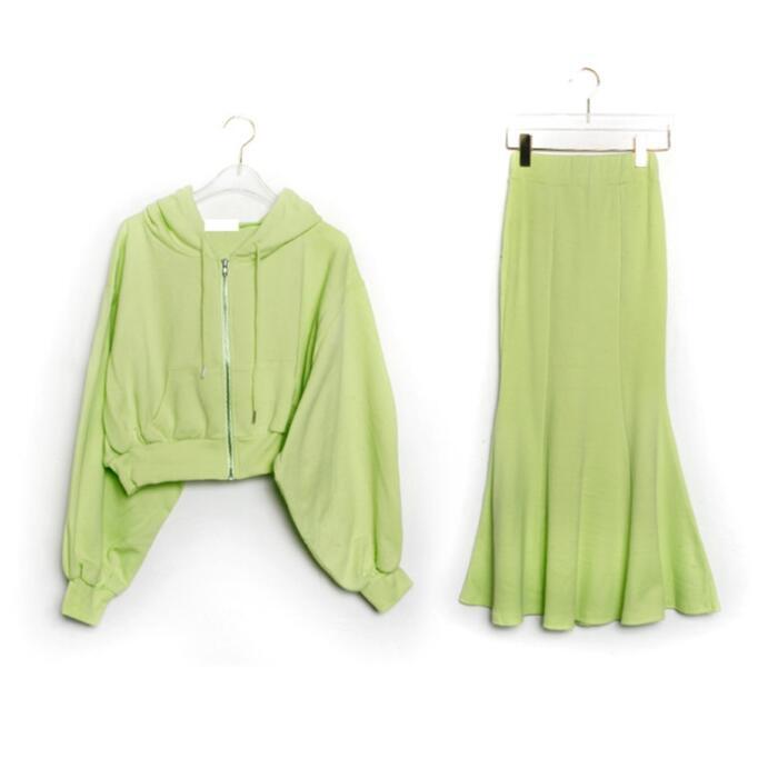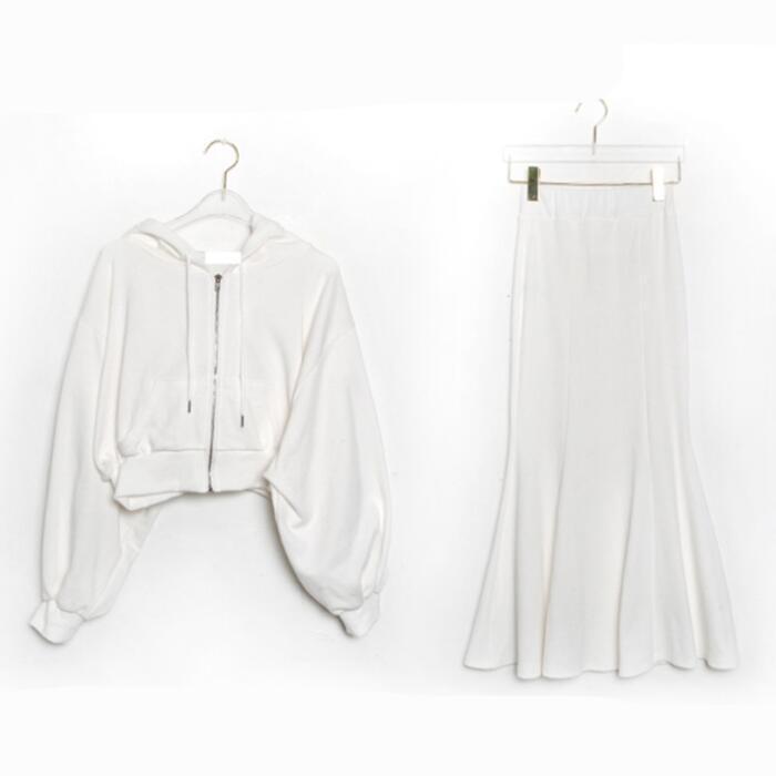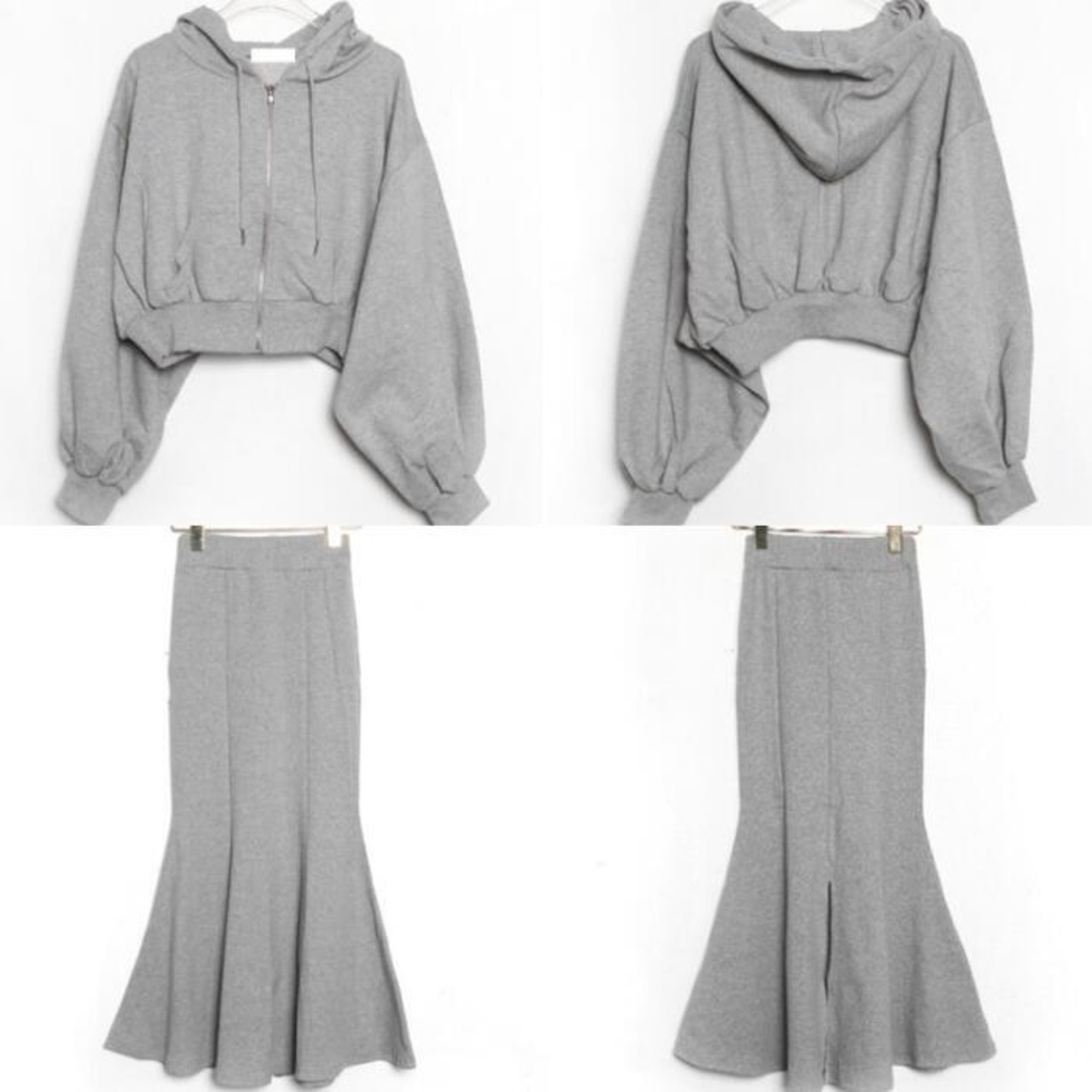 全4色 フェミニン セットアップ 2点セット トップス ショート丈 パーカー スカート マーメイド ロング丈 長袖 パフスリーブ おしゃれ 大人可愛い スポーティ カジュアル シンプル グレー ホワイト 白 ブラック 黒 グリーン 緑 春 秋 冬 20代 30代 40代 50代