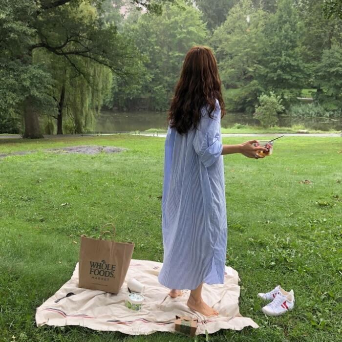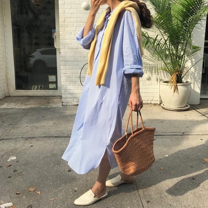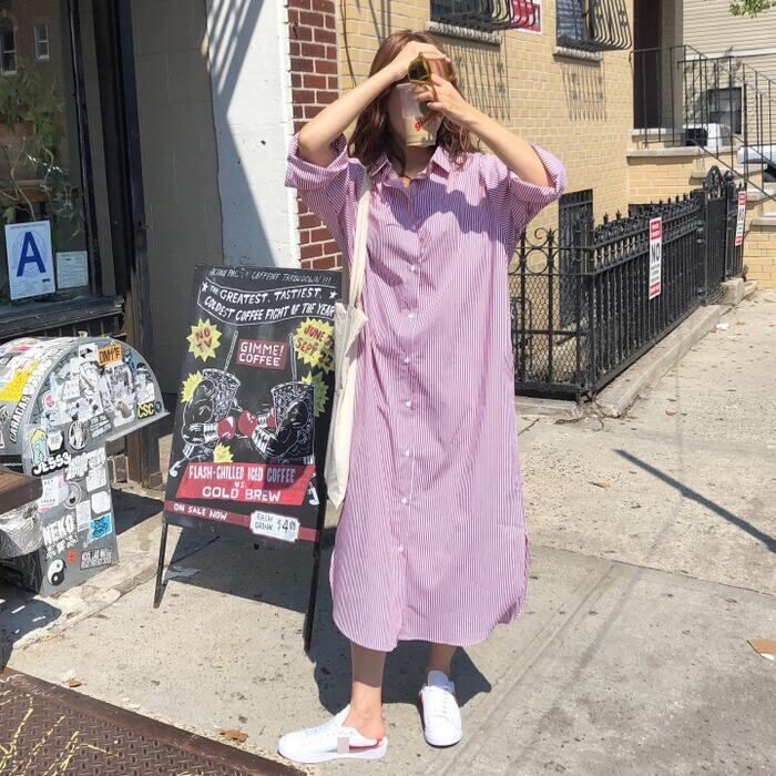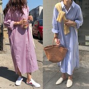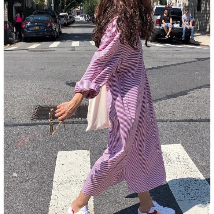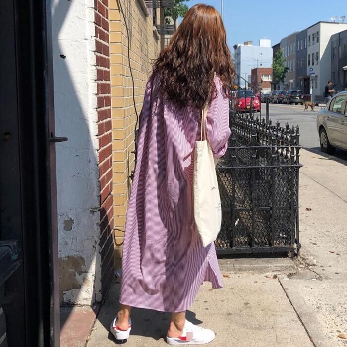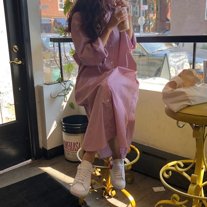 全2色 大きいサイズワンピース ロングワンピ シャツワンピ 袖あり 長袖 ロング丈 ストライプ レディース ワンピ ドレス 大人可愛い おしゃれ カジュアル フェミニン ゆったり オーバーサイズ 体型カバー レッド 赤 ブルー 青 春 秋 夏 20代 30代 40代 50代