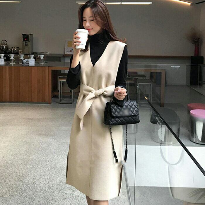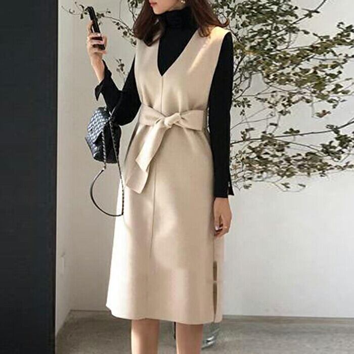 ワンピース ミディ丈 レディース ワンピ ドレス ノースリーブ スリム フィット きれいめ Vネック 二次会 フォーマル セレモニー エレガント フェミニン お呼ばれ ウール ウール混 アプリコット 春 夏 秋 20代 30代 40代 50代