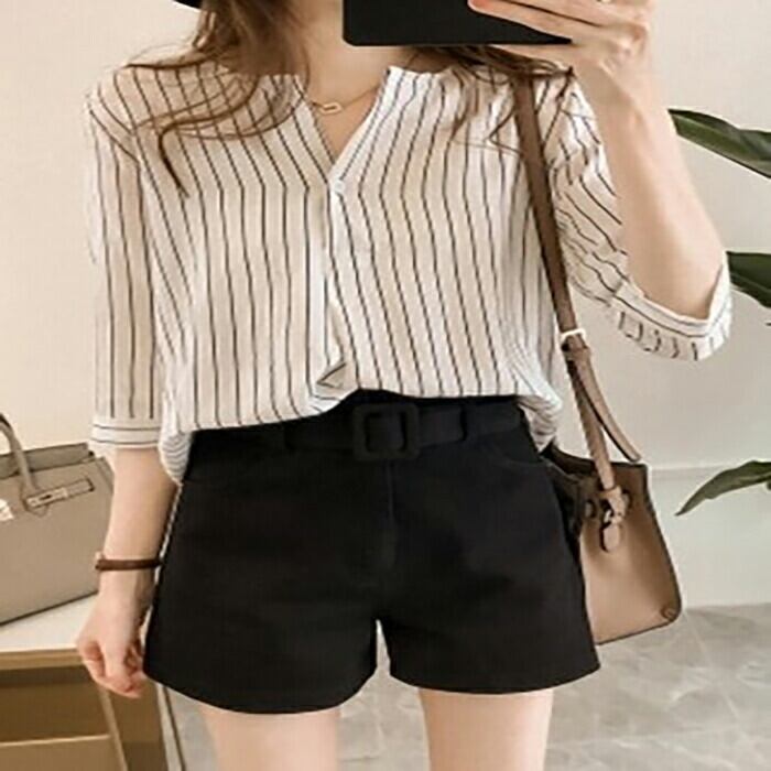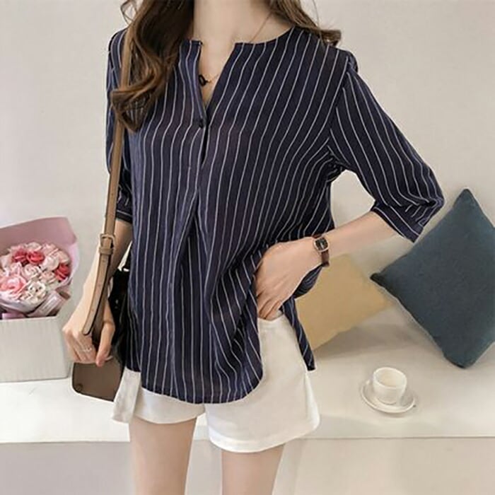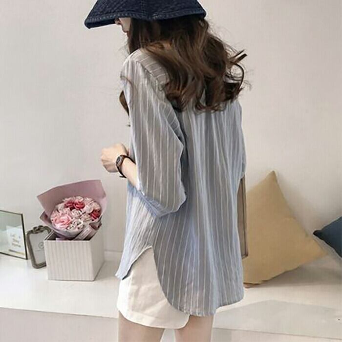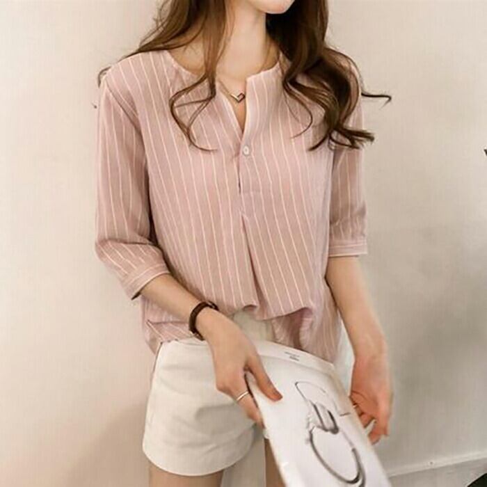 全4色 トップス Tシャツ カットソー 7分袖 レディース きれいめ カジュアル おしゃれ フェミニン 大人可愛い シンプル ベーシック ストライプ スリム ライトブルー ネイビー ピンク ホワイト 白 春 夏 秋 20代 30代 40代 50代