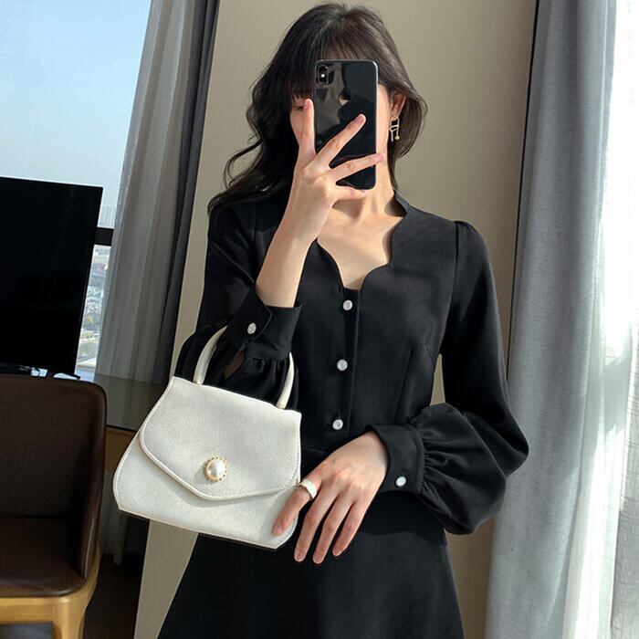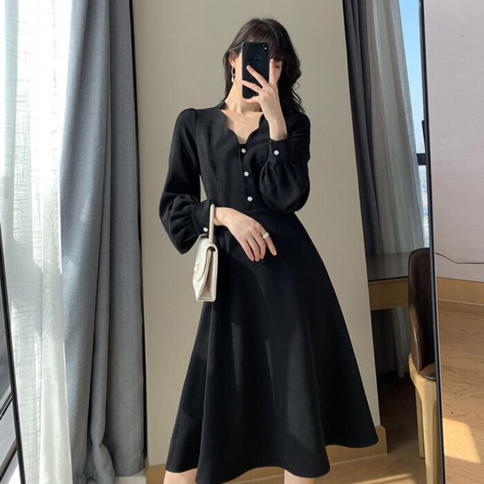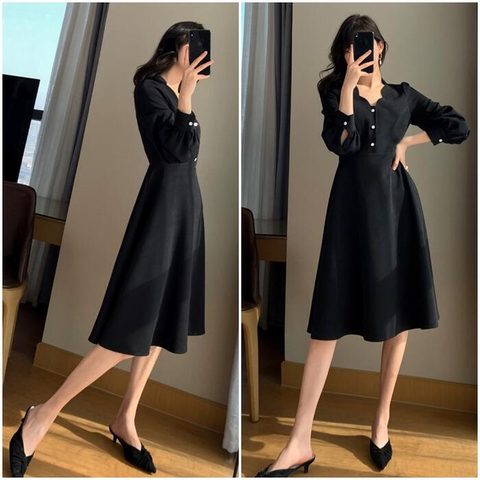 大きいサイズワンピース 袖あり ロングワンピ ミモレ丈 スカラップネック レディース ワンピ ドレス 長袖 きれいめ 大人可愛い ハイウエスト 切り替え カジュアル フェミニン ブラック オフィス お呼ばれ 黒 春 秋 夏 冬 20代 30代 40代 50代