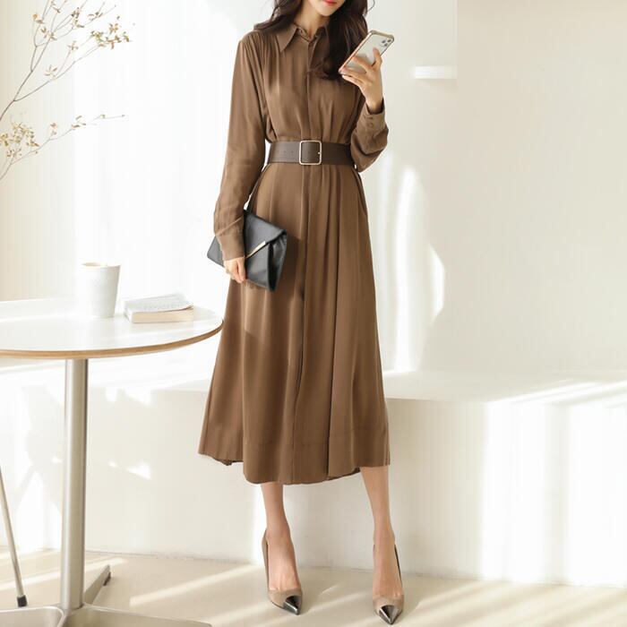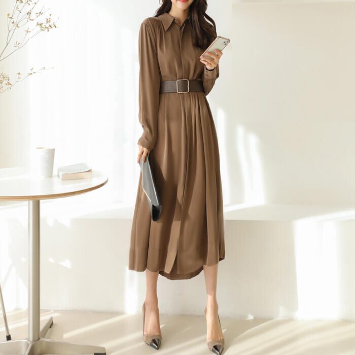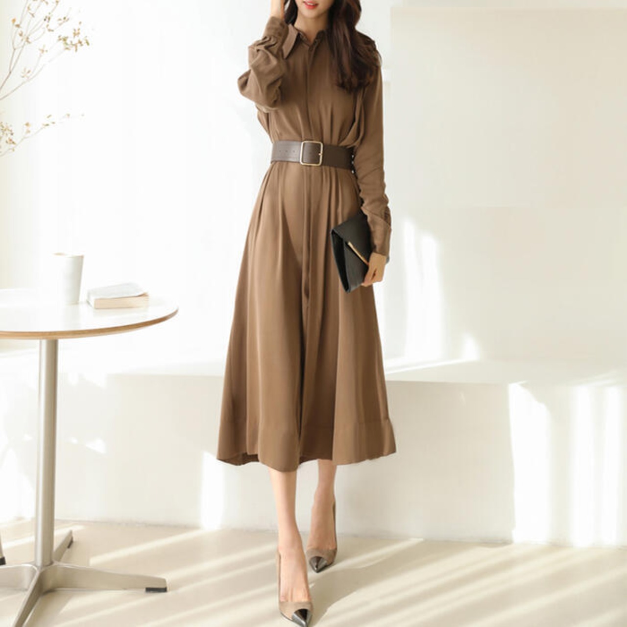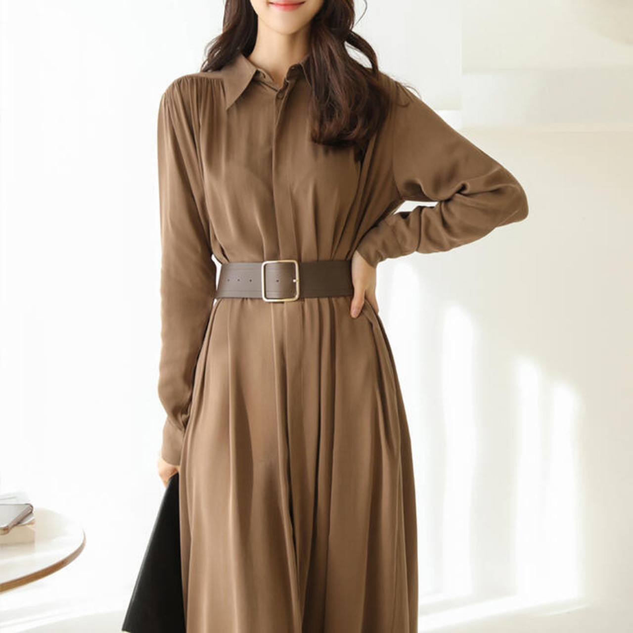 大きいサイズワンピース ロングワンピ ミモレ丈 長袖 シャツワンピ レディース ワンピ ドレス 大人可愛い きれいめ カジュアル ウエストベルト ハイウエスト お呼ばれ フェミニン オフィス エレガント ブラウン 春 秋 冬 20代 30代 40代 50代
