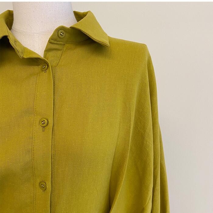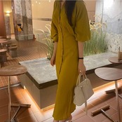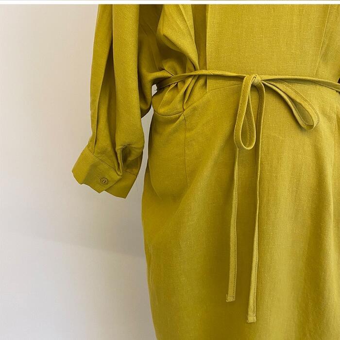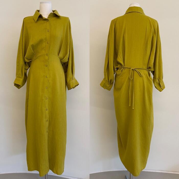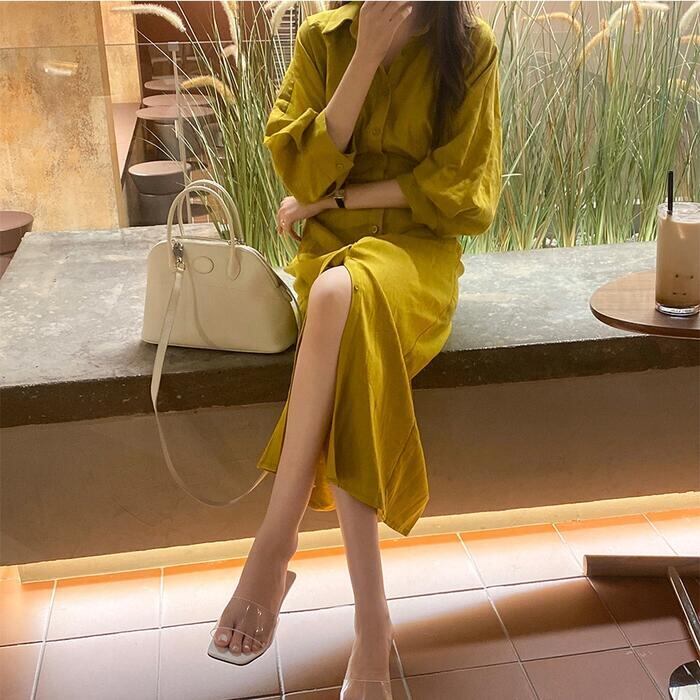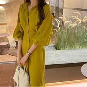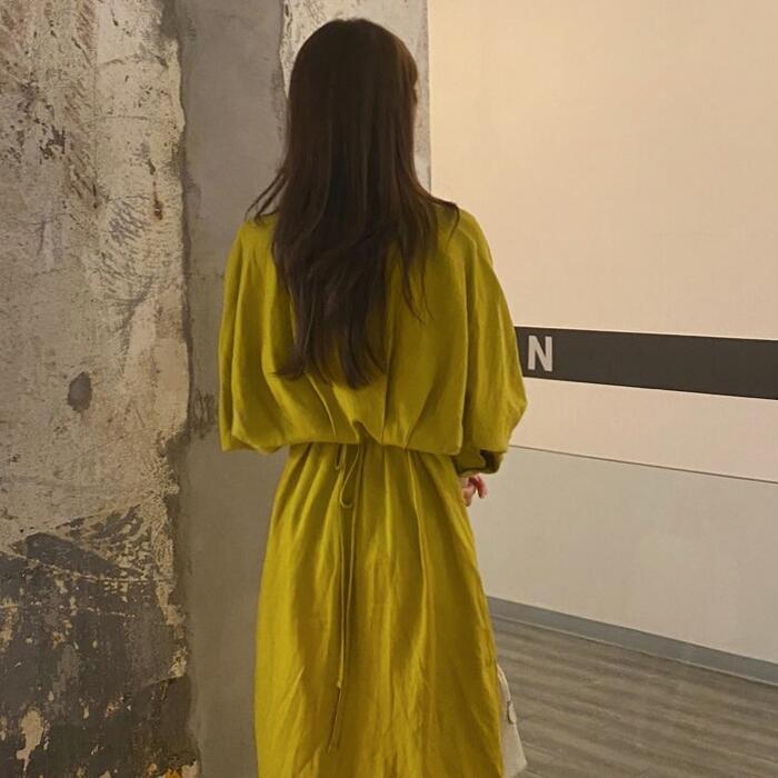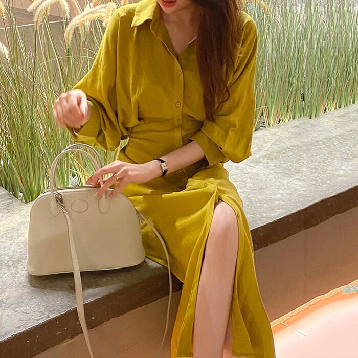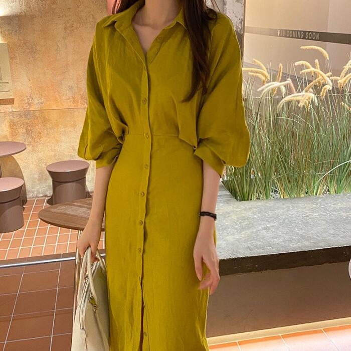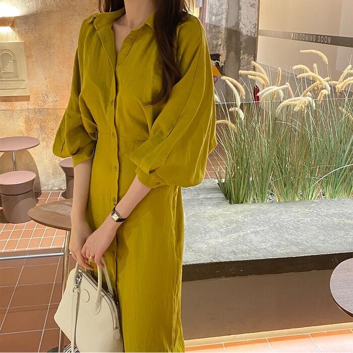 ワンピース 袖あり ロングワンピ ロング丈 シャツワンピース パフスリーブ レディース ワンピ ドレス 七分袖 きれいめ 大人可愛い ハイウエスト ウエストリボン カジュアル フェミニン おしゃれ お呼ばれ イエロー 春 秋 夏 20代 30代 40代 50代