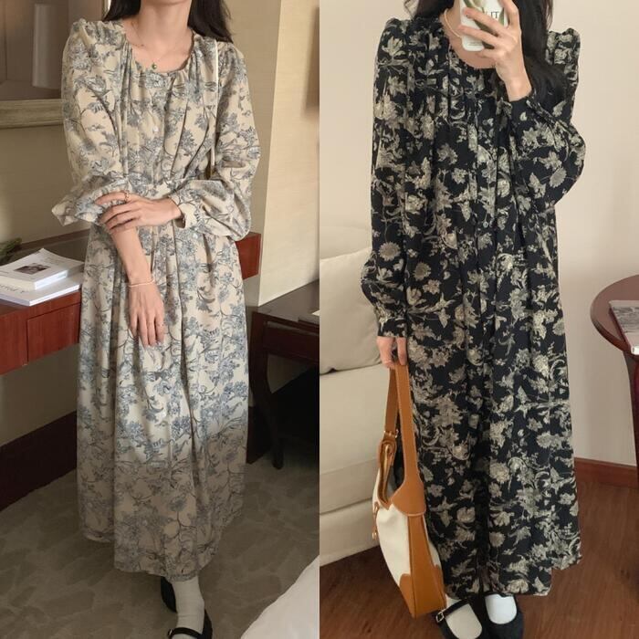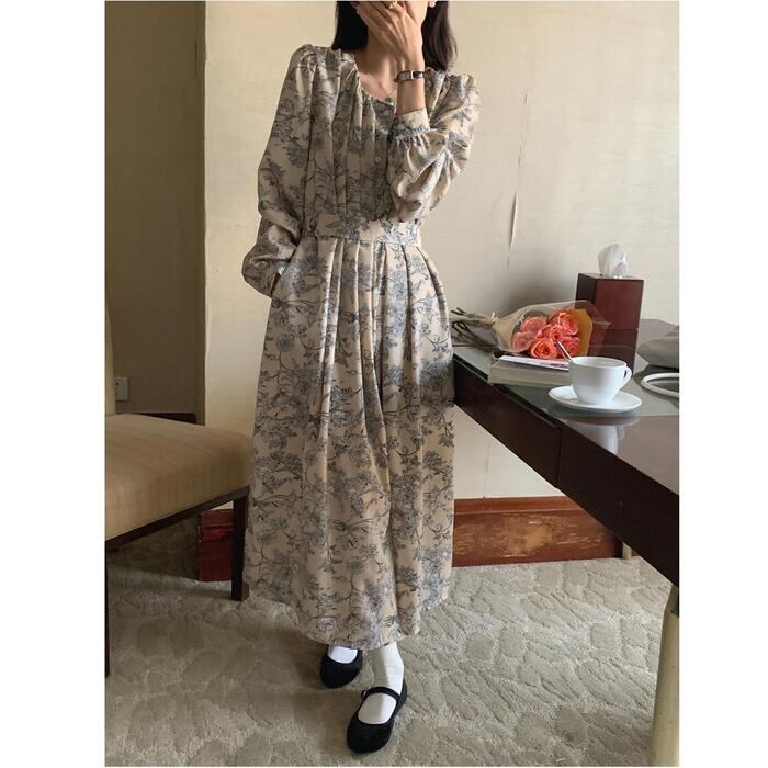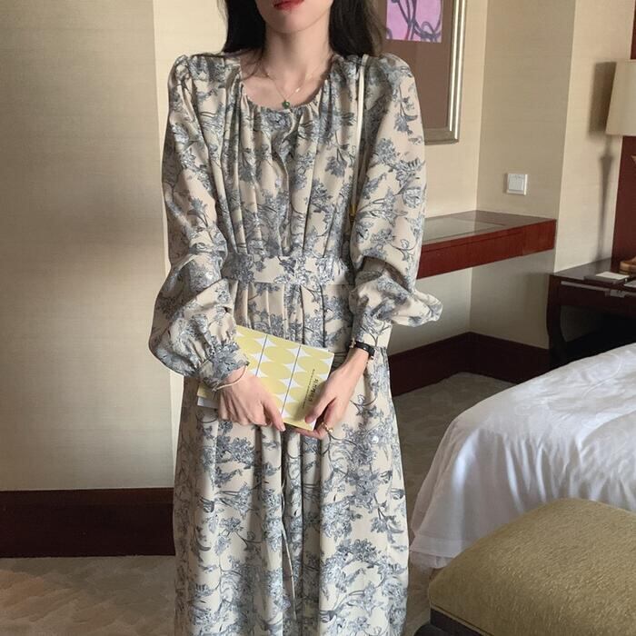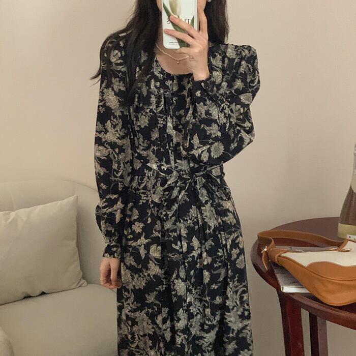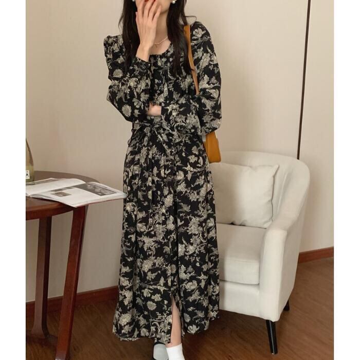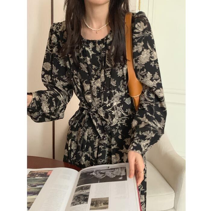 全2色 ワンピース 袖あり ロングワンピ ミモレ丈 レディース ワンピ ドレス 長袖 ボタニカル 花柄 きれいめ 大人可愛い ウエストリボン シフォン カジュアル フェミニン ゆったり おしゃれ ベージュ ブラック 黒 春 秋 冬 20代 30代 40代 50代