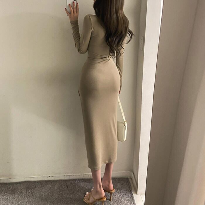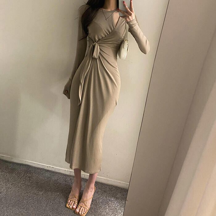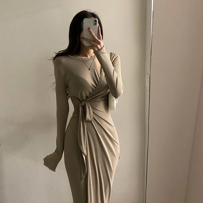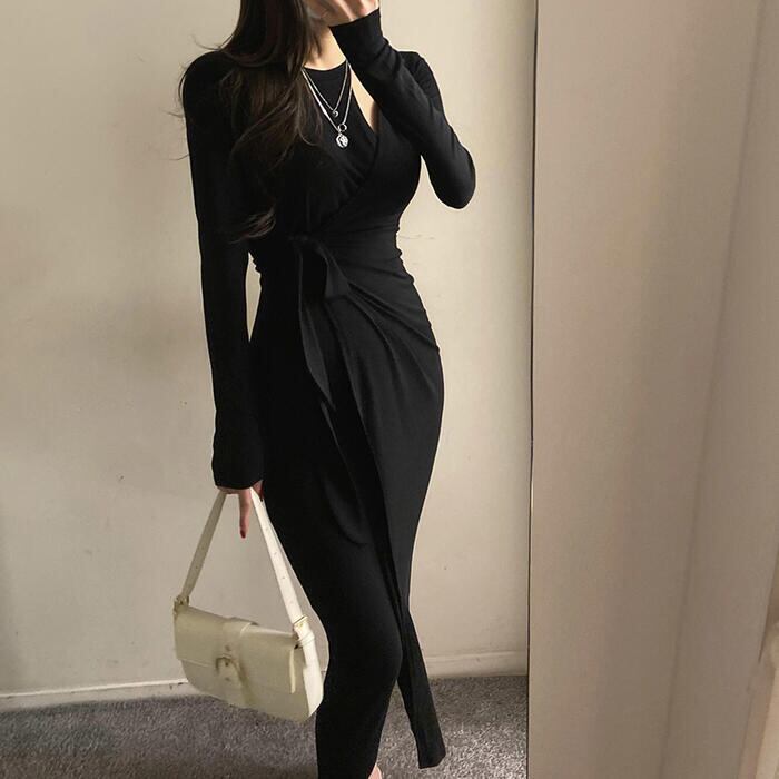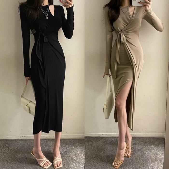 全2色 ワンピース 袖あり ロングワンピ ミモレ丈 レディース ワンピ ドレス 長袖 ラップ カシュクール きれいめ 大人可愛い ウエストリボン タイト カジュアル フェミニン スリム おしゃれ カーキ ブラック 黒 春 秋 冬 20代 30代 40代 50代
